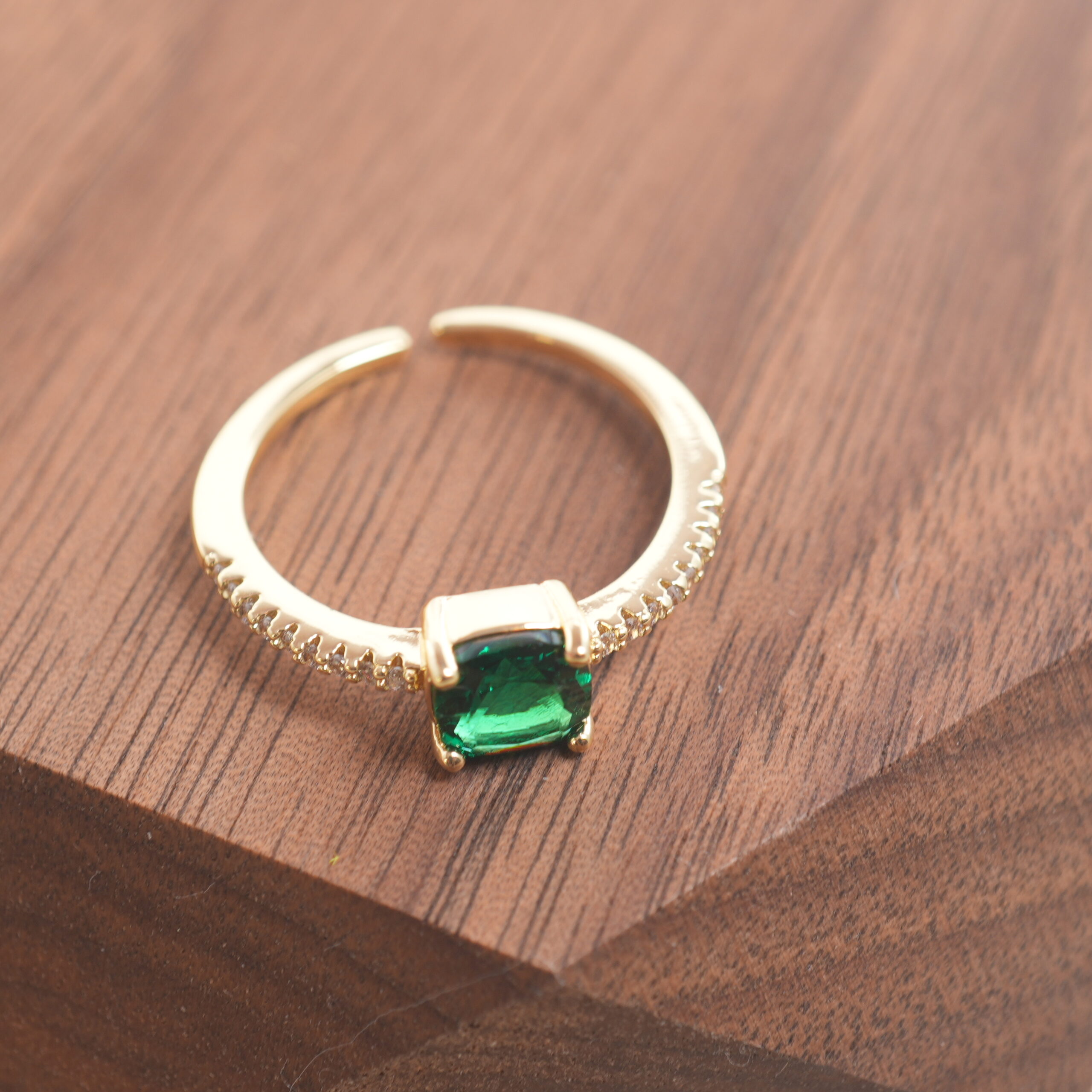 - Elegant emerald ring with an open, adjustable band for comfort and style