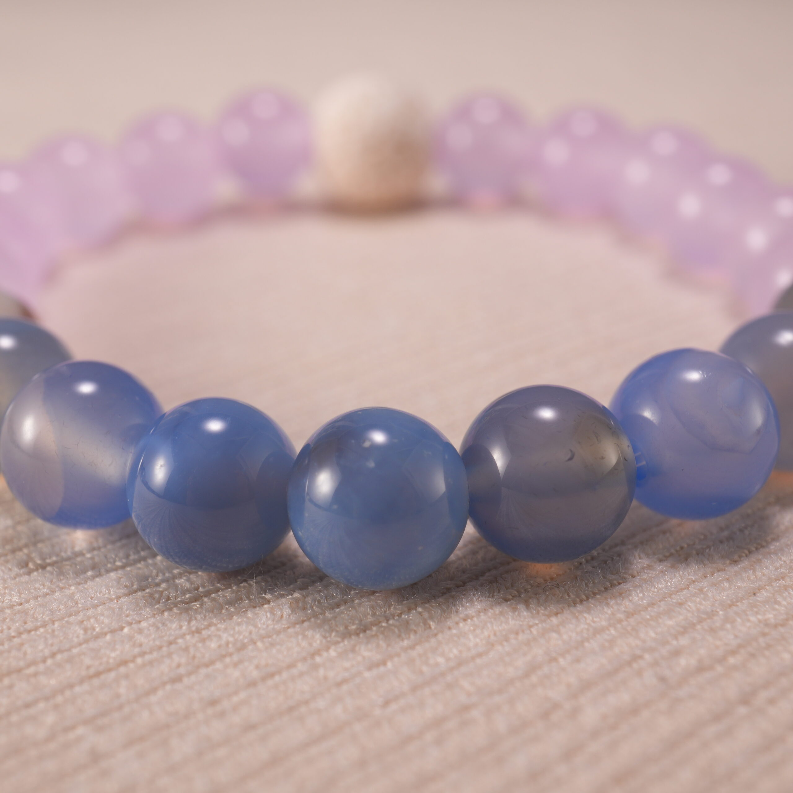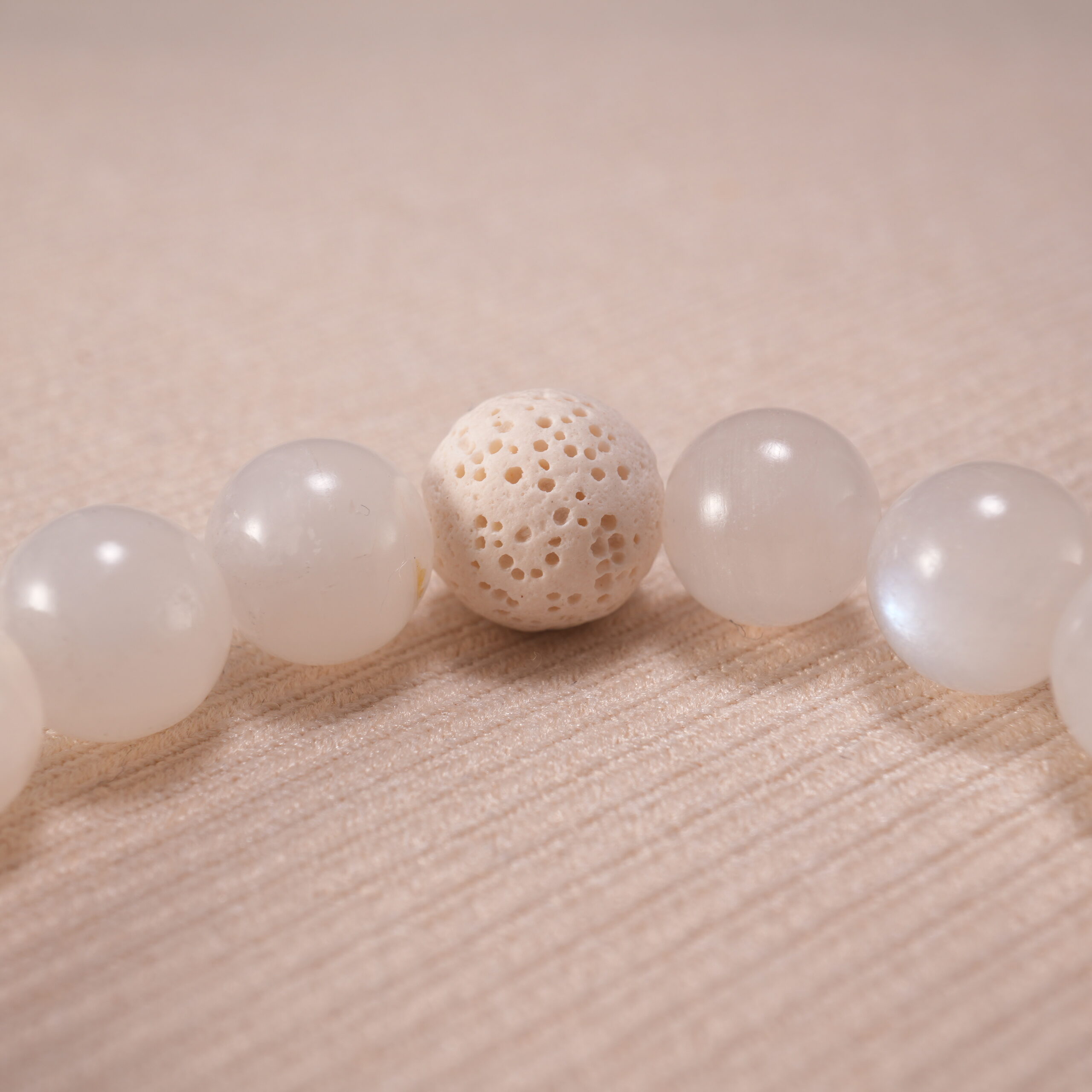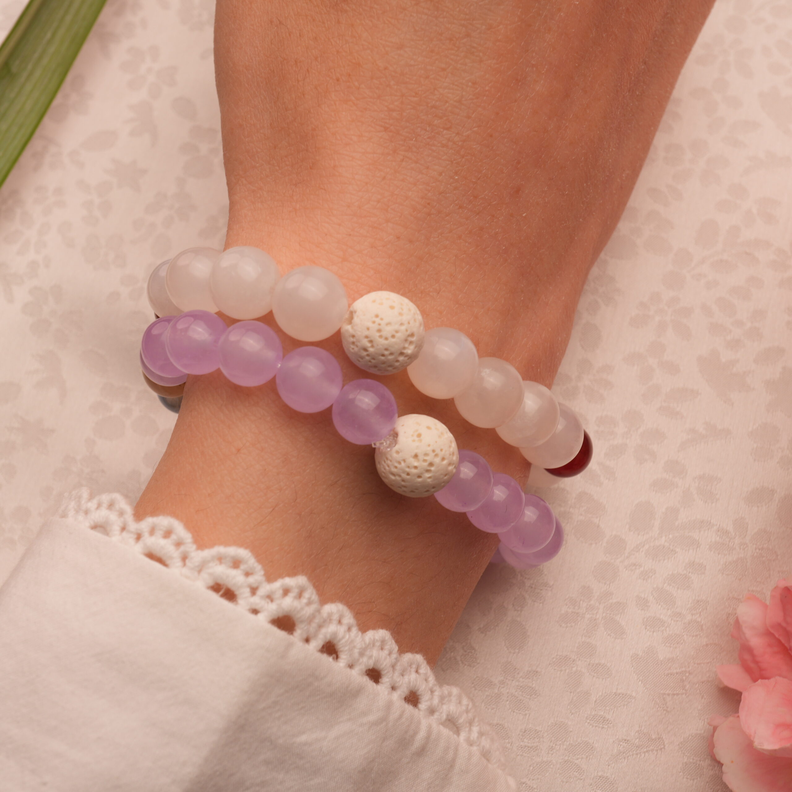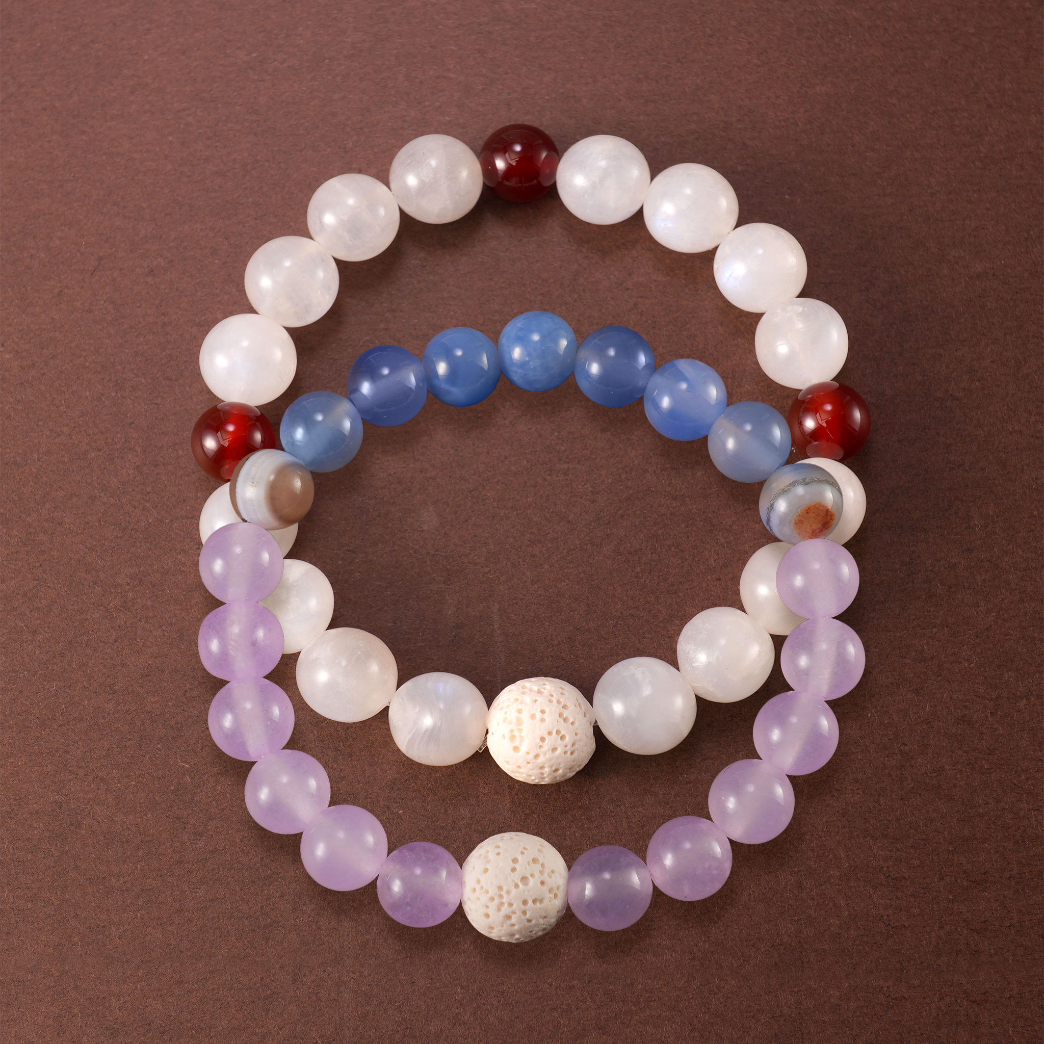 - Sleep-focused crystal bracelet stack with amethyst, moonstone, and lava stone