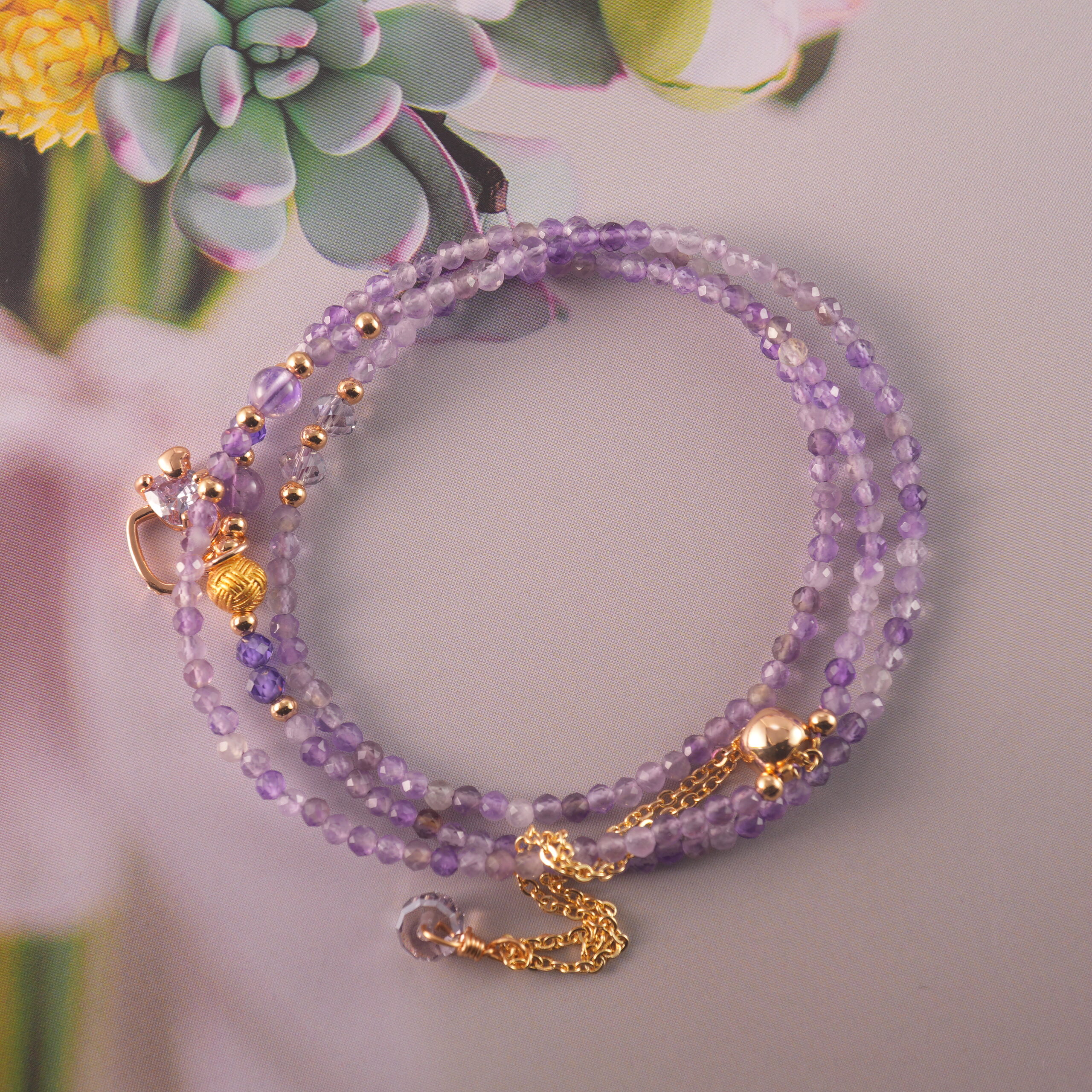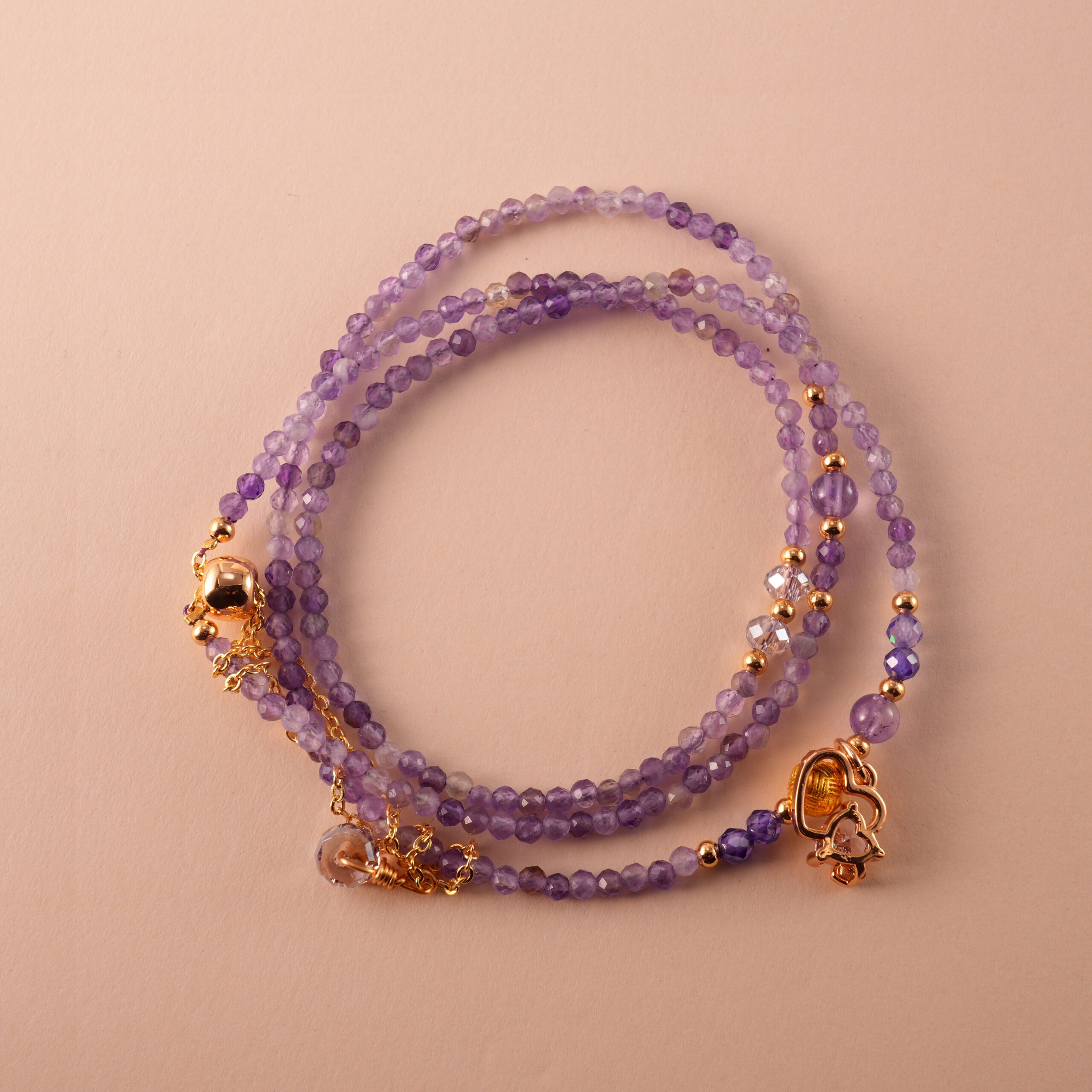 Handmade with natural amethyst beads, this calming wrap bracelet promotes restful sleep and emotional balance. Wear it as a triple-wrap bracelet or a soft purple necklace.