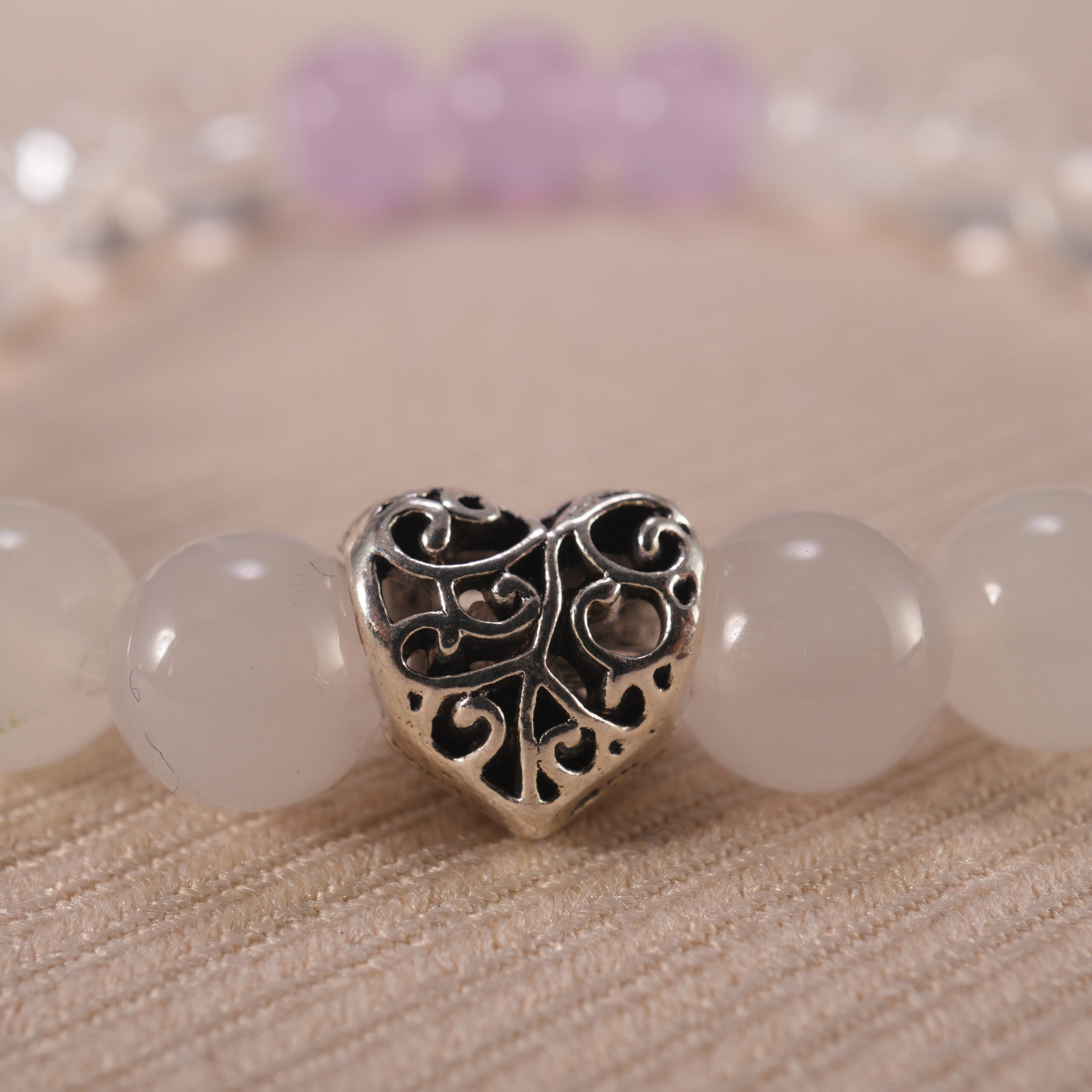 - Multi-gemstone bracelet stack featuring amethyst, rose quartz, amazonite, and clear quartz