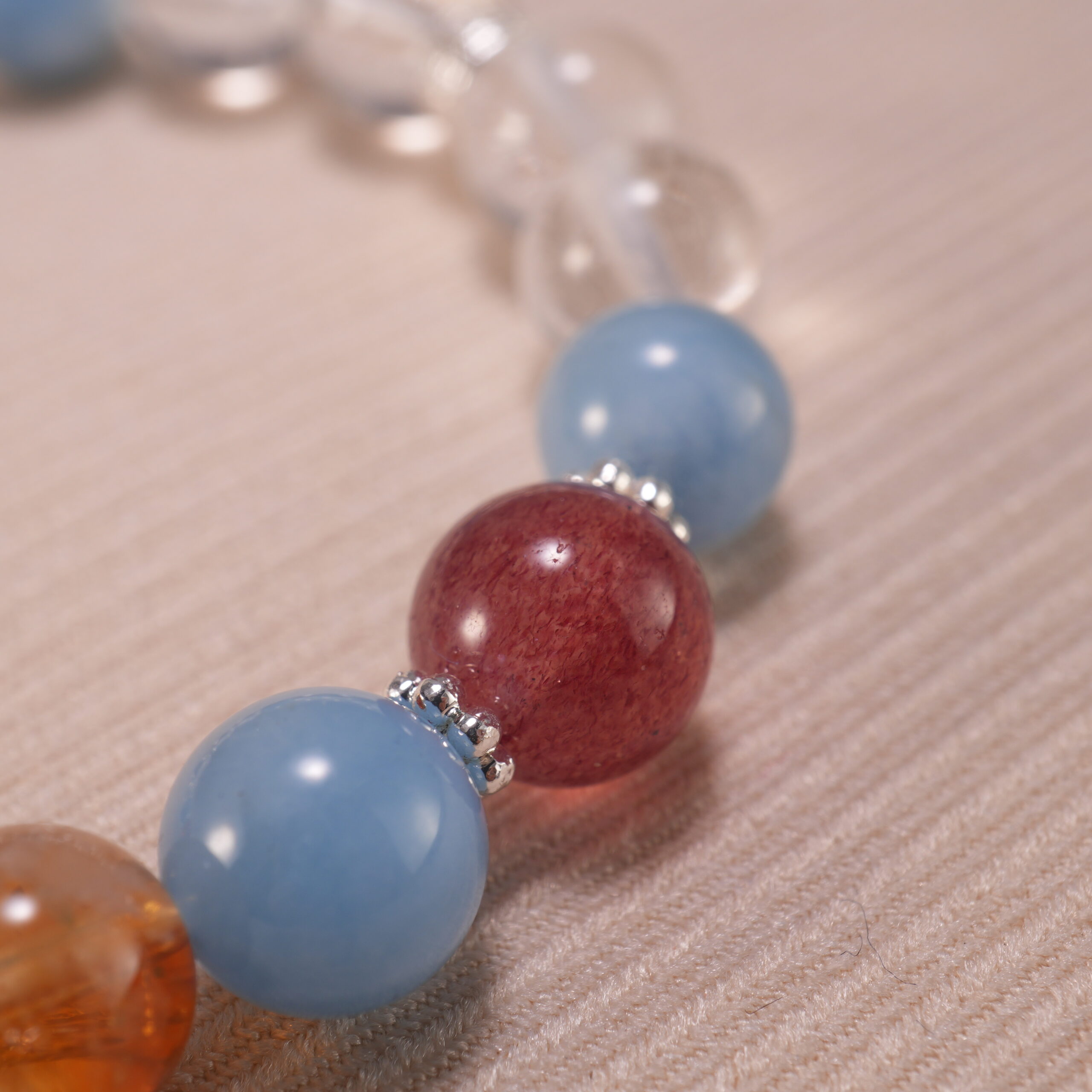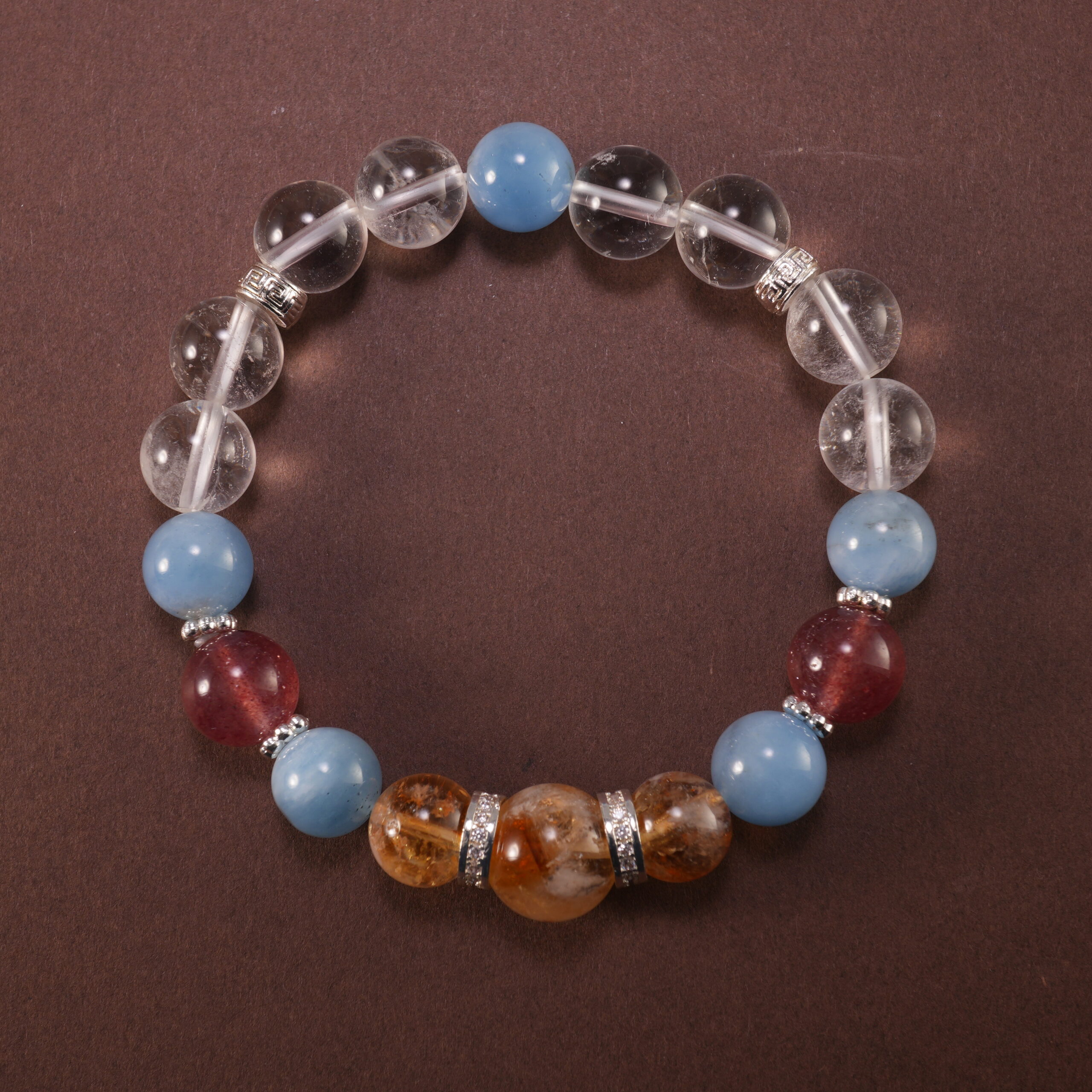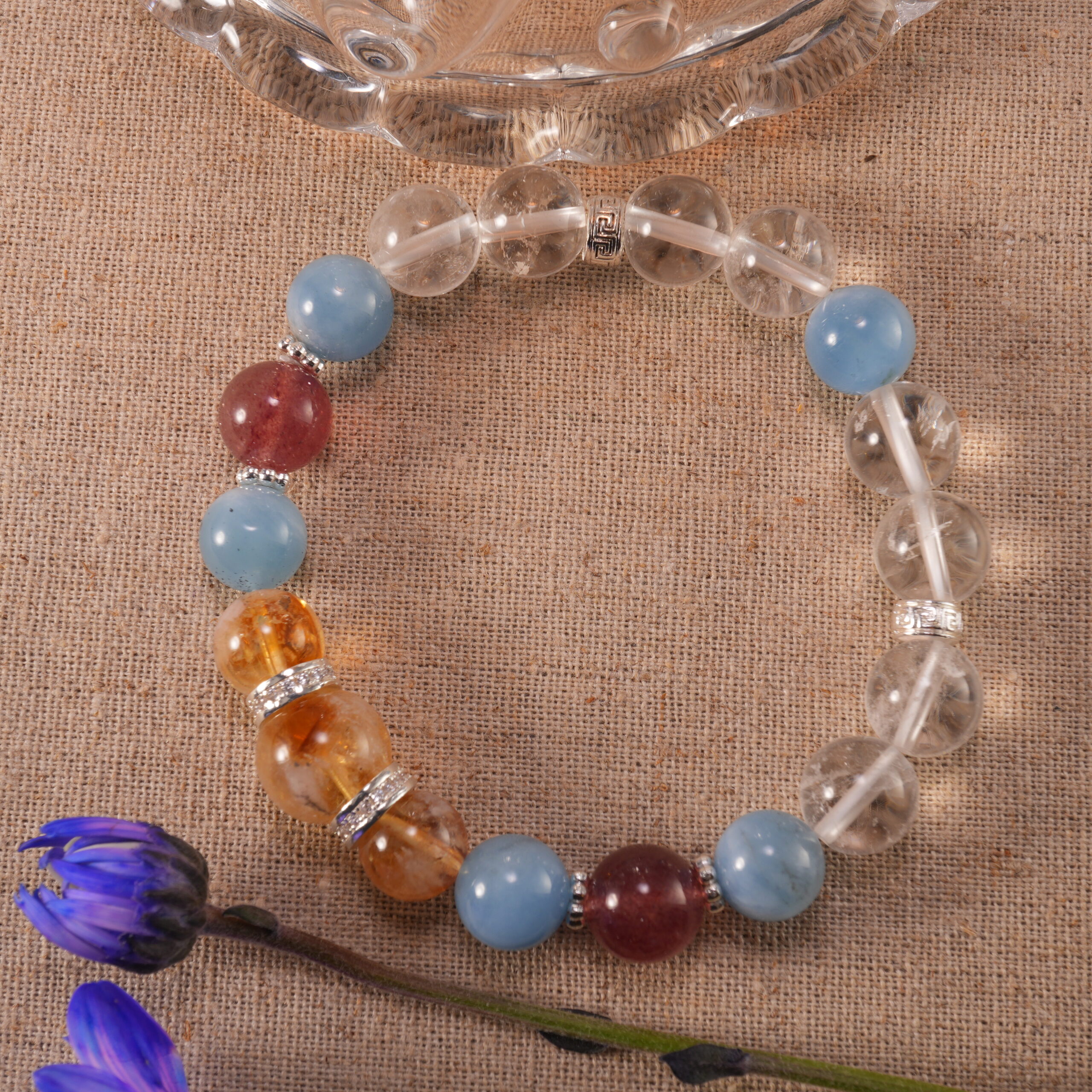 This vibrant multi-stone bracelet blends aquamarine, citrine, clear quartz, and strawberry quartz to enhance joy, emotional clarity, and energetic flow—a radiant daily companion for balance and light.