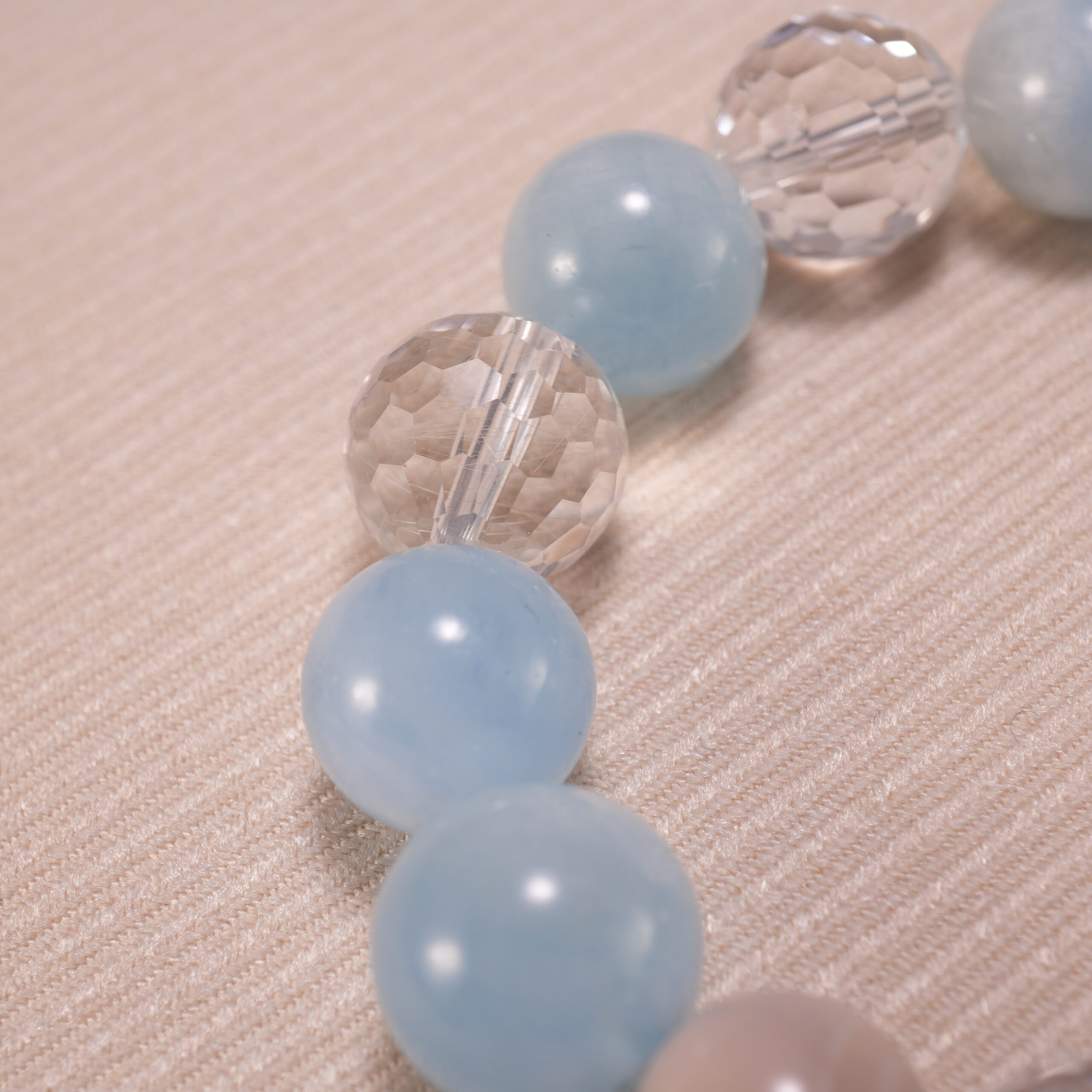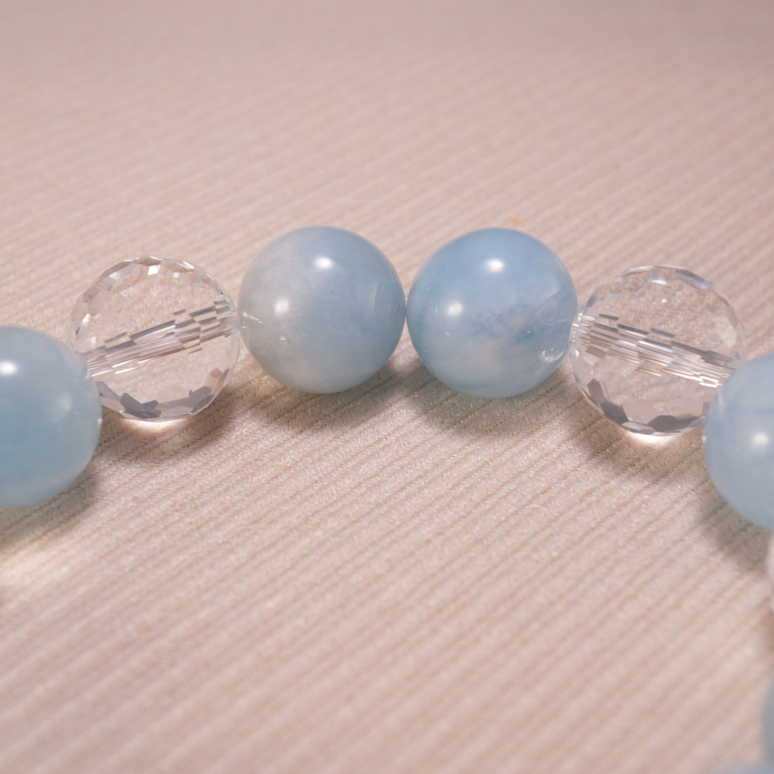 - Authentic aquamarine and clear quartz beads for clear communication and emotional calm