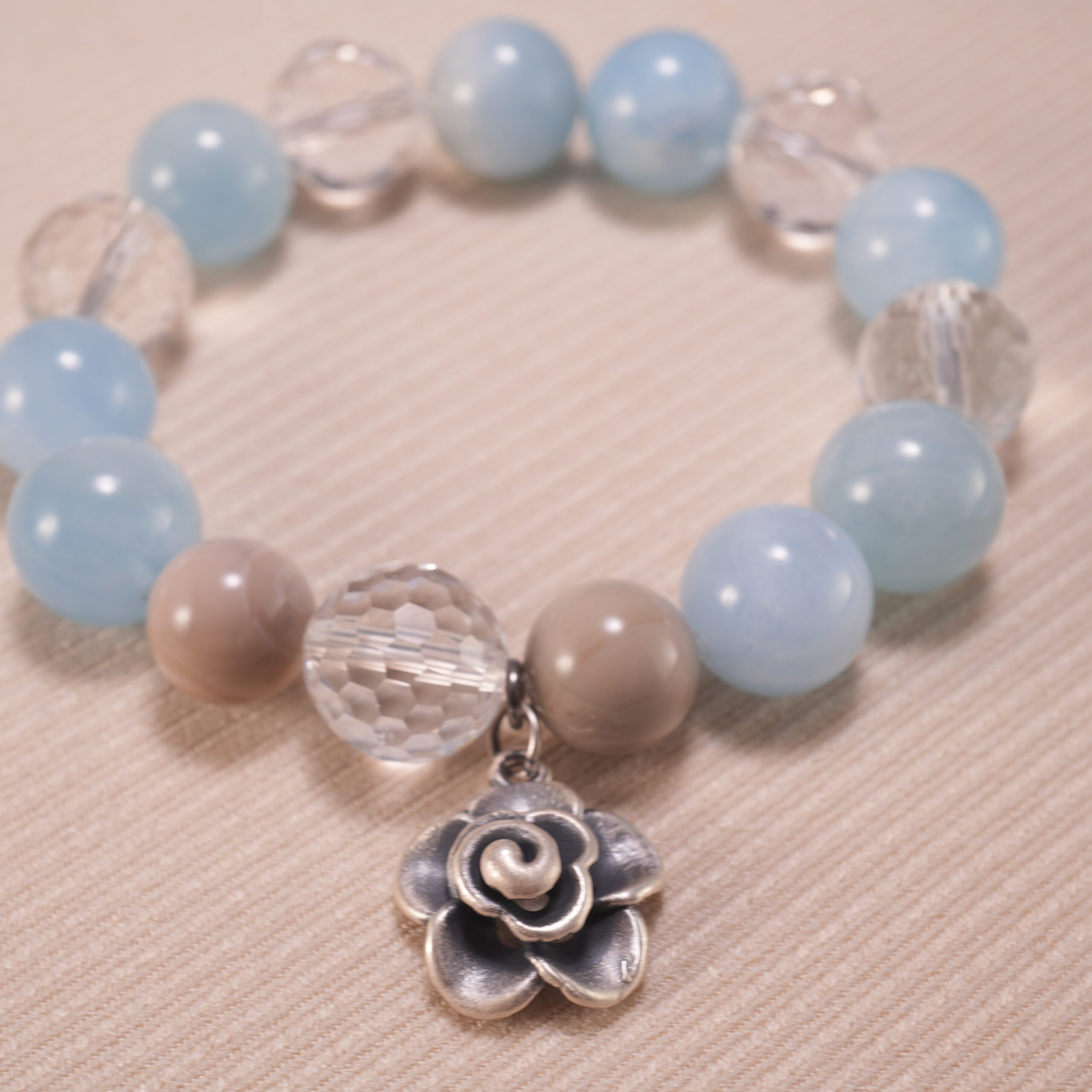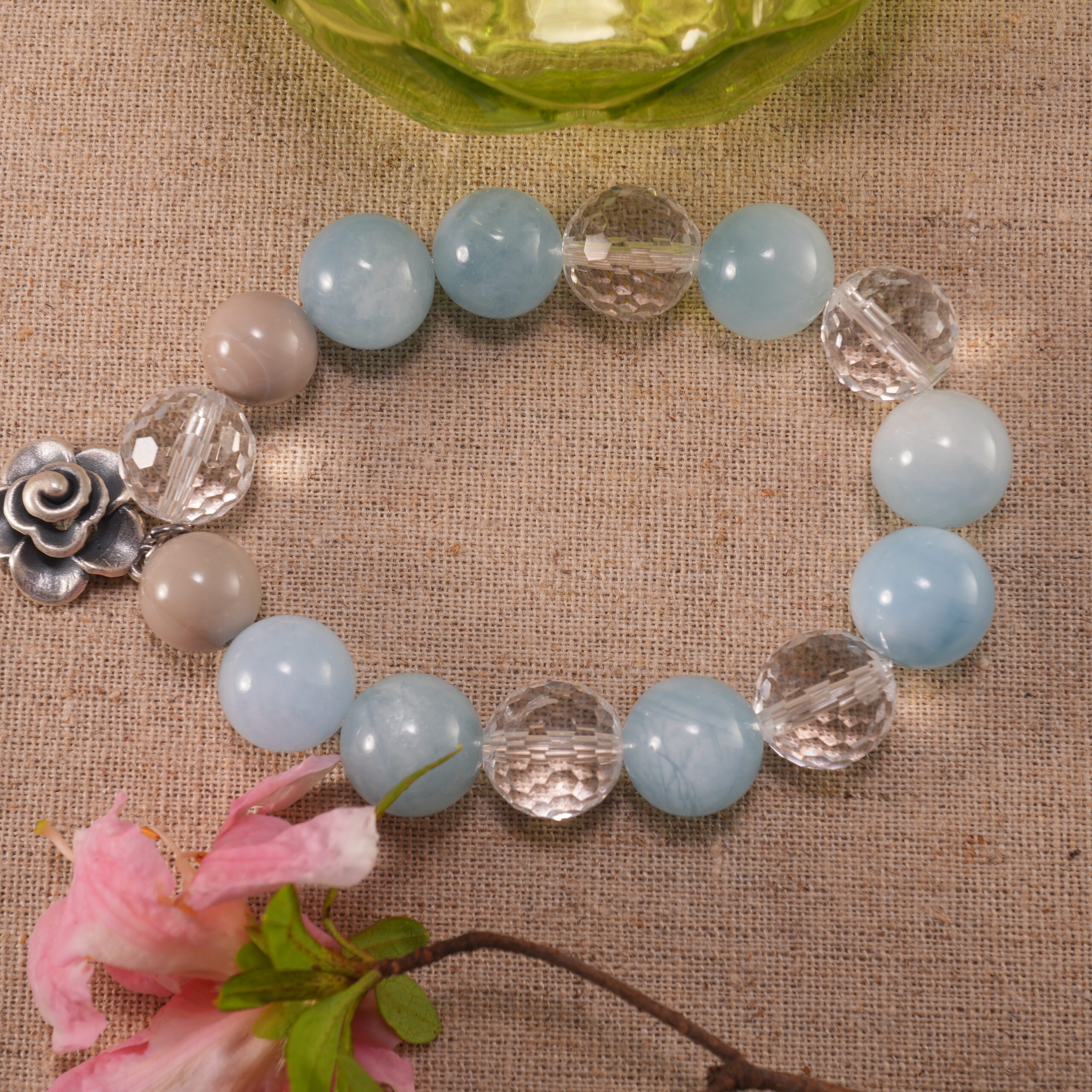 Aquamarine & Clear Quartz Bracelet with Flower Charm