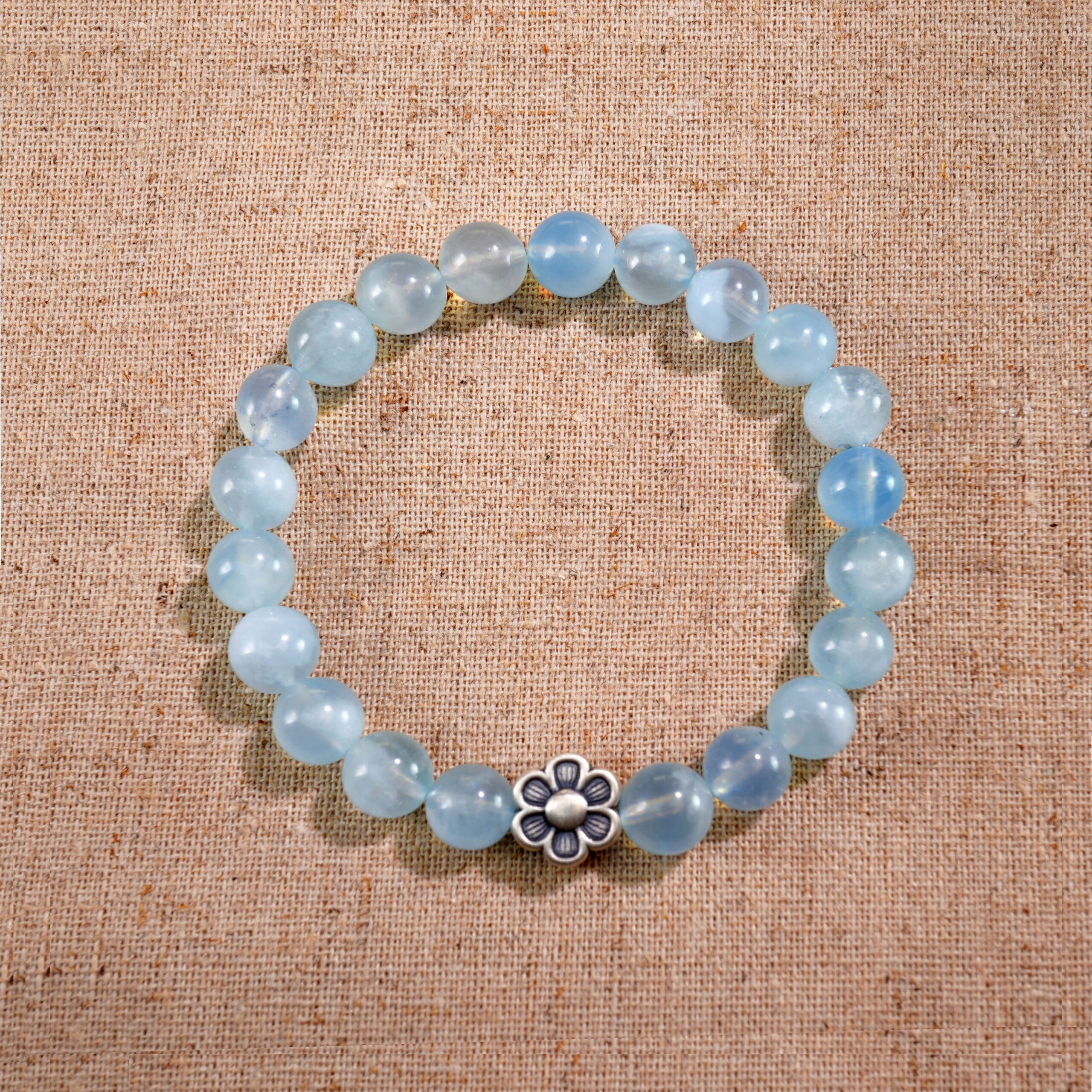 This minimal aquamarine bracelet features soothing beads and an oxidized silver flower charm. Designed to promote calm communication and inner clarity, it’s the perfect daily piece for mindful expression.