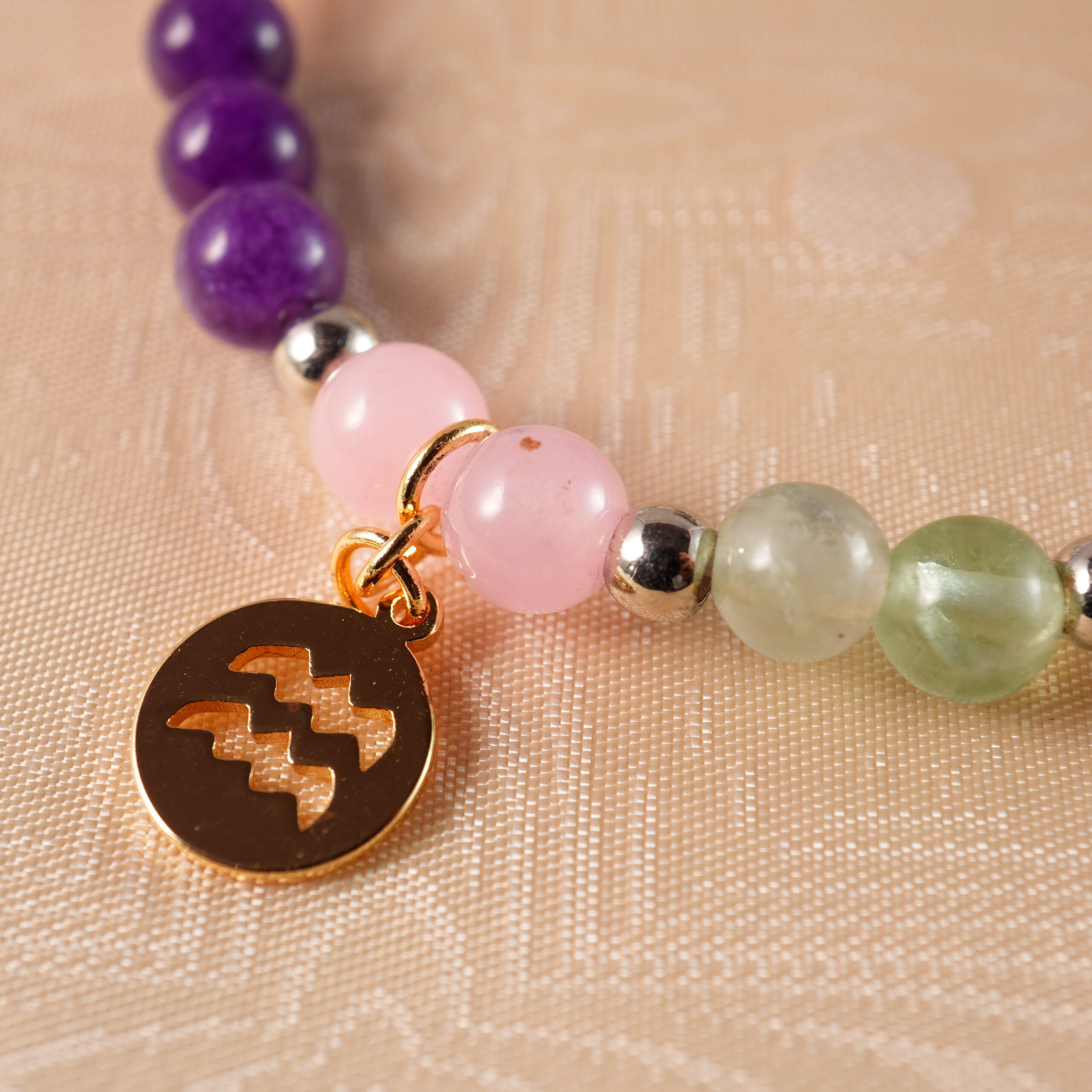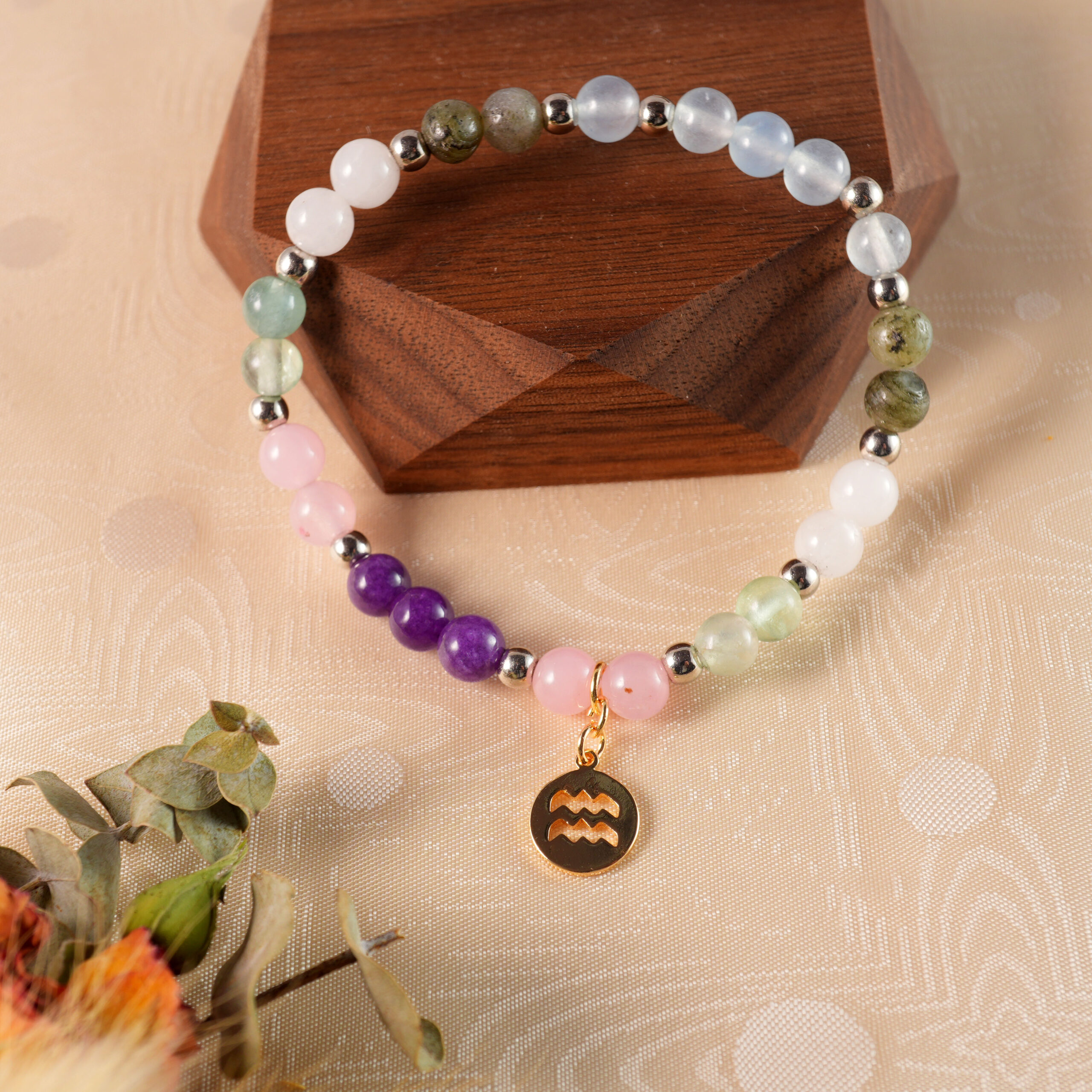 Discover the perfect Aquarius bracelet featuring aquamarine, chalcedony, rose quartz, moonstone, and prehnite. This adjustable zodiac bracelet boosts mental clarity, creativity, and emotional balance—ideal for daily wear or meaningful Aquarius gifts. Enhance your spiritual growth and express your unique visionary energy with this elegant, handcrafted bracelet.