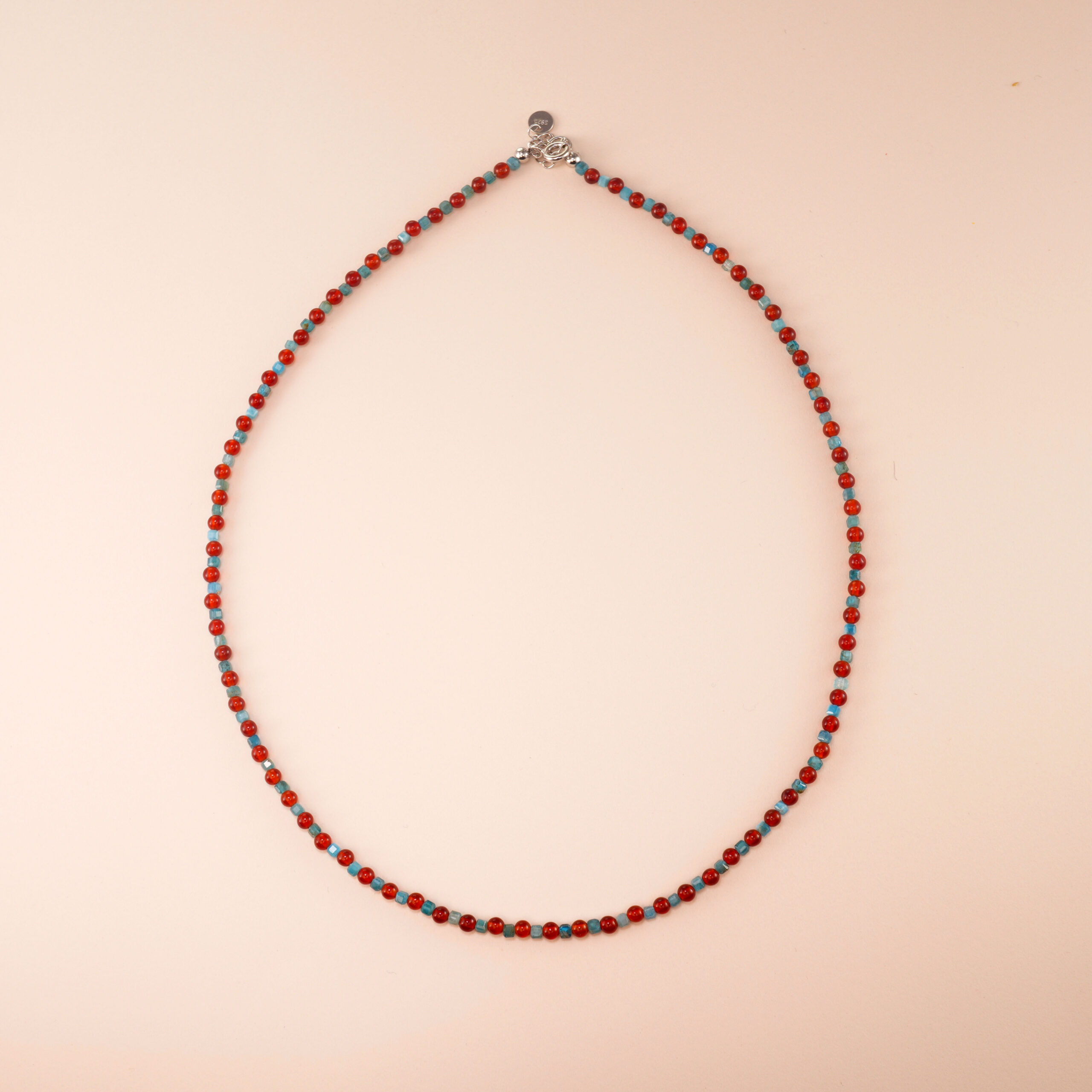 This handcrafted clavicle chain features a combination of Blue Apatite and Red Agate beads, promoting vitality and balance. The vibrant contrast between the two gemstones makes it both eye-catching and meaningful. Ideal for casual wear or special occasions, it brings energy and style.