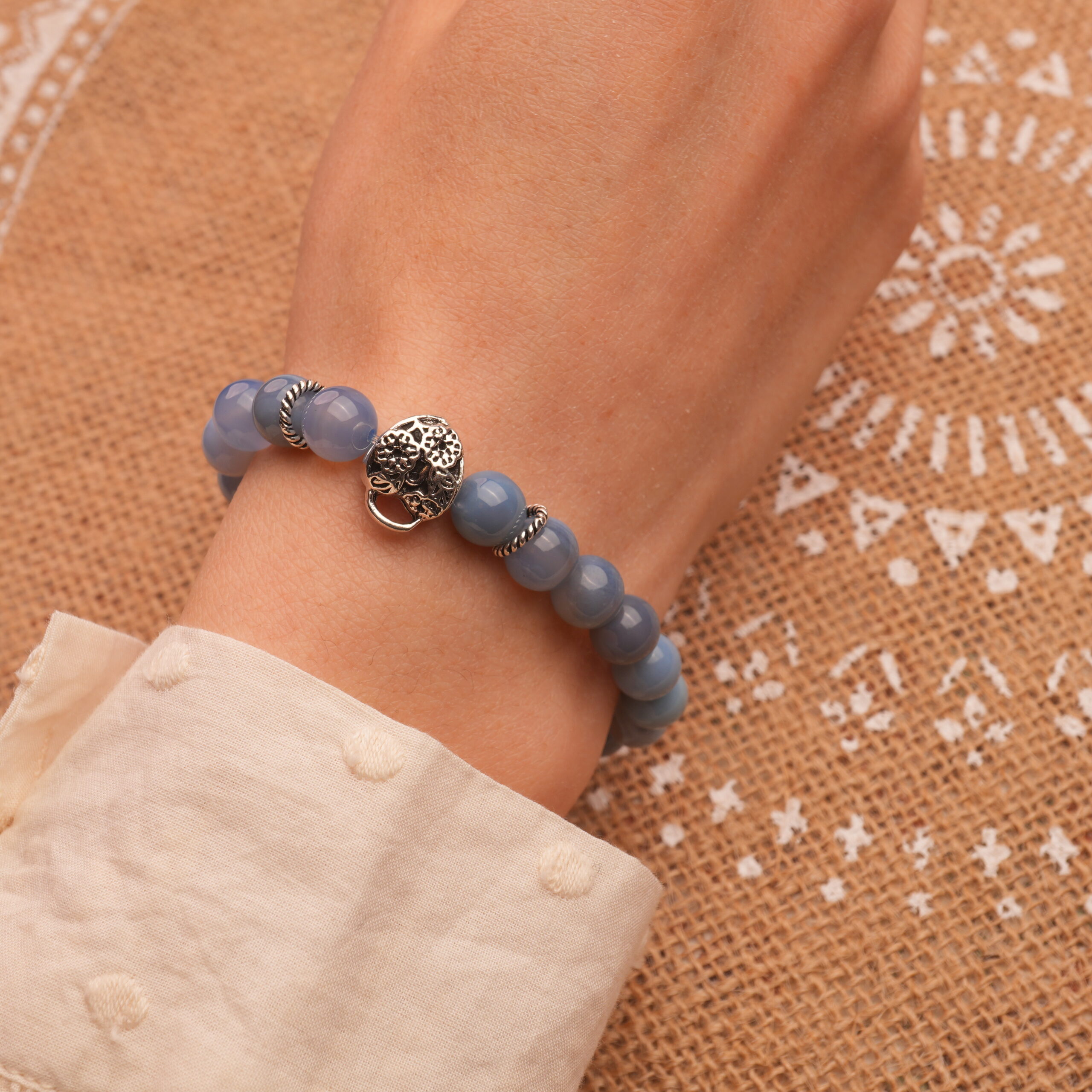 This handcrafted bracelet features calming blue banded agate beads paired with silver accents. Designed to promote emotional stability, inner clarity, and elegant simplicity.