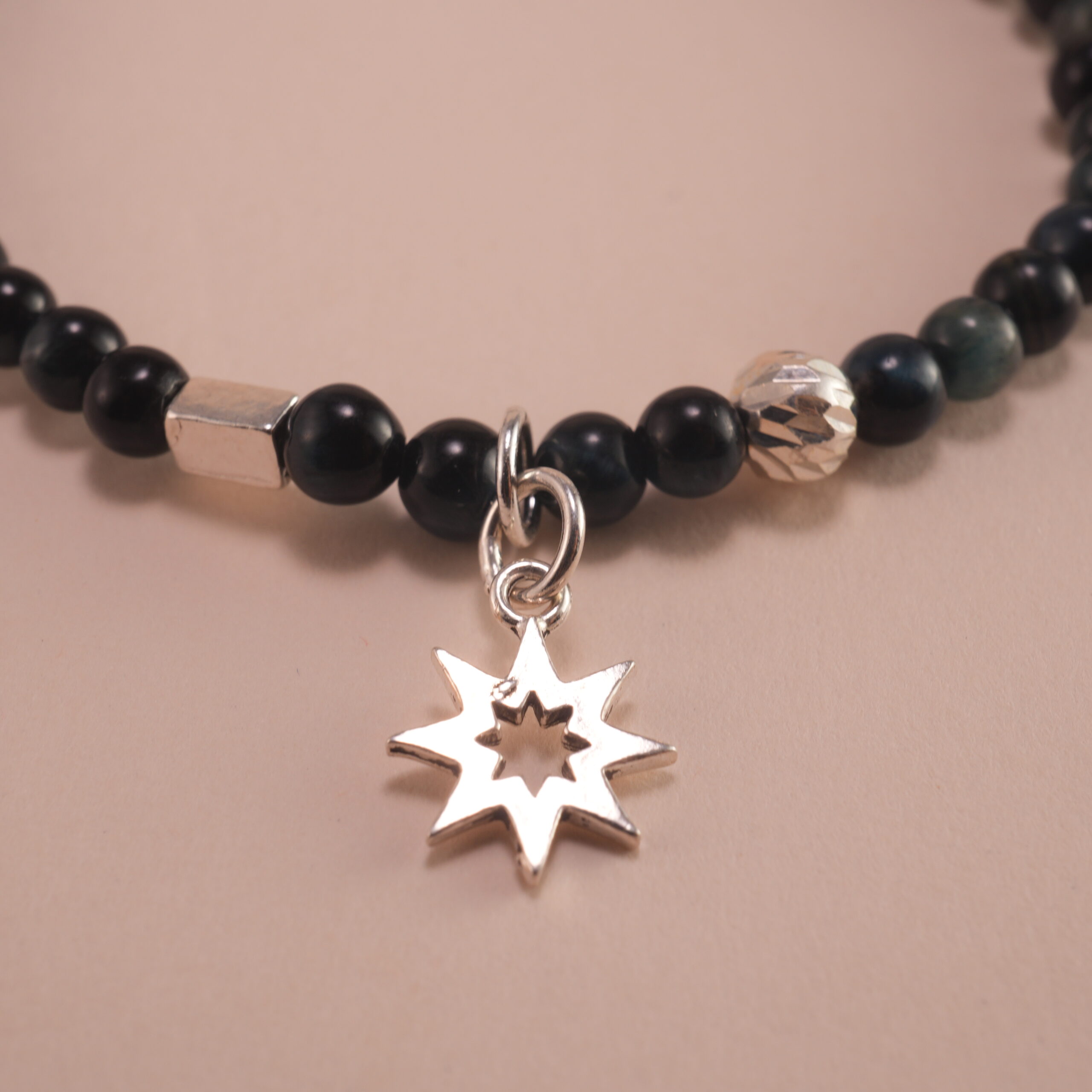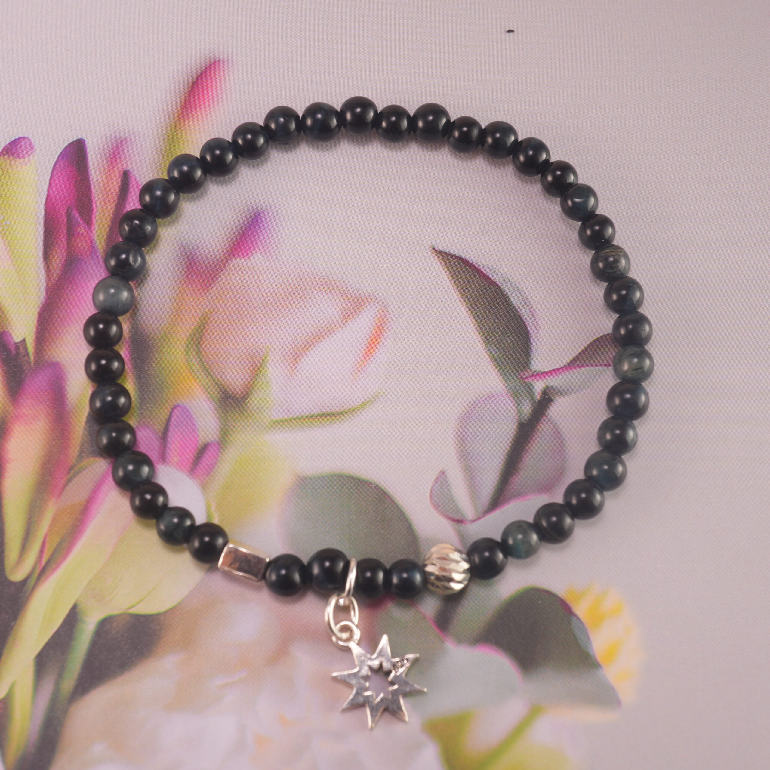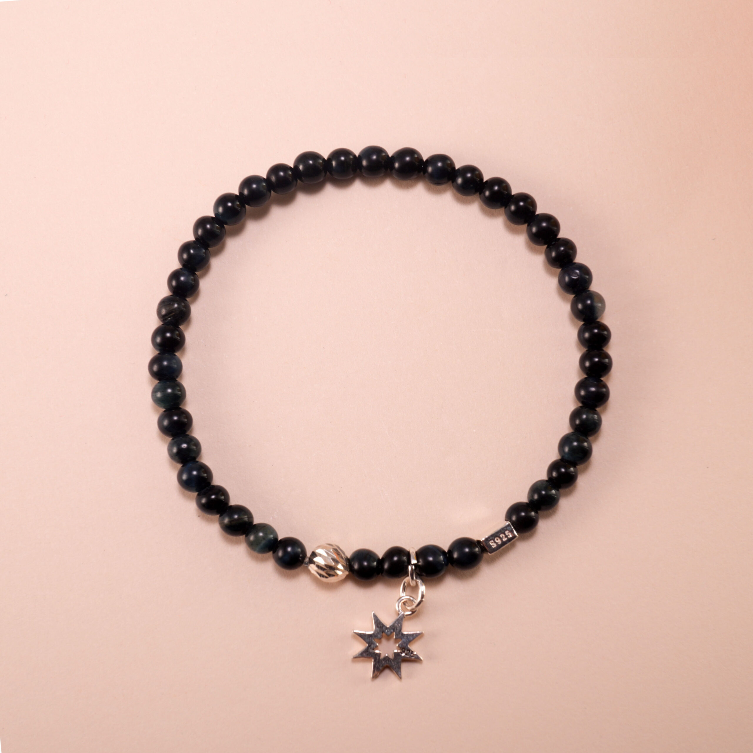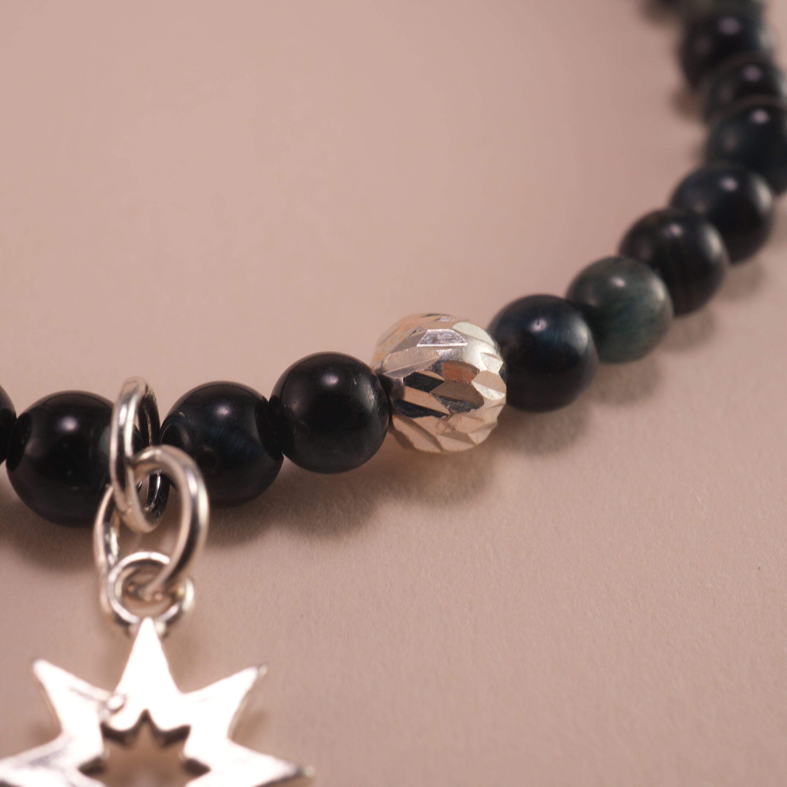 A 4mm beaded bracelet made with shimmering blue tiger eye and a sterling silver charm. Designed to sharpen focus, build confidence, and offer calming protection.