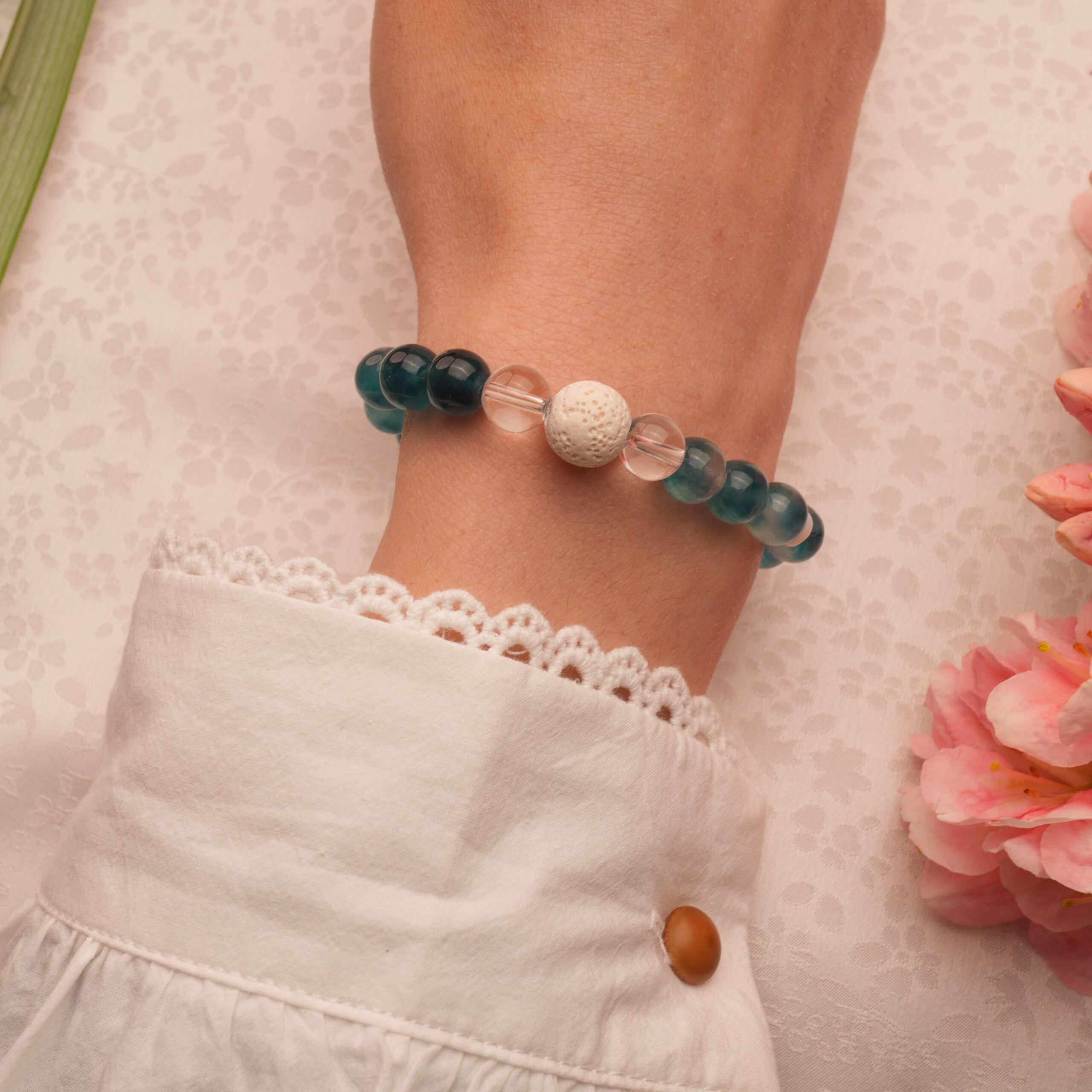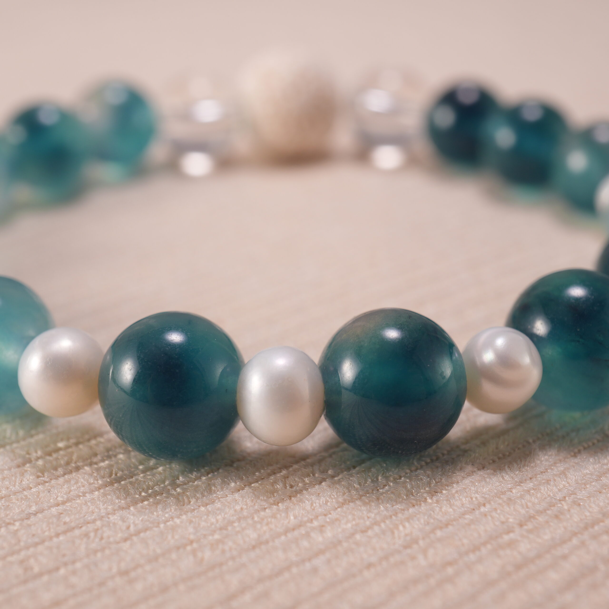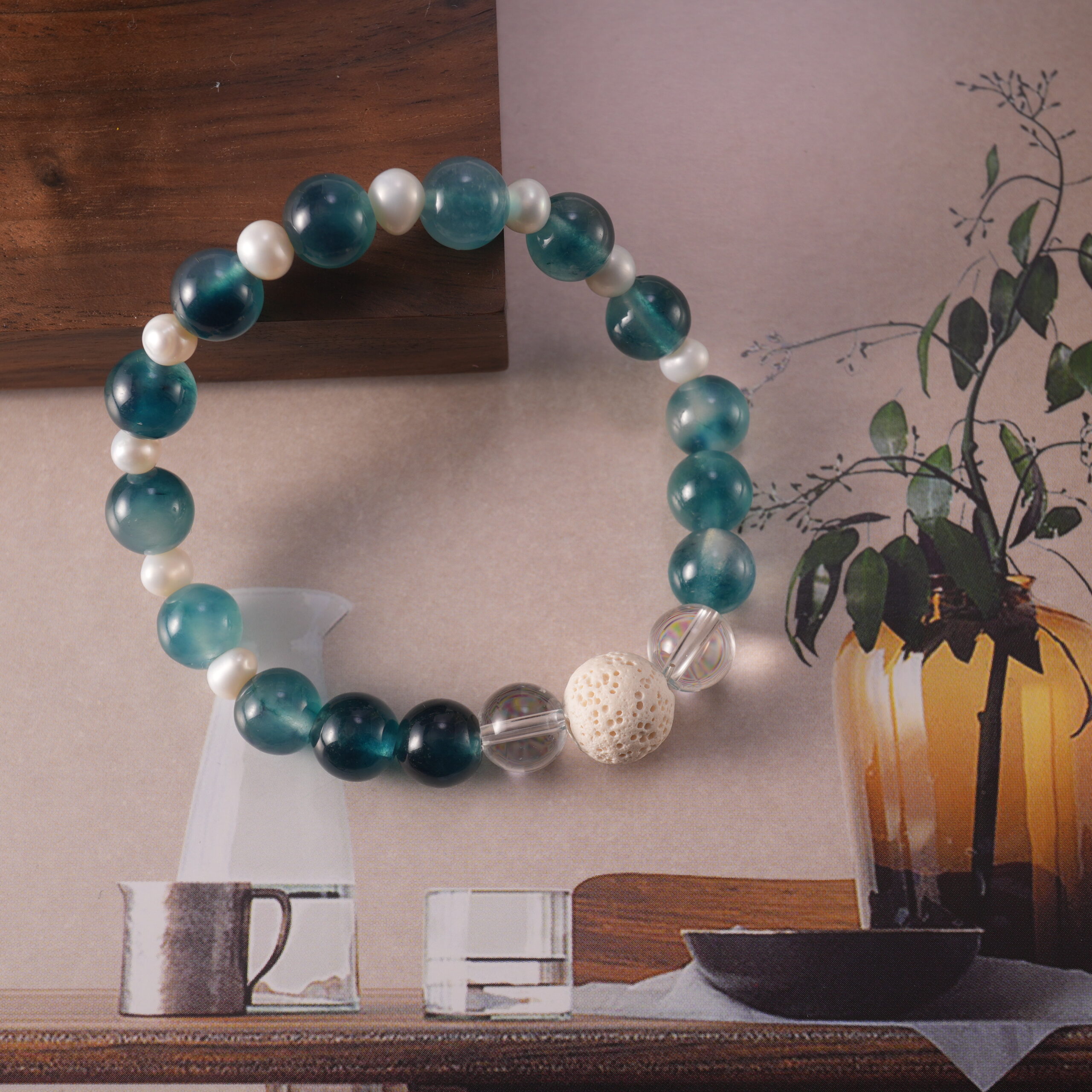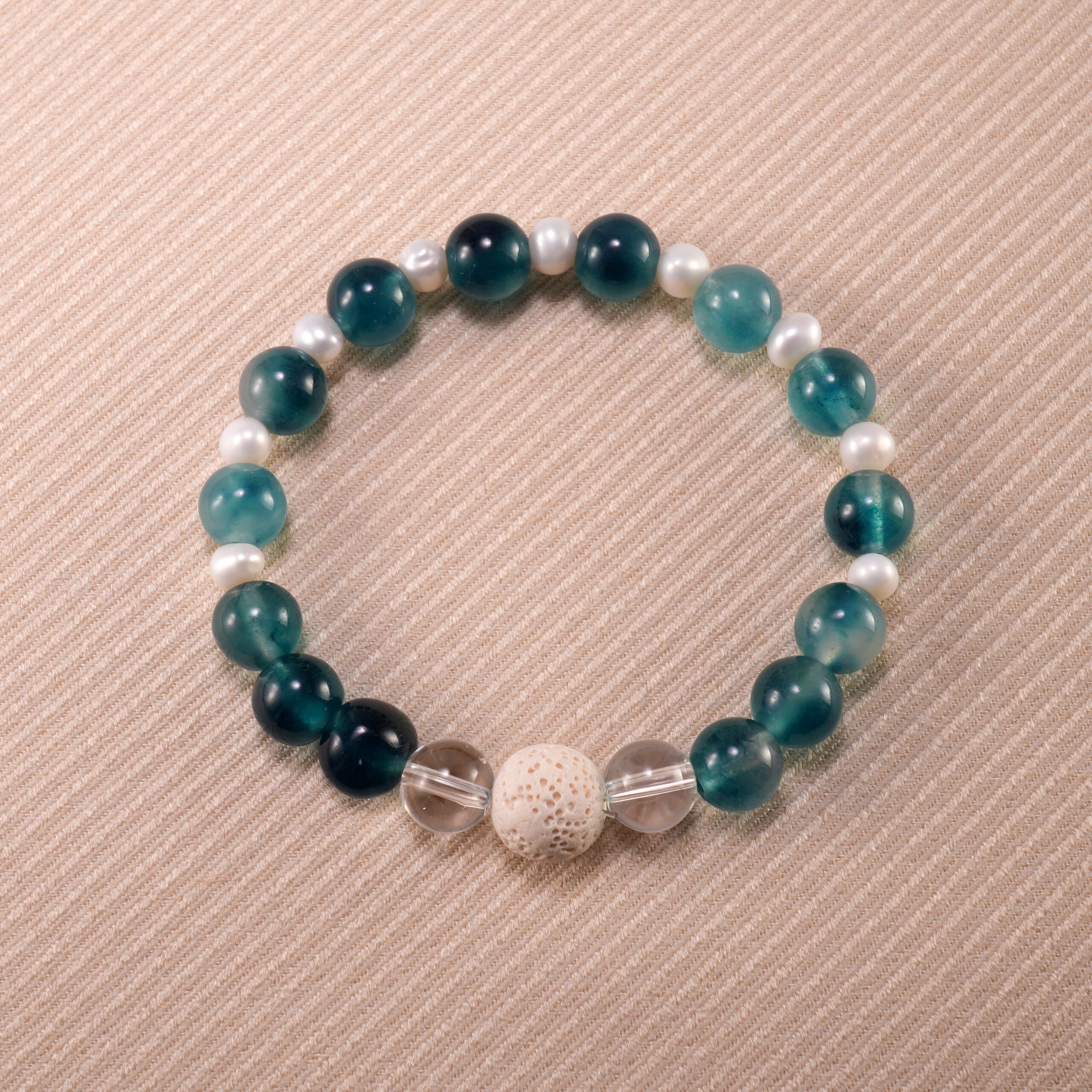 A soothing essential oil diffuser bracelet with pearl, blue chalcedony, lava stone, and clear quartz—designed to help you stay calm, centered, and light.