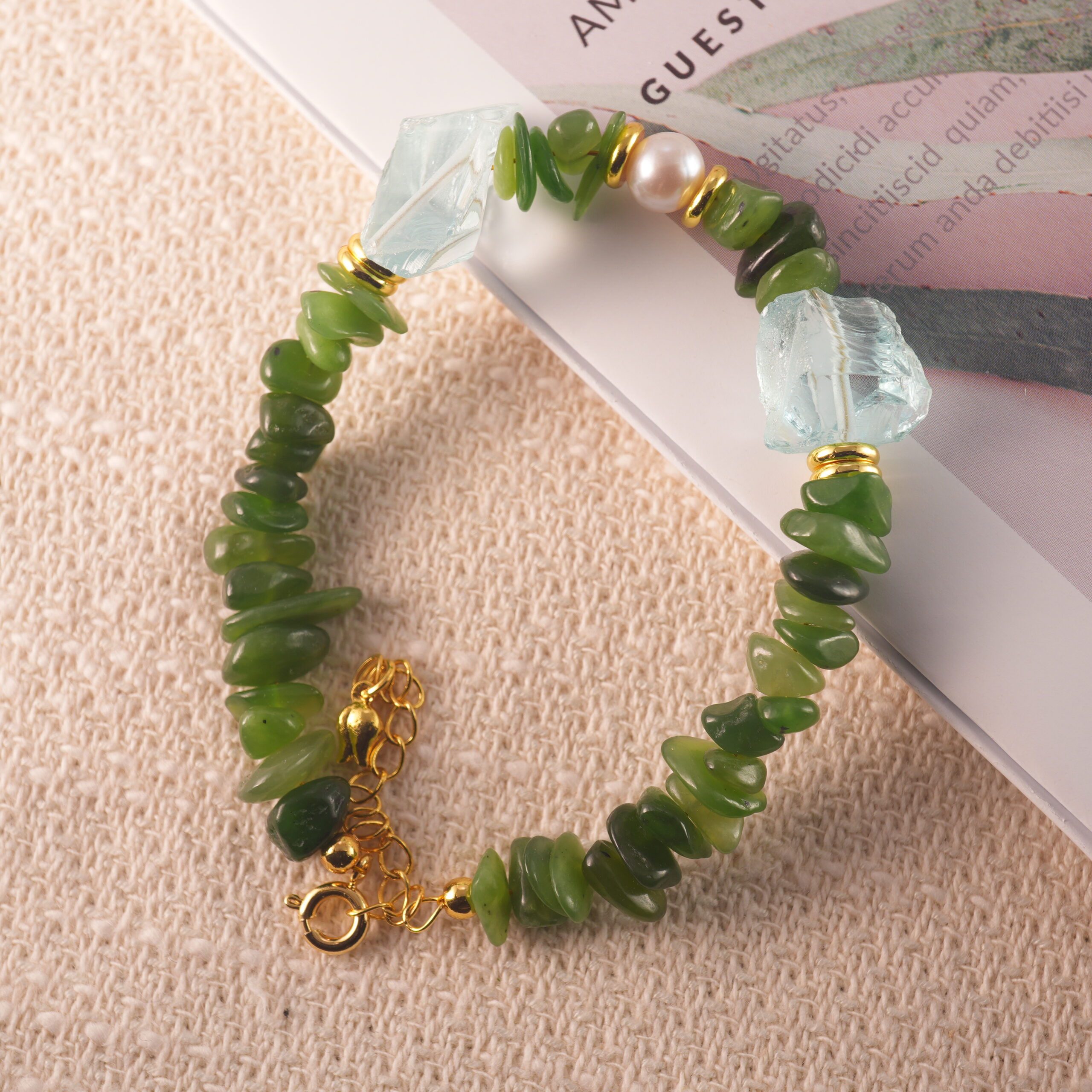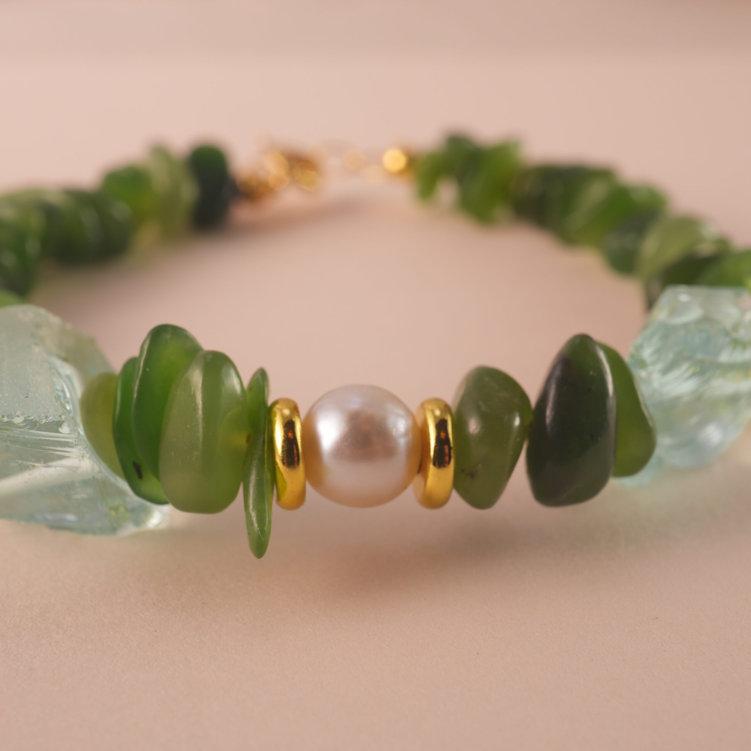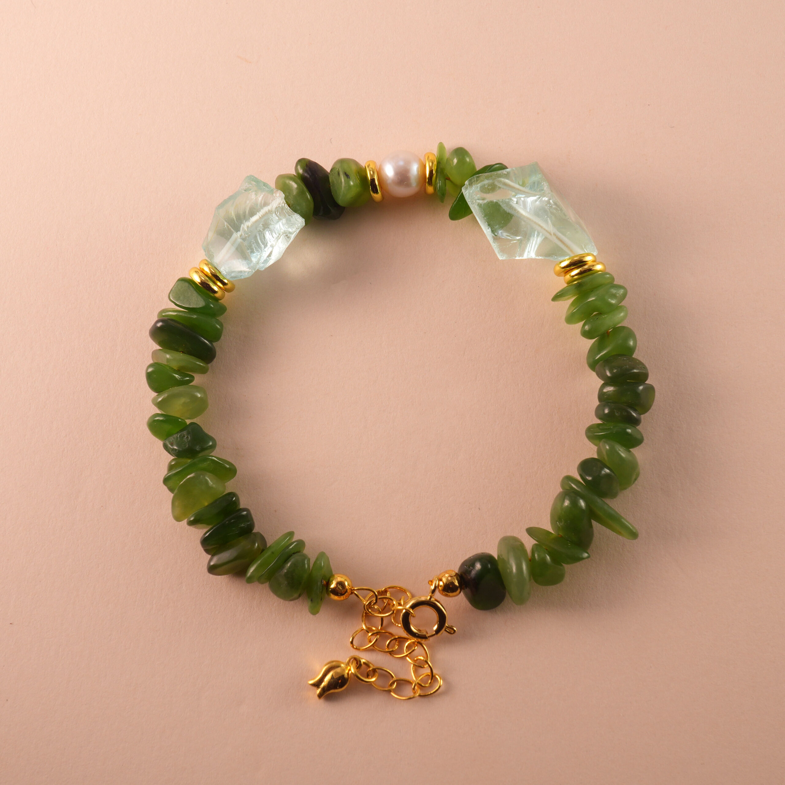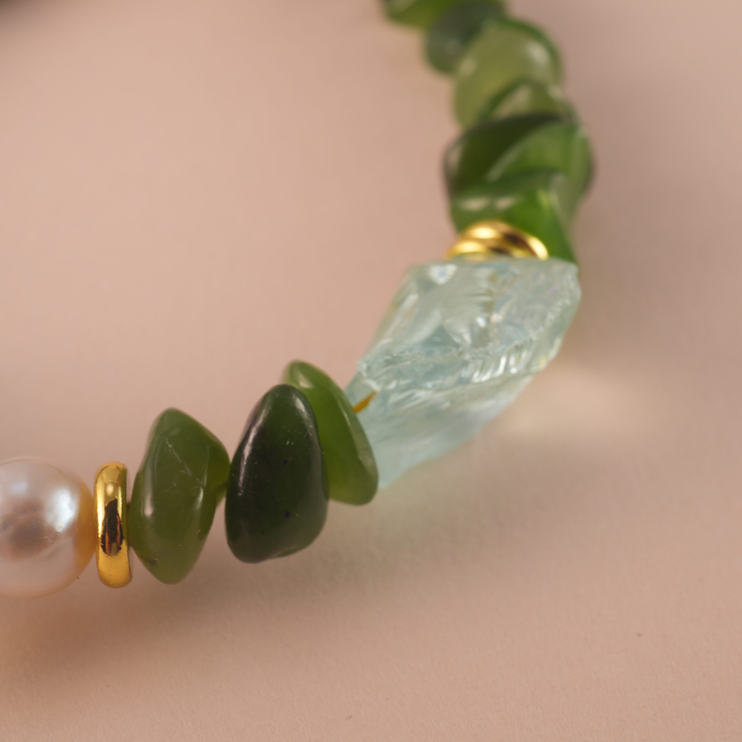 A grounding Capricorn bracelet made with jade, aquamarine, and pearls—designed to support calm ambition, focus, and emotional strength.