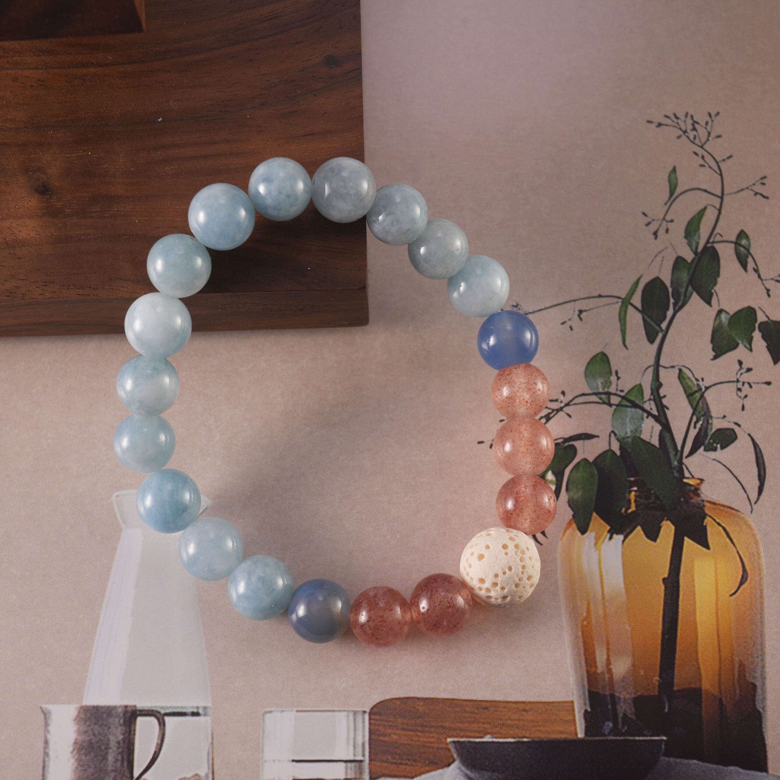 - Stacked bracelet set with peach and blue chalcedony, clear quartz, and lava stone