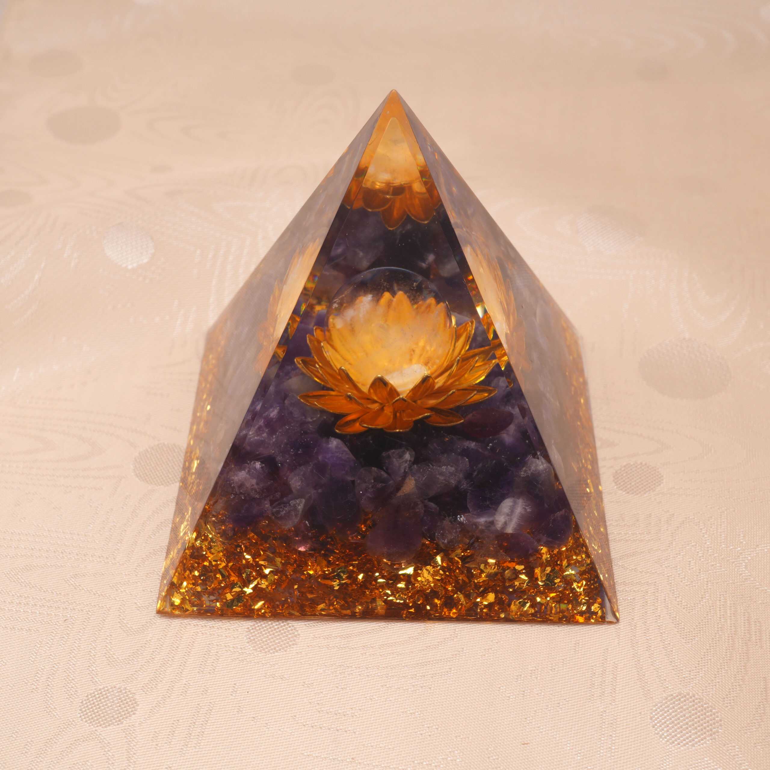 Handcrafted with clear quartz and amethyst, this resin pyramid promotes balance, clarity, and calm energy. Its pyramid shape amplifies healing power, making it ideal for meditation, rituals, or as a beautiful centerpiece in your space.