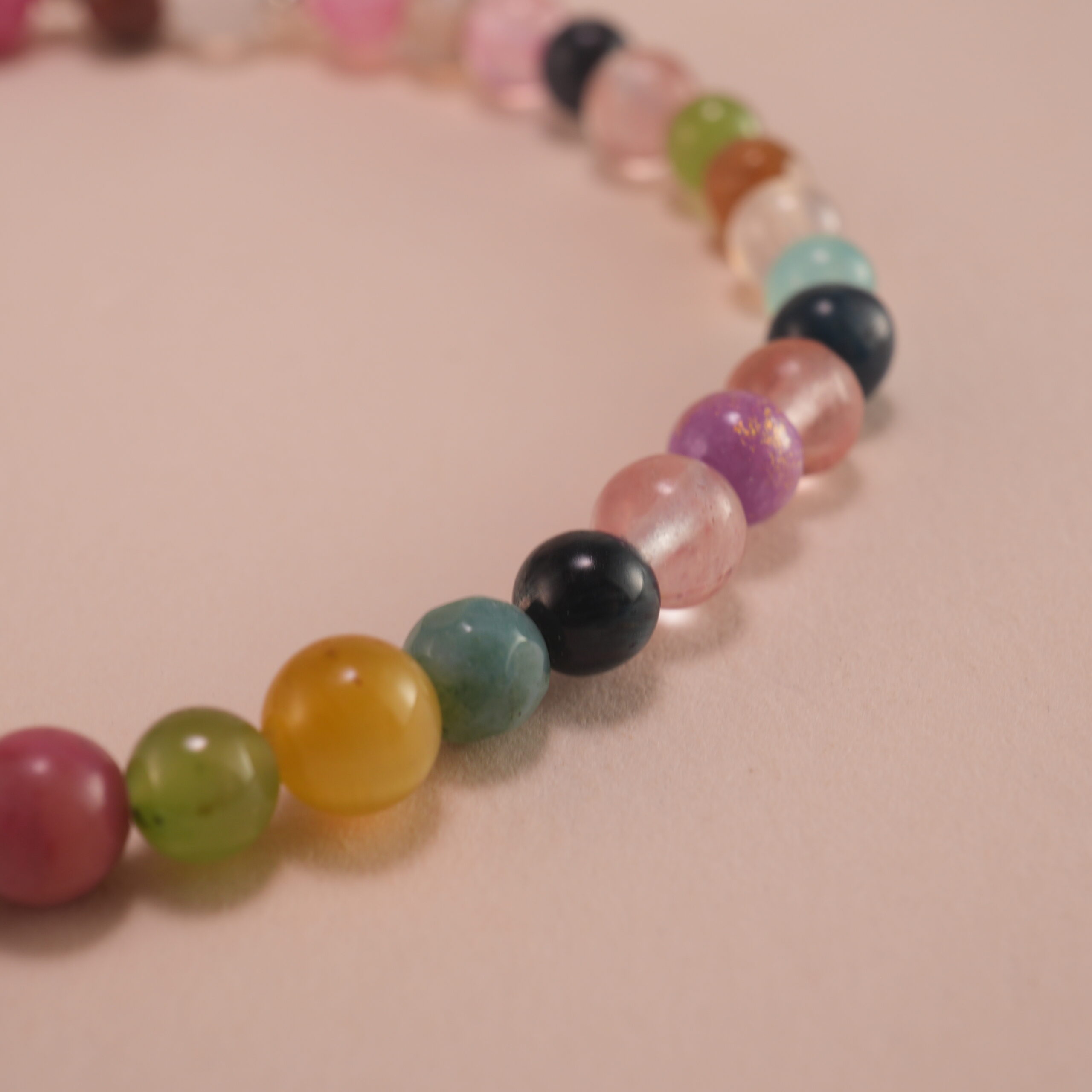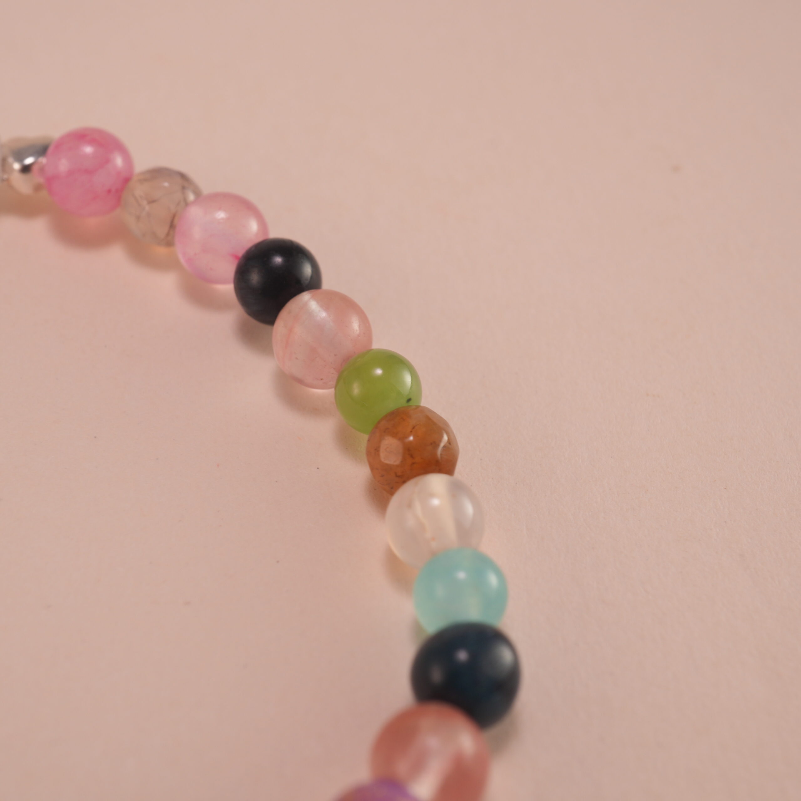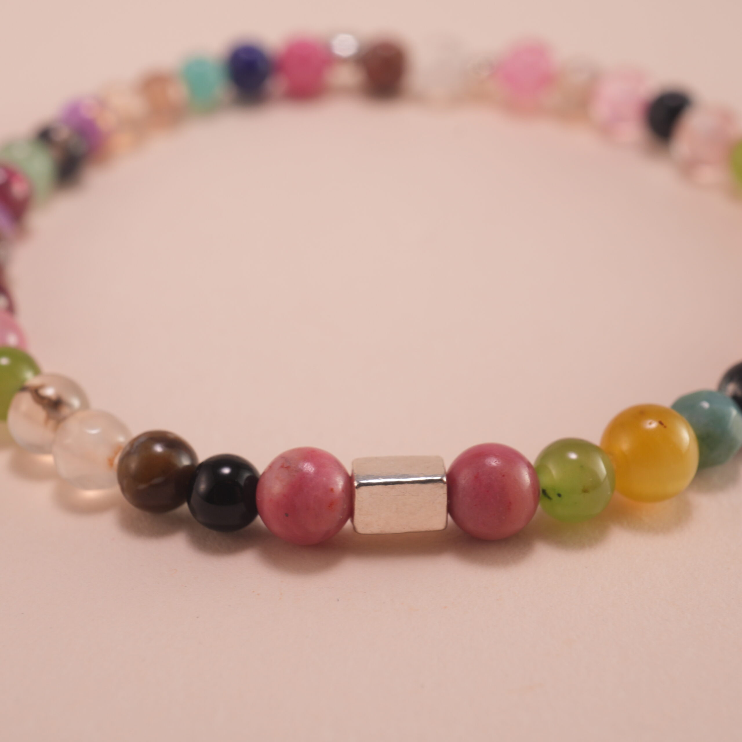 This vibrant multi gemstone bracelet features a colorful blend of Garnet, Amethyst, Obsidian, and other natural crystals. Each stone offers unique energy—protection, passion, and clarity—making it a powerful and stylish accessory for everyday wear.