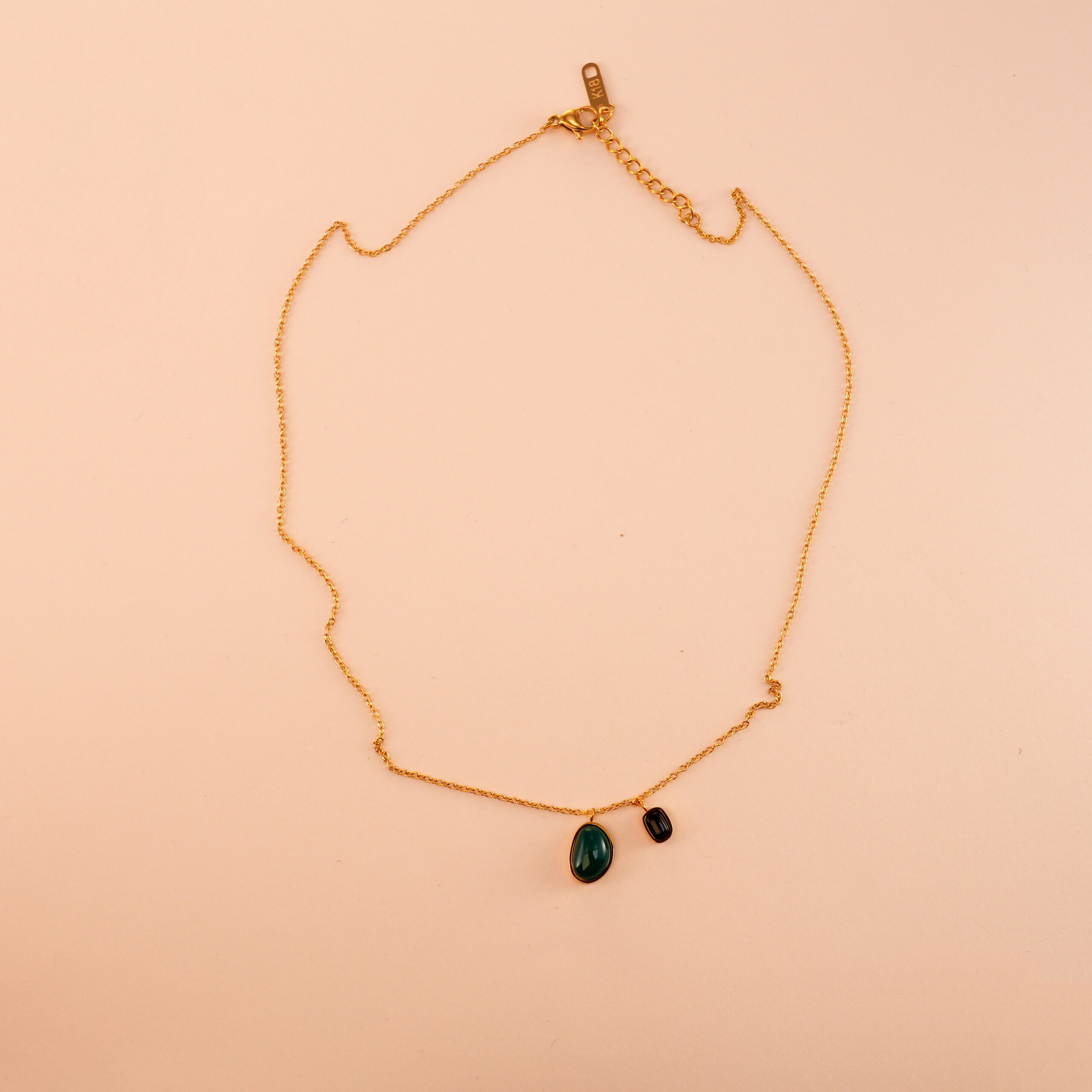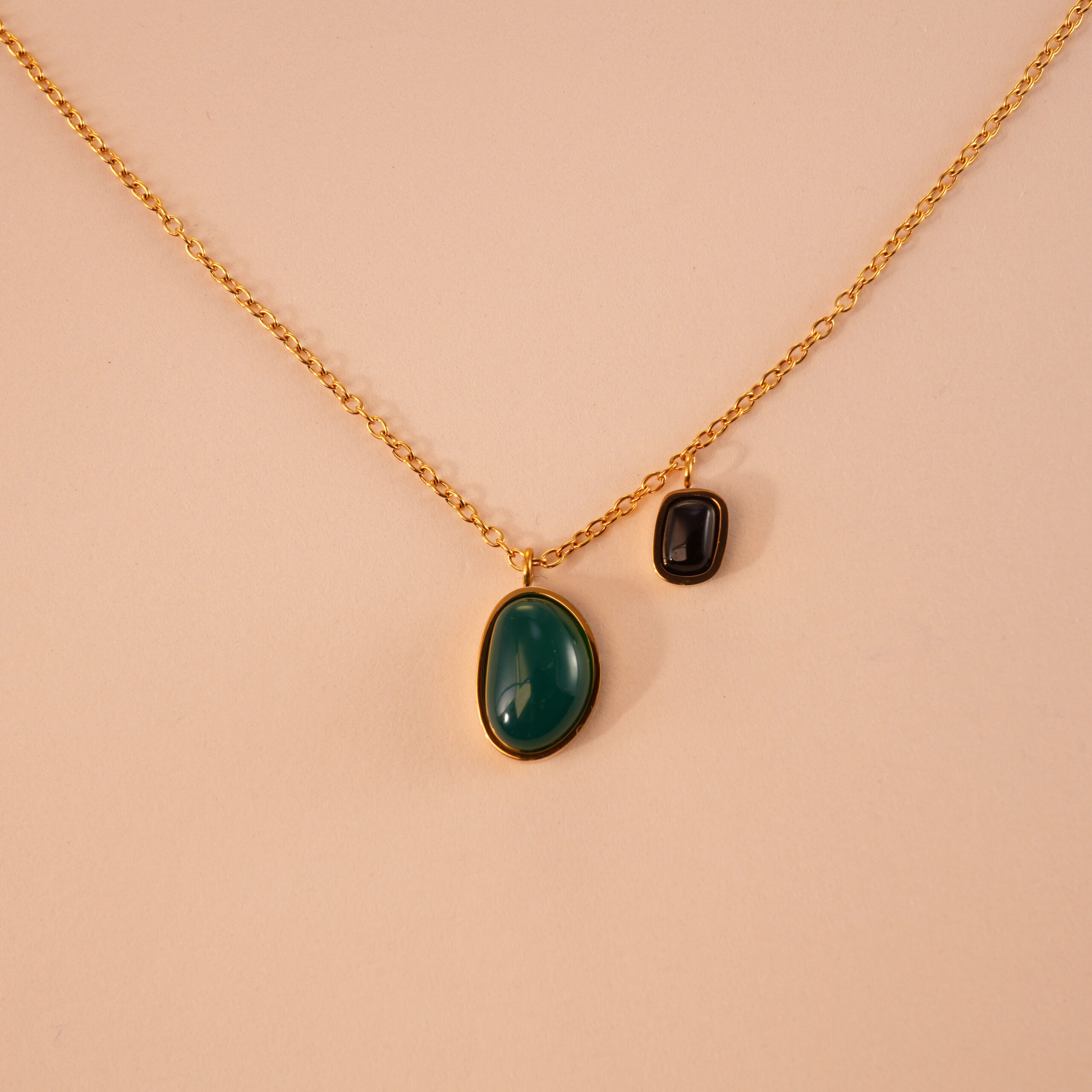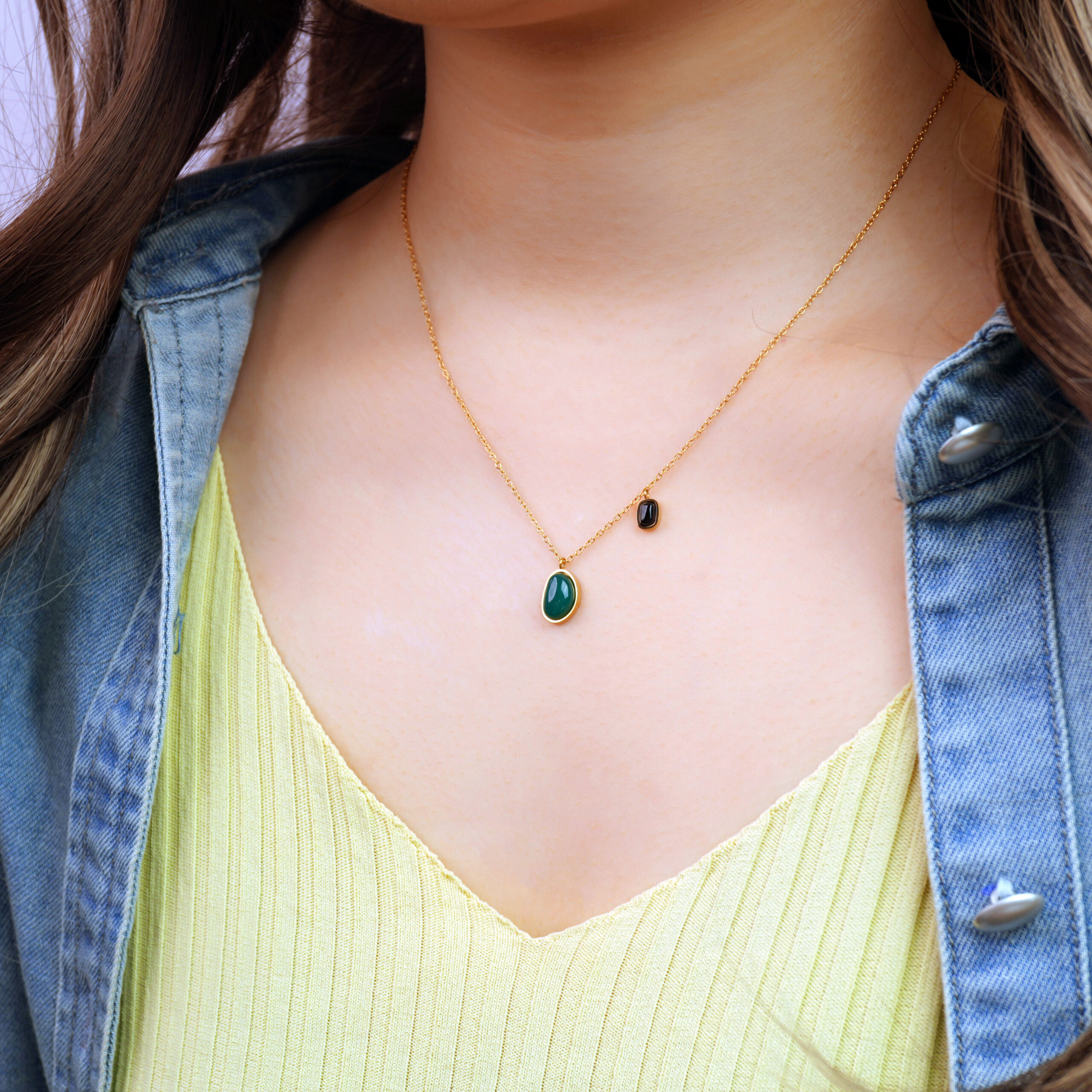 This handmade double pendant necklace features two stunning agates: vibrant green agate for good luck and grounding black agate for protection. The minimalist design of the necklace makes it both stylish and energetically powerful, perfect for everyday wear or as a statement piece.