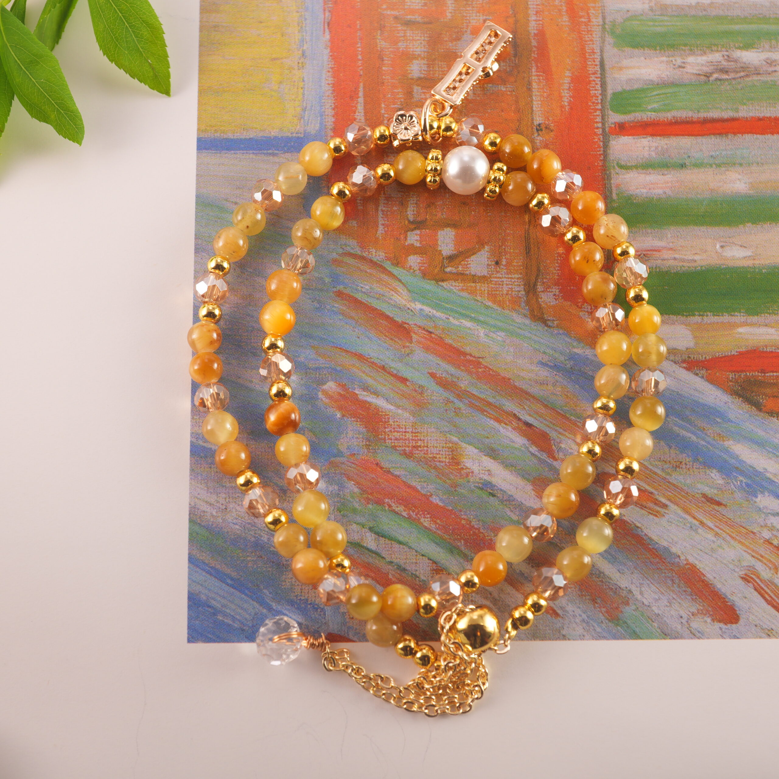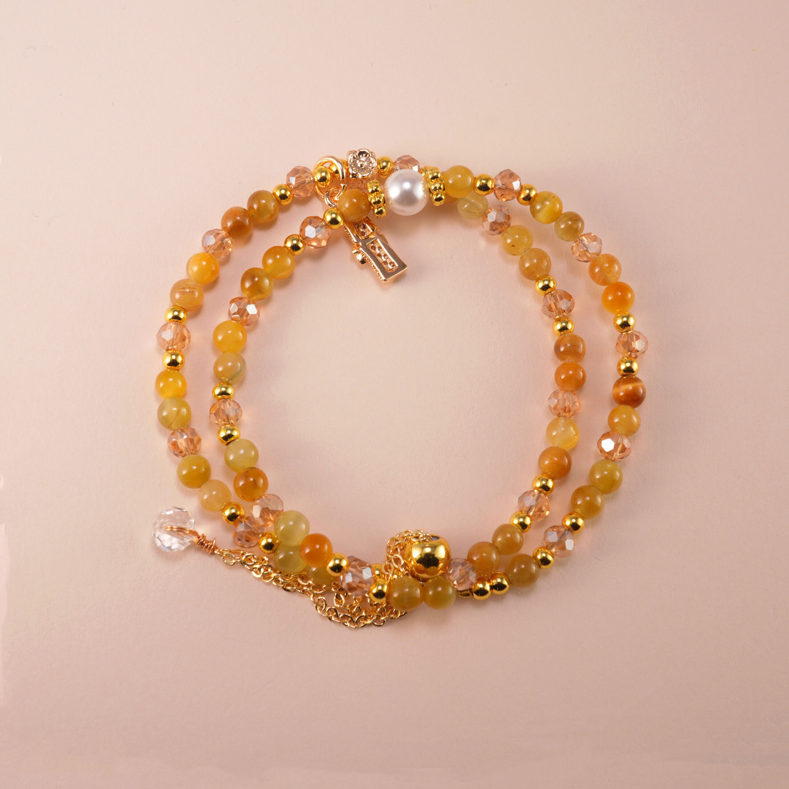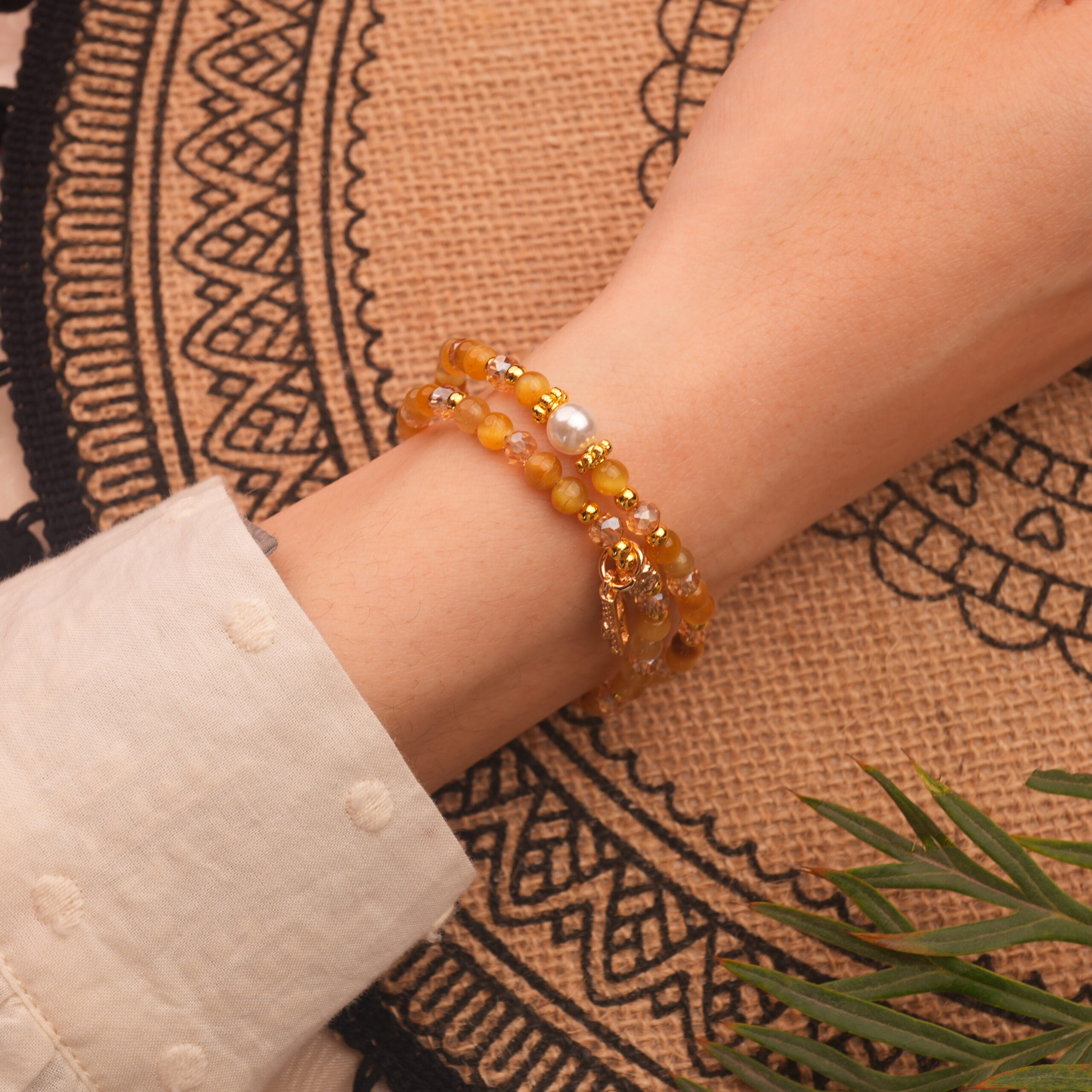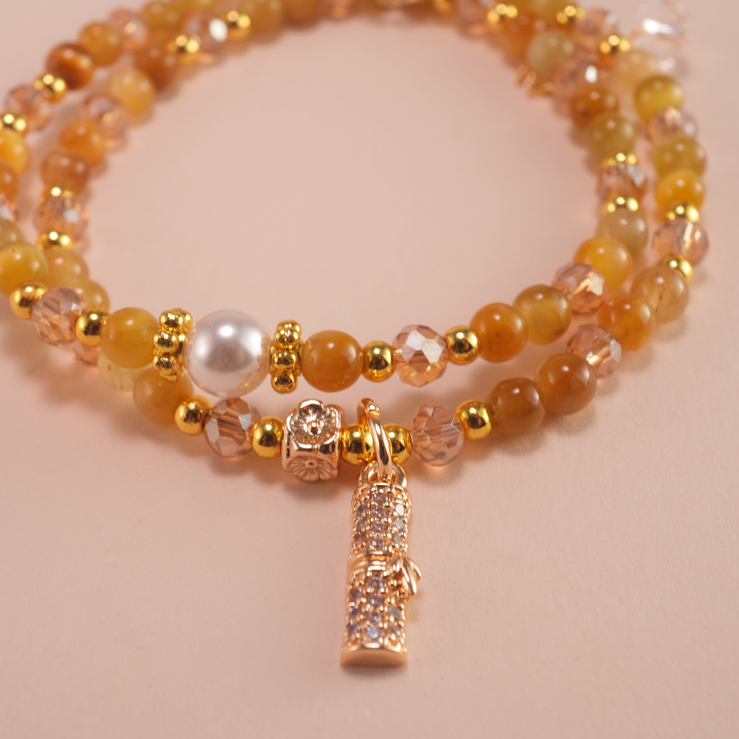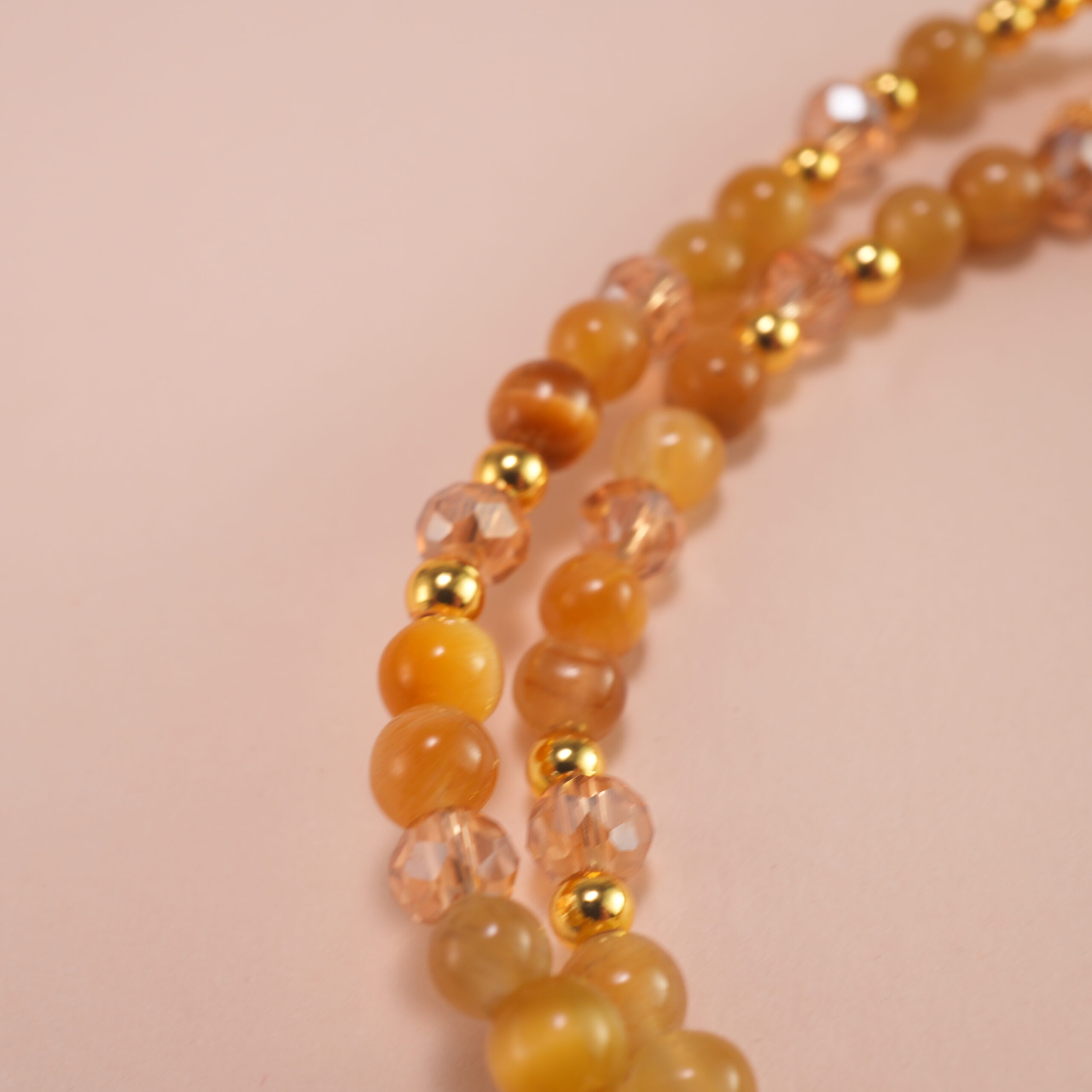 This double-layered bracelet features natural Tiger Eye, clear quartz, and delicate pearls in an adjustable design that fits any wrist. Combining Tiger Eye’s protective, wealth-attracting properties with clear quartz’s clarity and pearls’ elegance, this gemstone bracelet offers style and powerful energy.