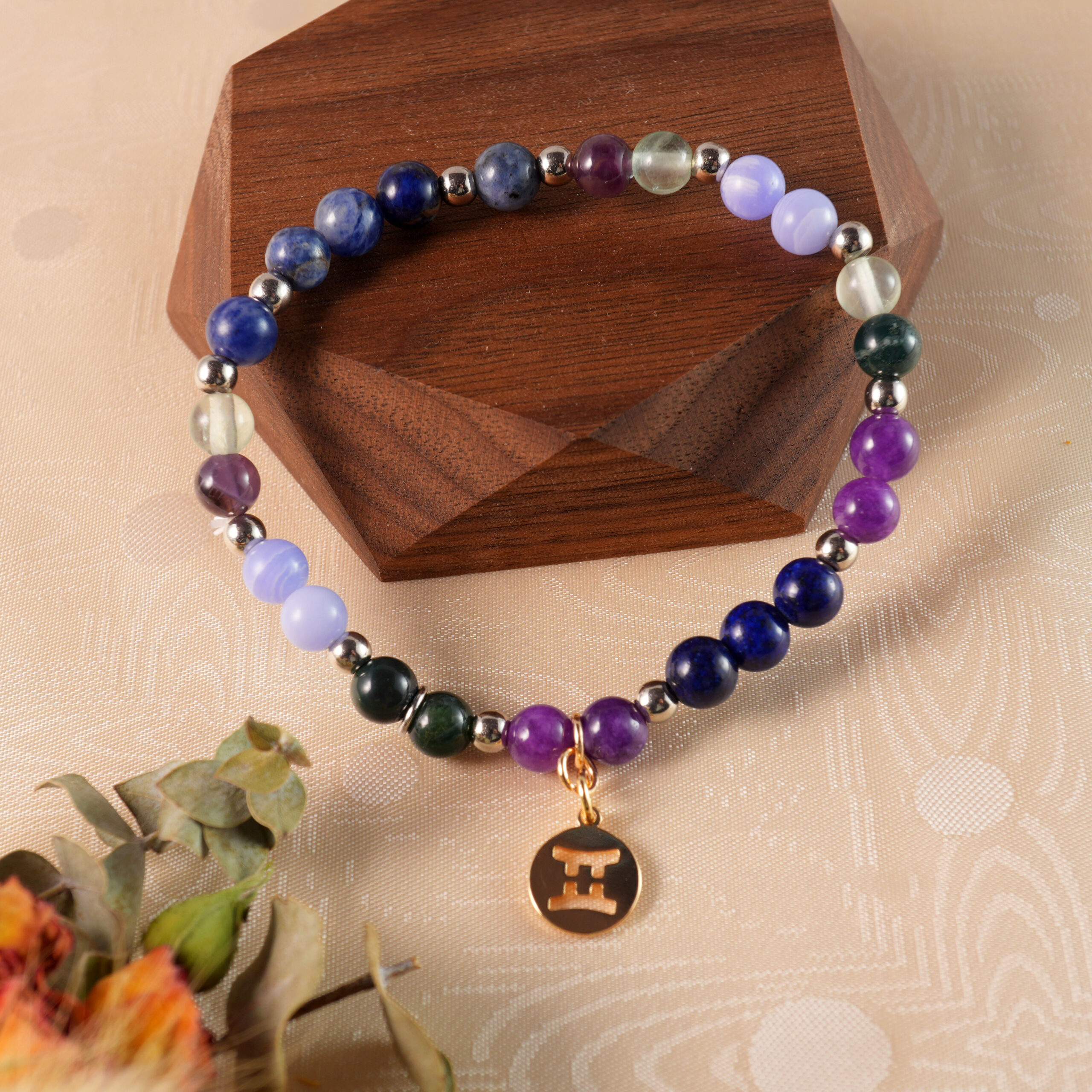 Gemini jewelry bracelet with blue agate, dream amethyst, and prehnite. Designed to boost clarity, balance emotions, and support confident self-expression every day.