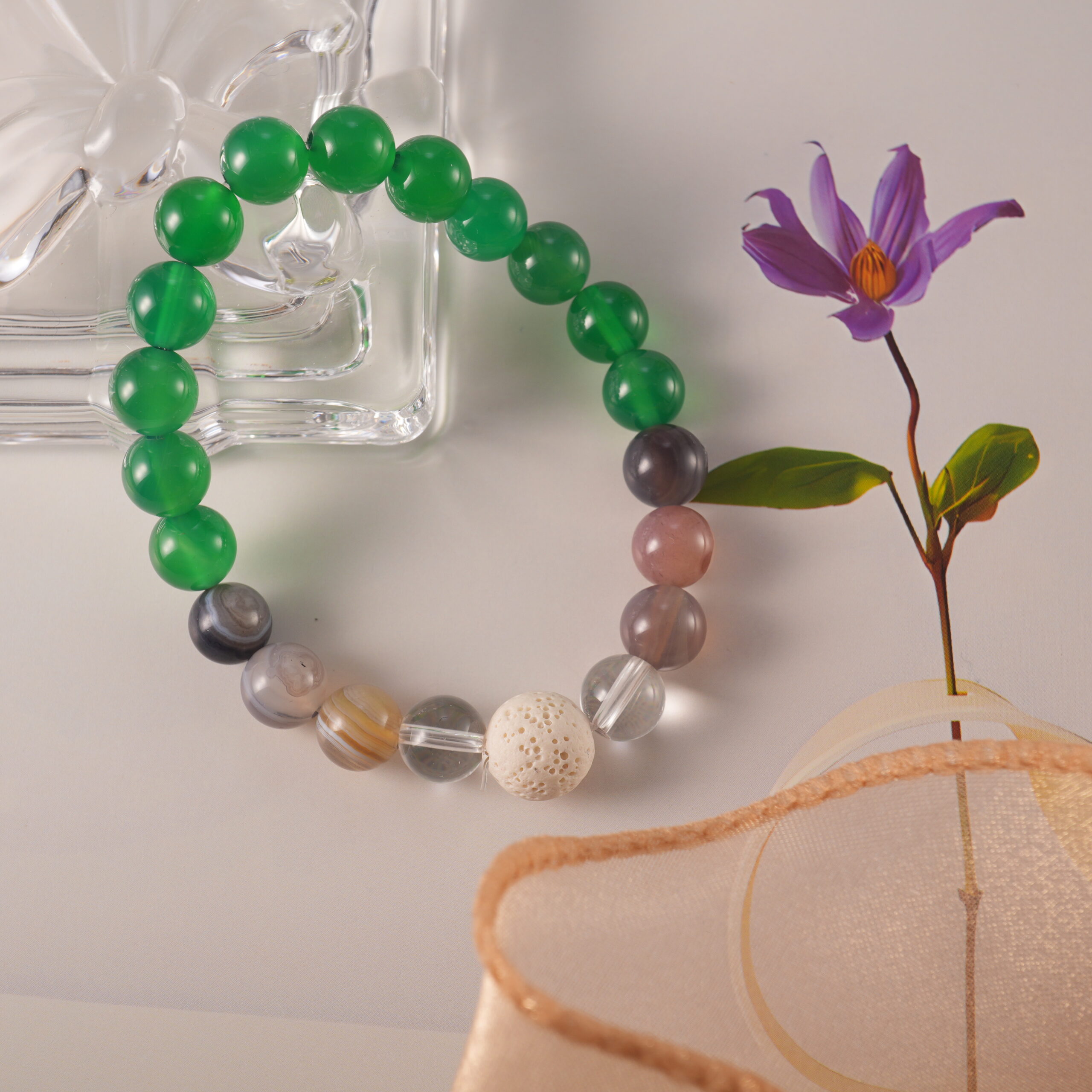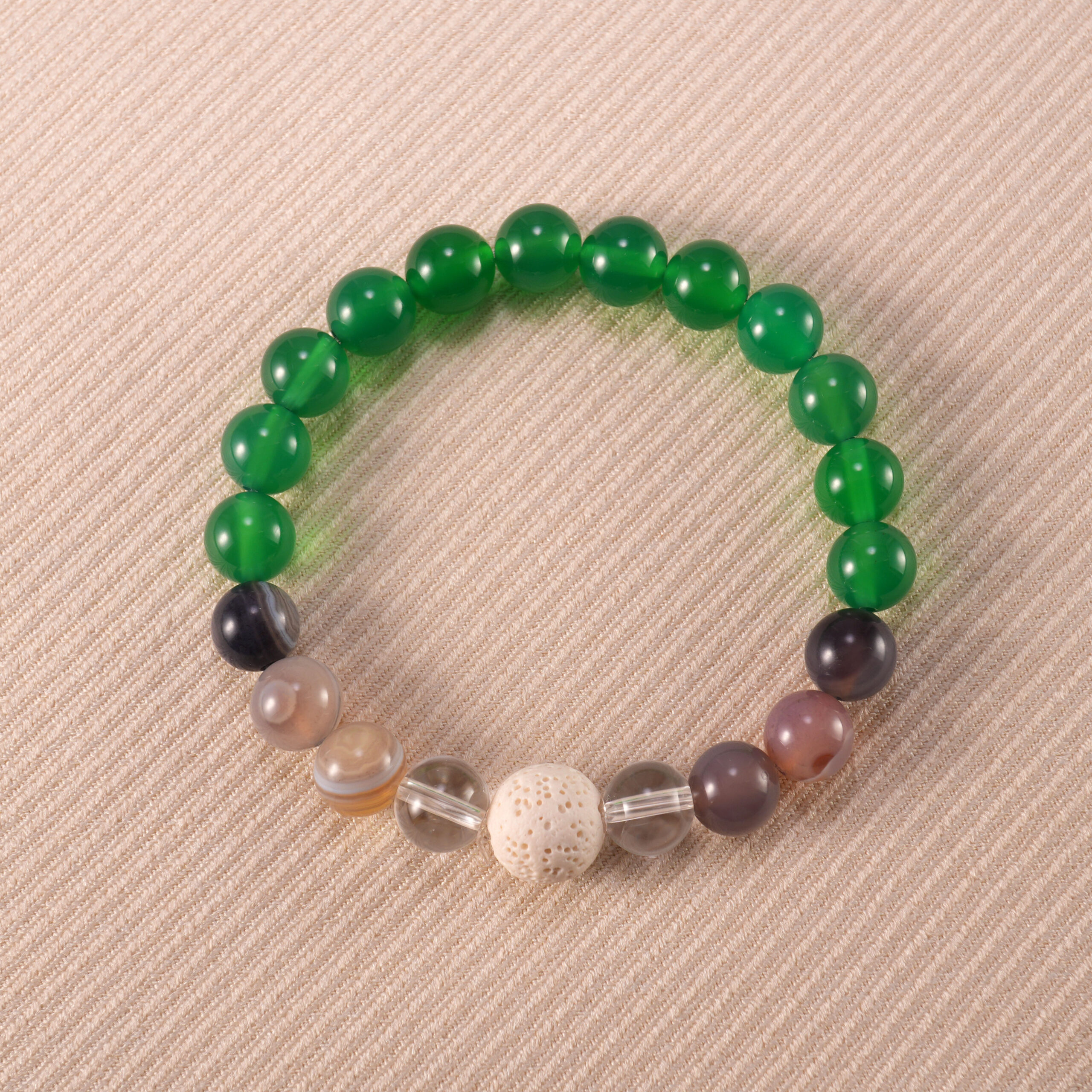 A handmade essential oil bracelet combining green agate, banded agate, lava rock, and clear quartz—designed to attract good luck, prosperity, and positive energy.