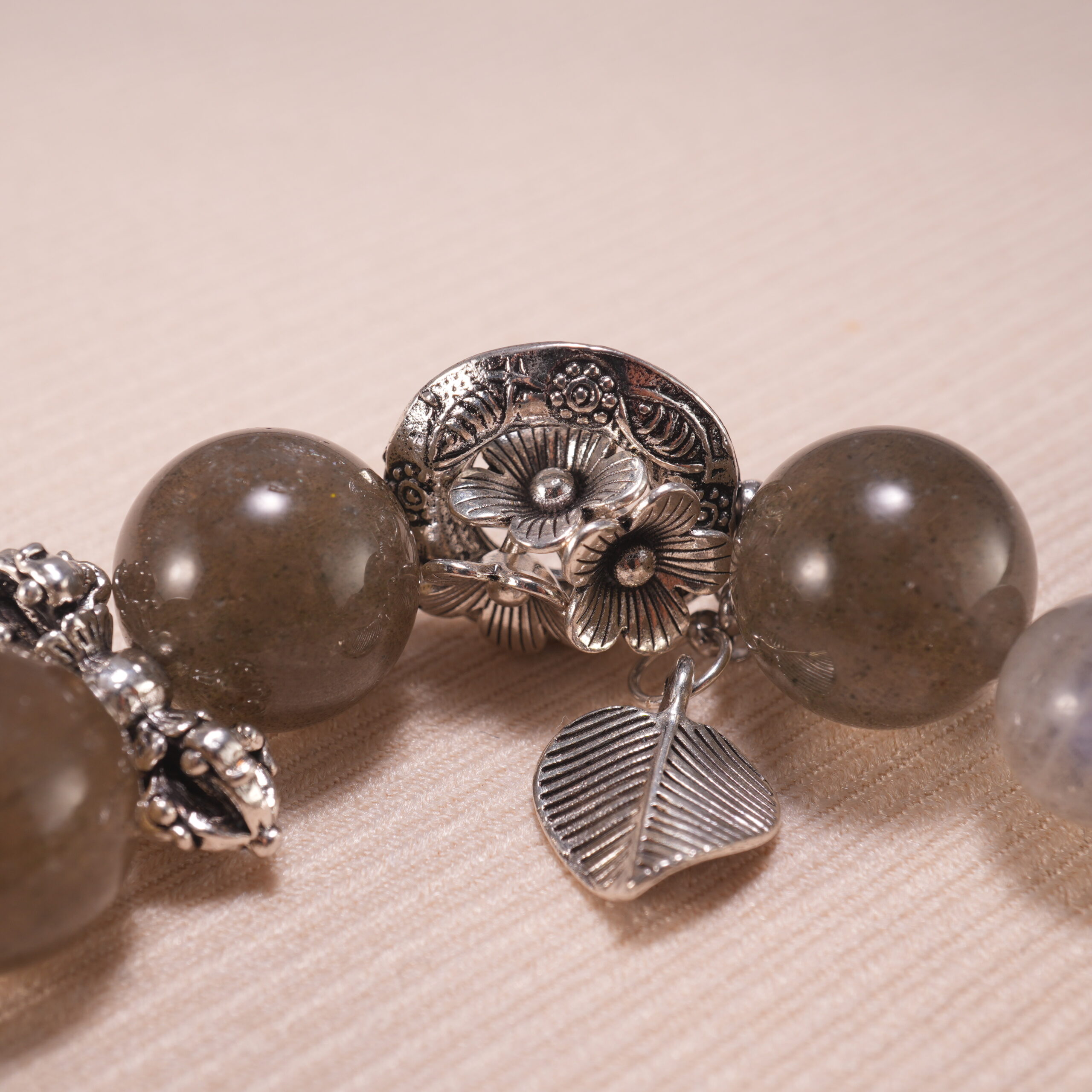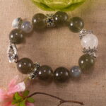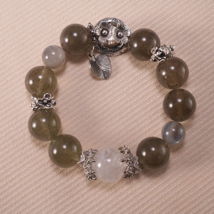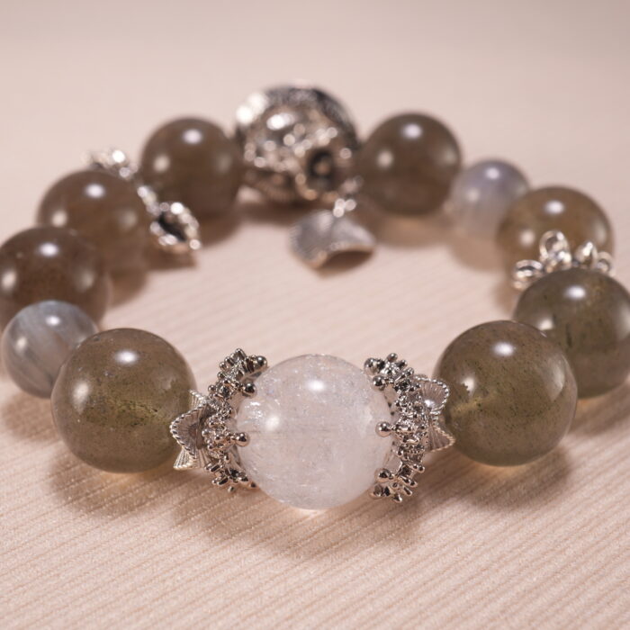This 15 mm bracelet combines the calming properties of gray moonstone and azeztulite quartz to promote restful sleep and emotional healing. Gray moonstone eases stress and fosters tranquility, while azeztulite quartz amplifies energy and enhances spiritual clarity. Together, they create a harmonious energy for a peaceful night’s sleep.