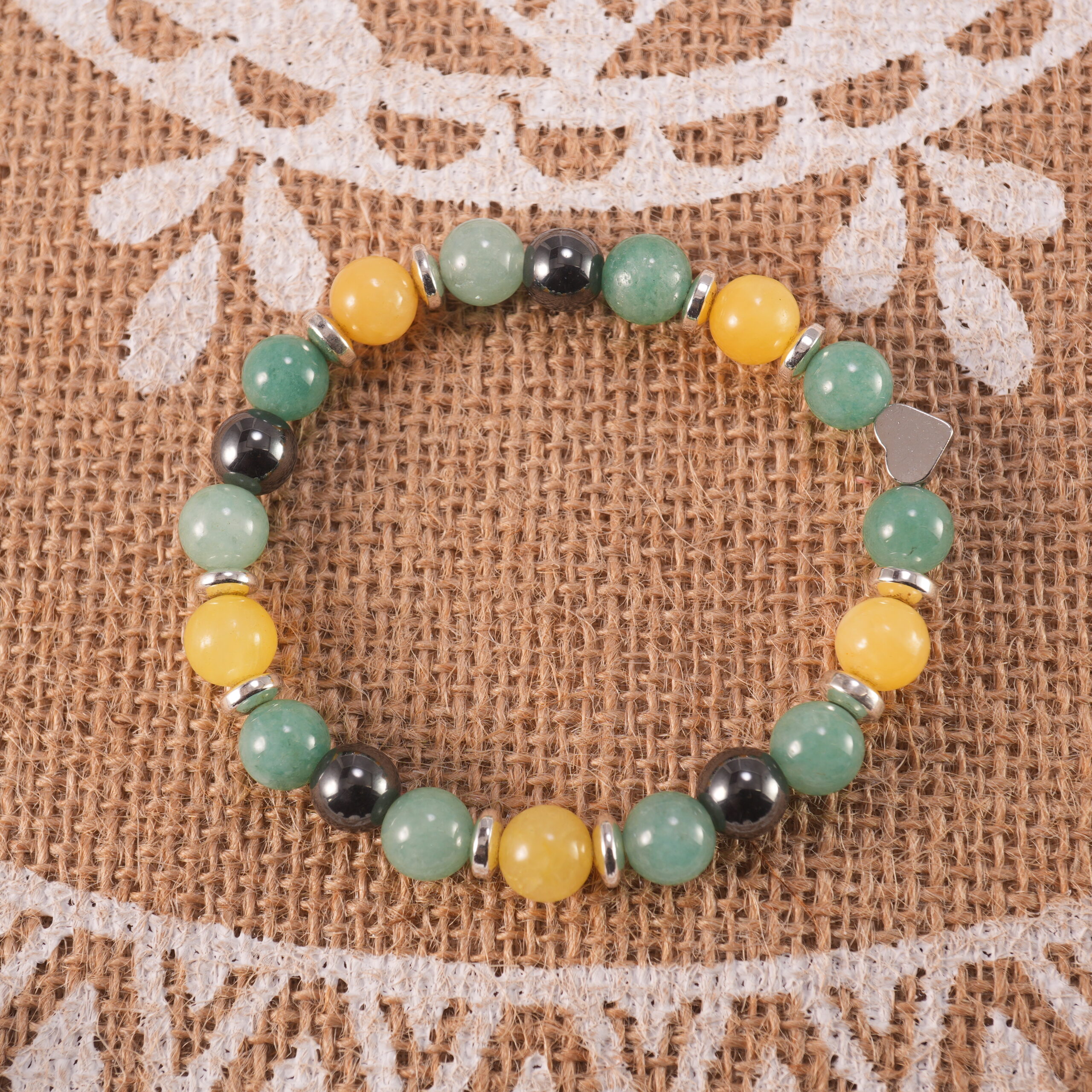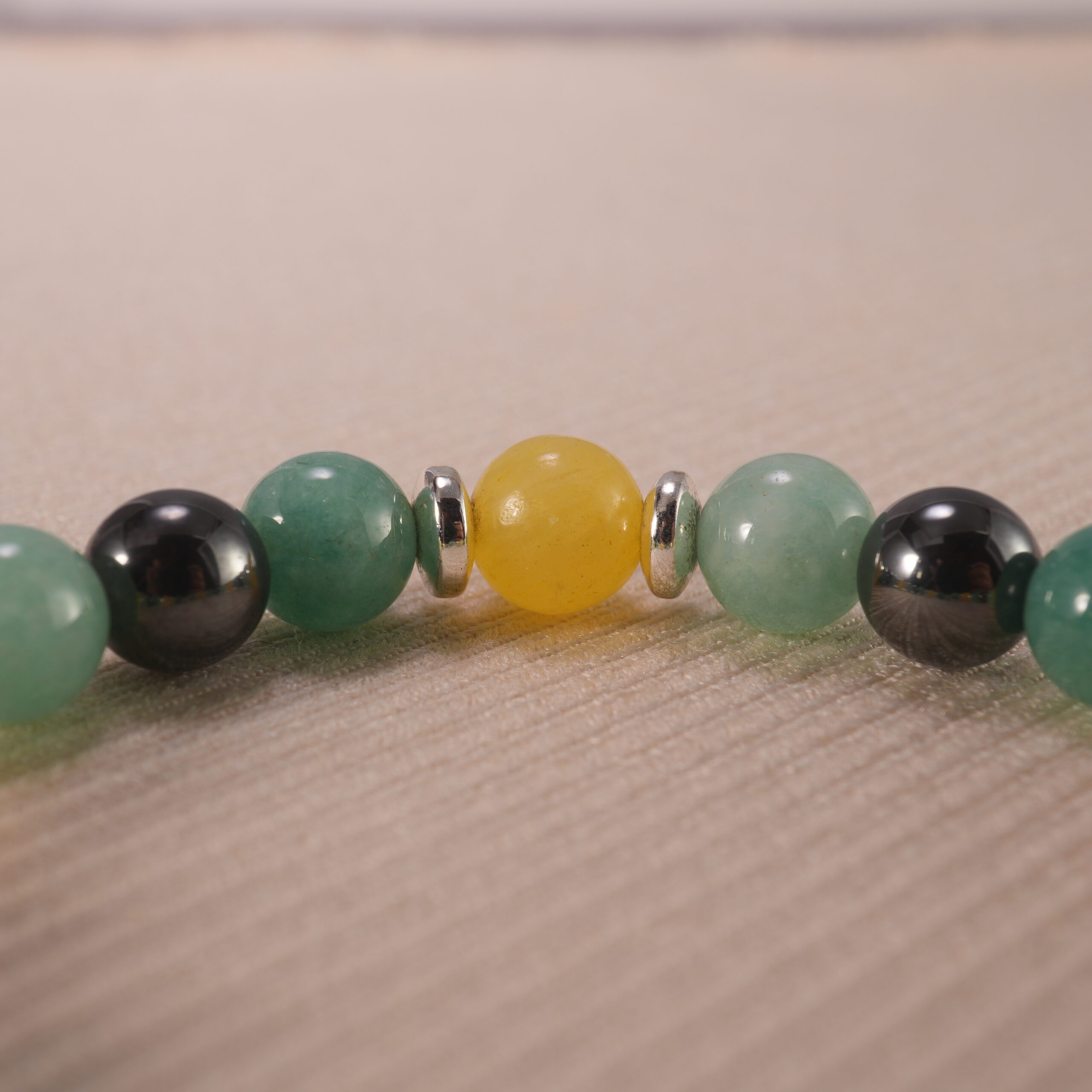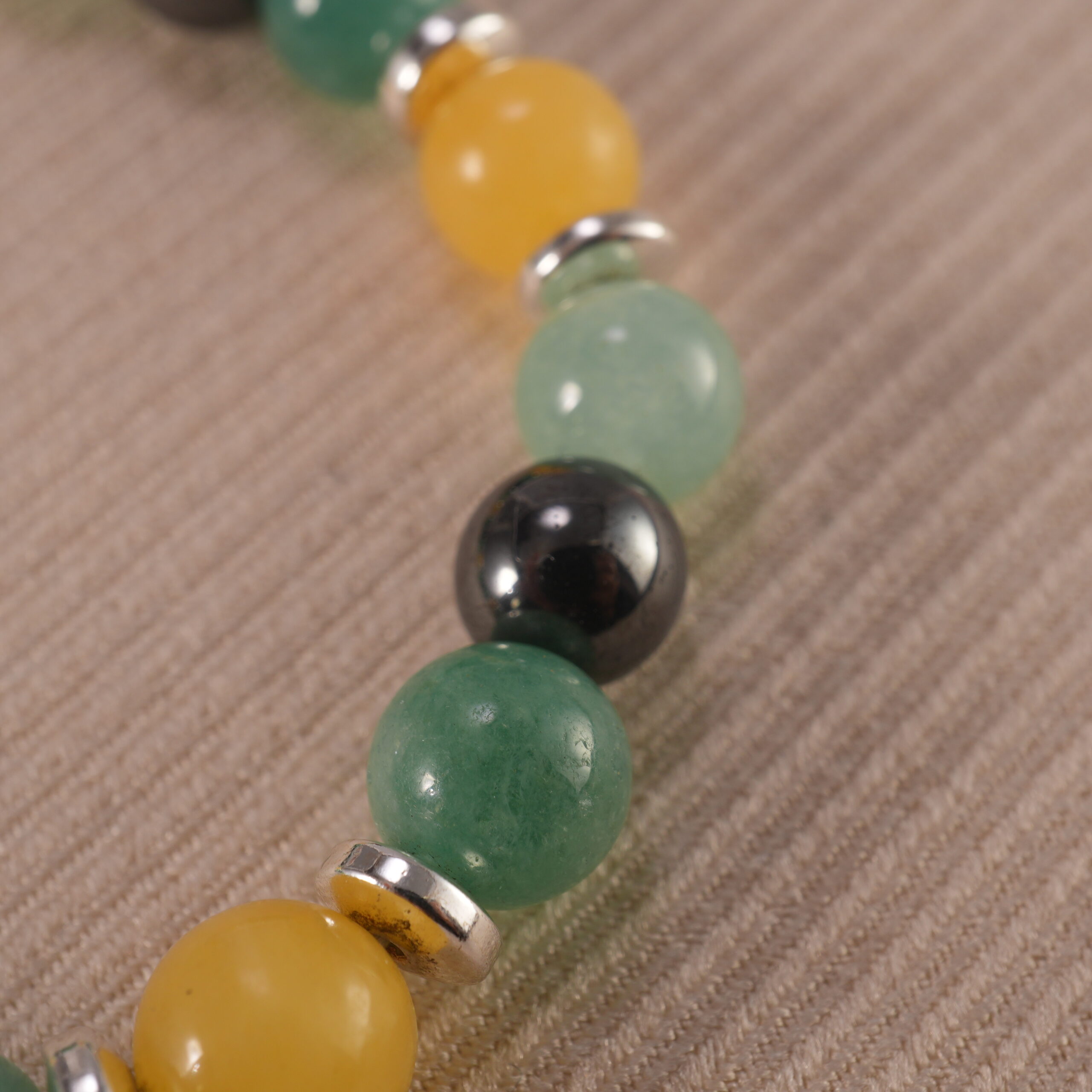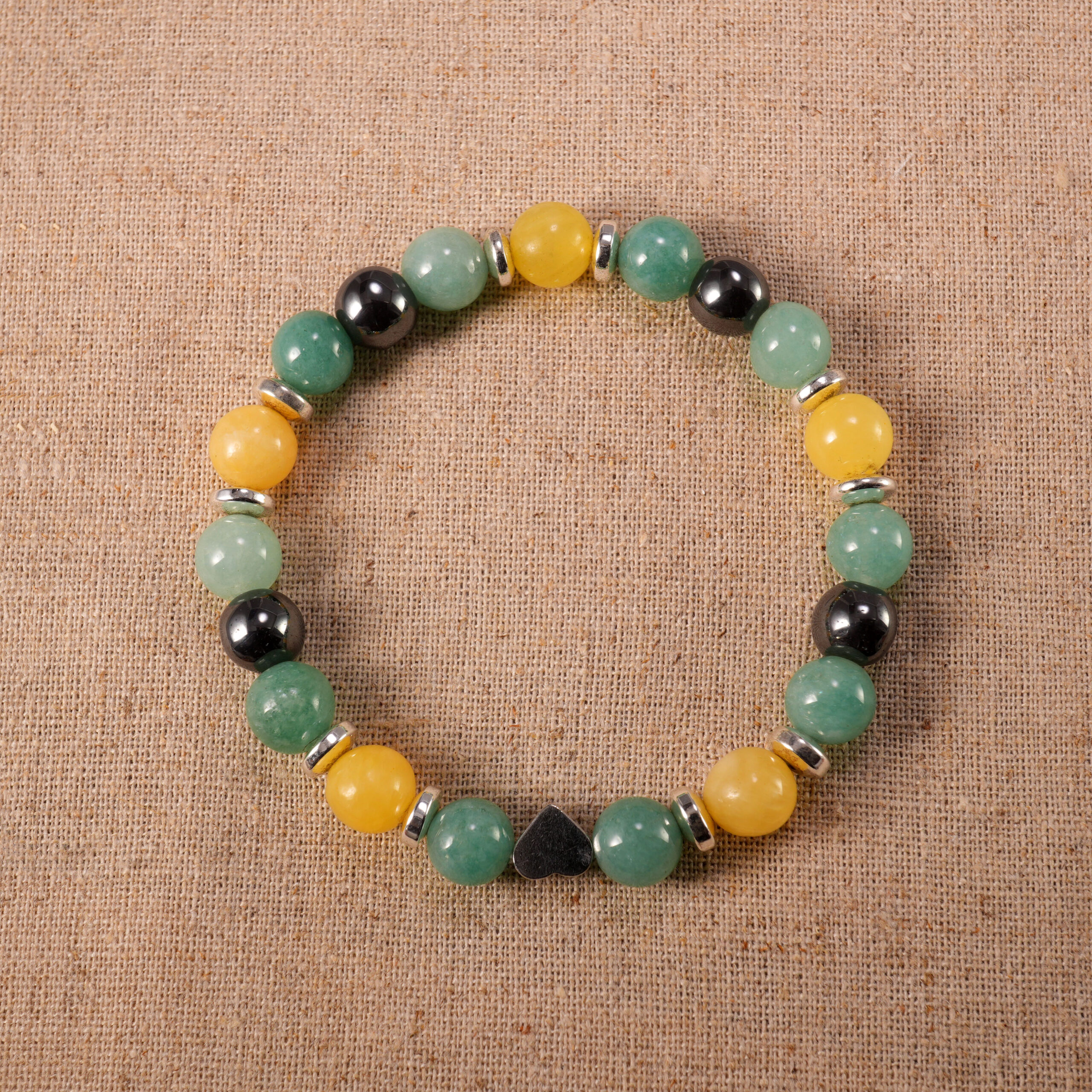 A handmade 8mm beaded bracelet combining green & yellow aventurine with black tourmaline for balance, grounding, and attracting good fortune.