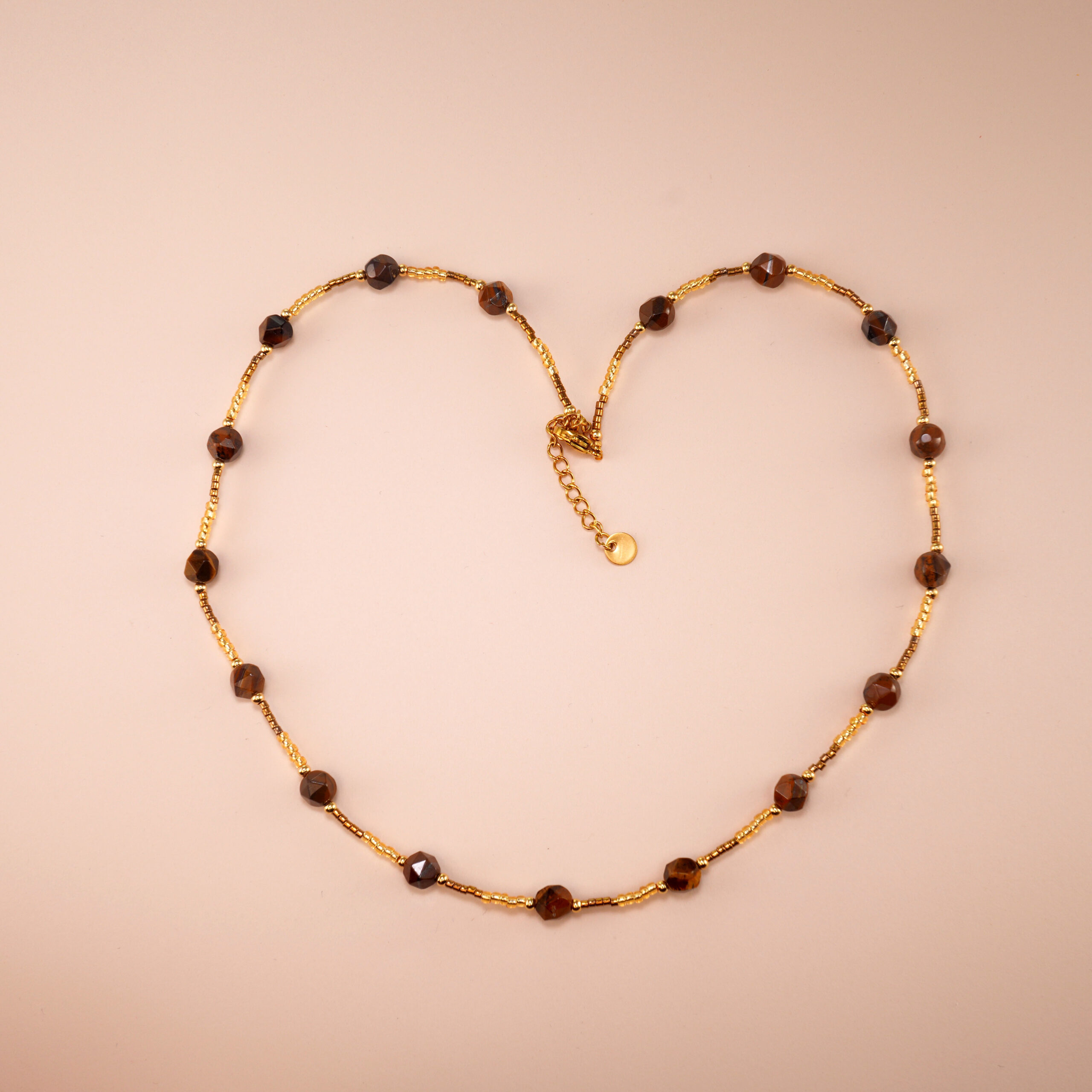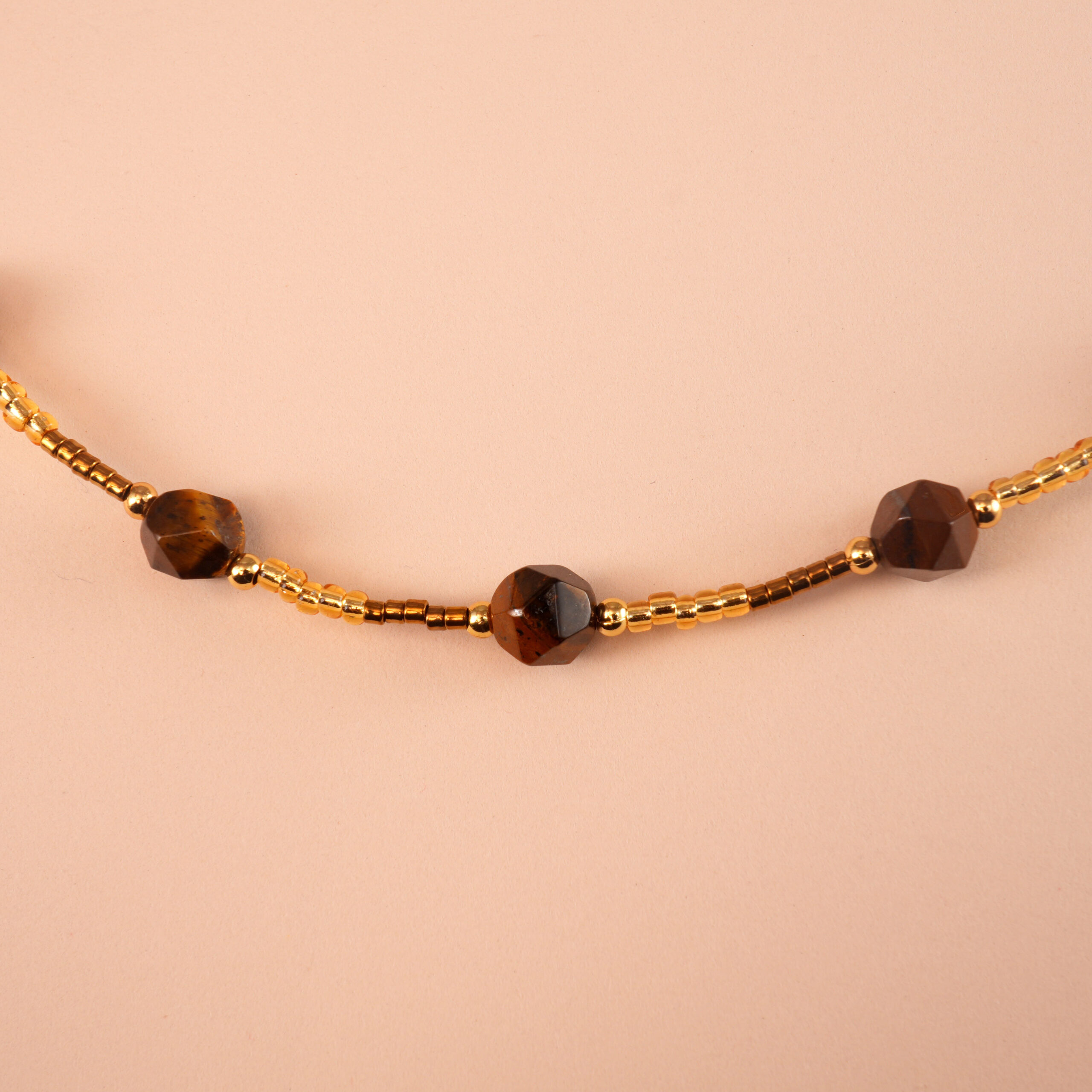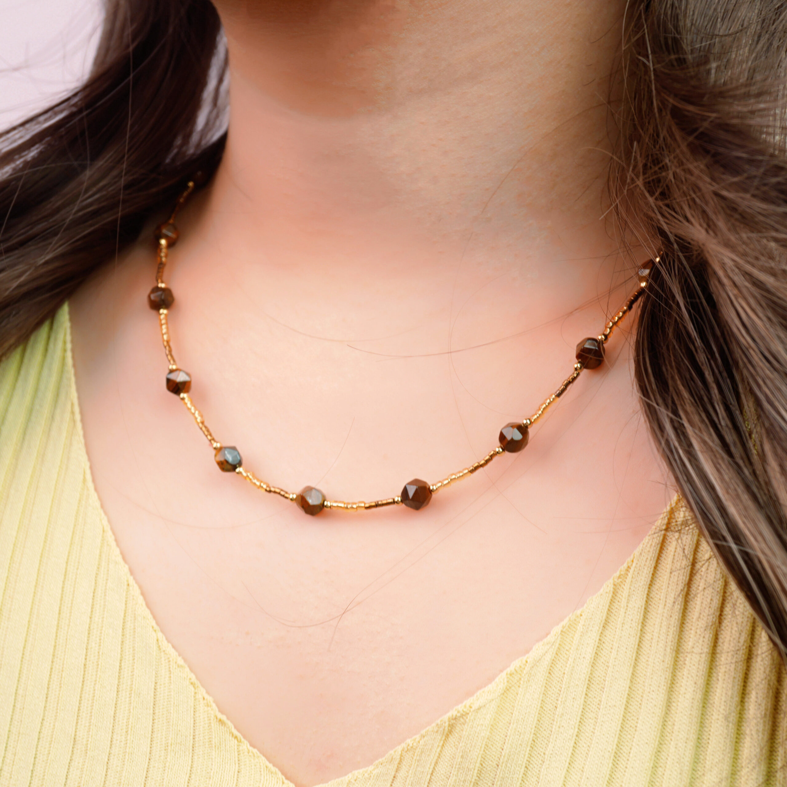 This handmade necklace features faceted tiger eye beads in a dainty chain, catching light with golden-brown hues and signature chatoyancy. Ideal for those who love minimalist style and meaningful energy, it adds subtle charm, balance, strength, confidence, and protection.