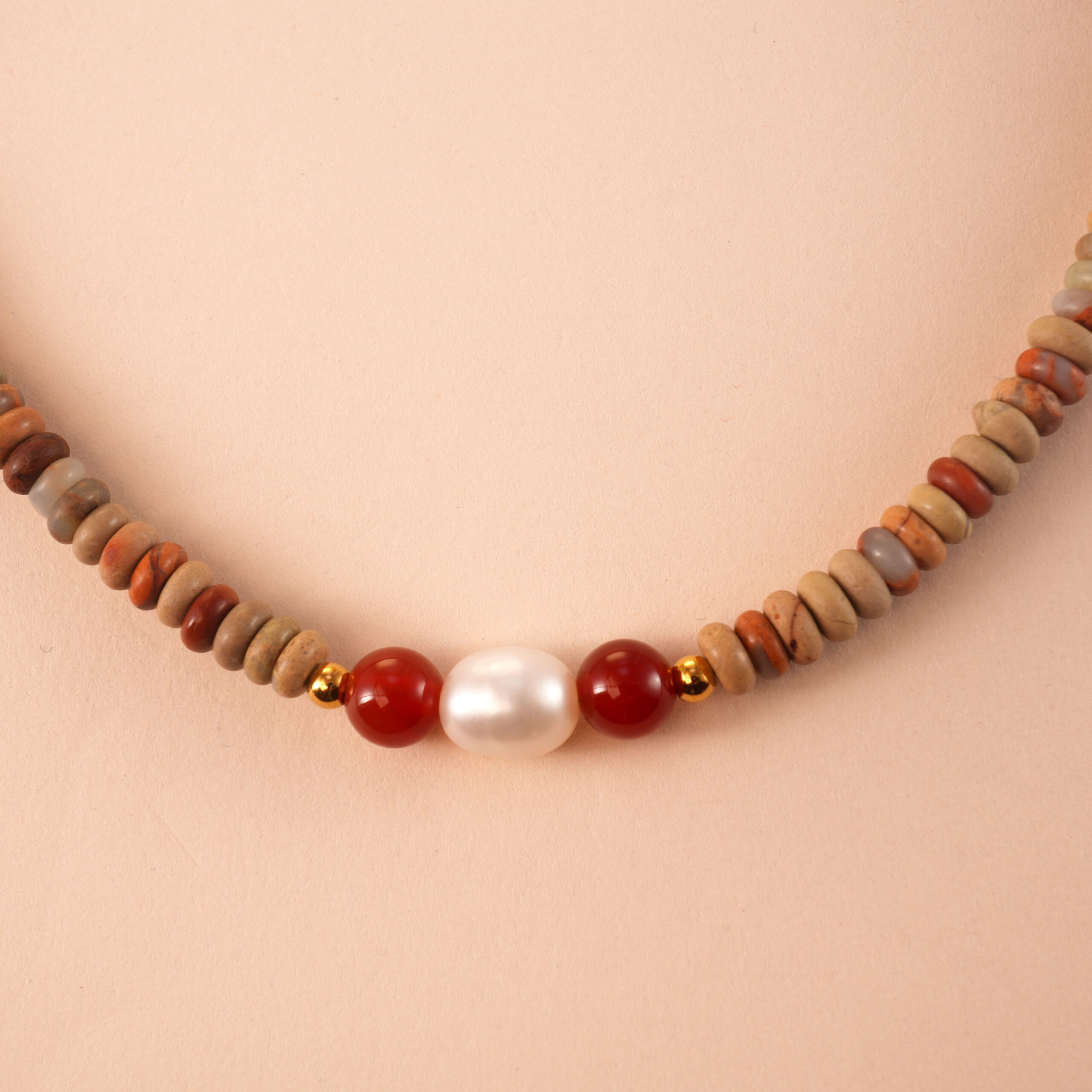 This delicately handcrafted necklace combines the vibrant red agate, calming pearls, and unique landscape stone for a balanced and steady design. The minimalist style exudes effortless elegance, while the energy of these natural stones promotes emotional stability and steadiness.