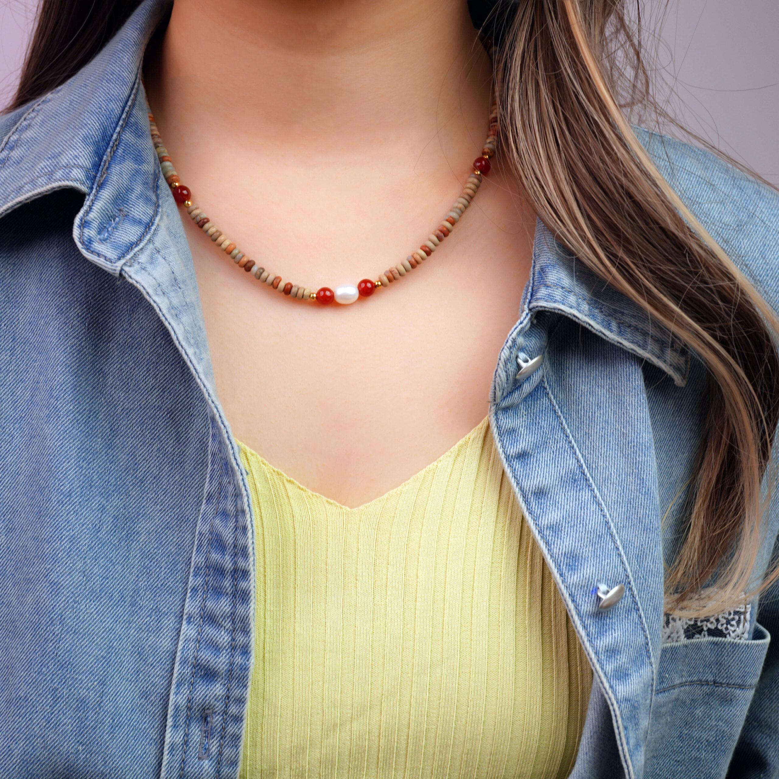 Handmade Landscape Stone, Red Agate & Pearl Necklace