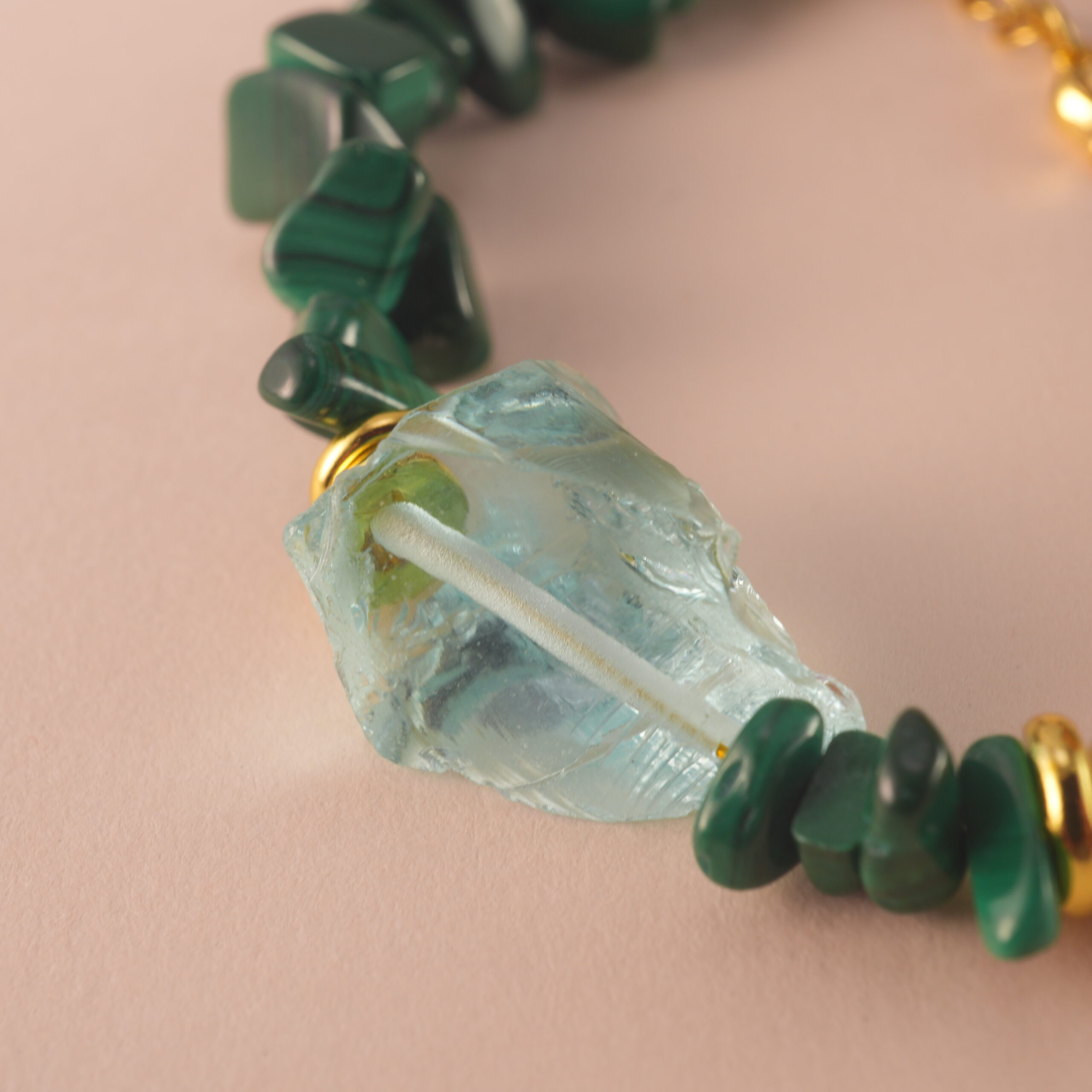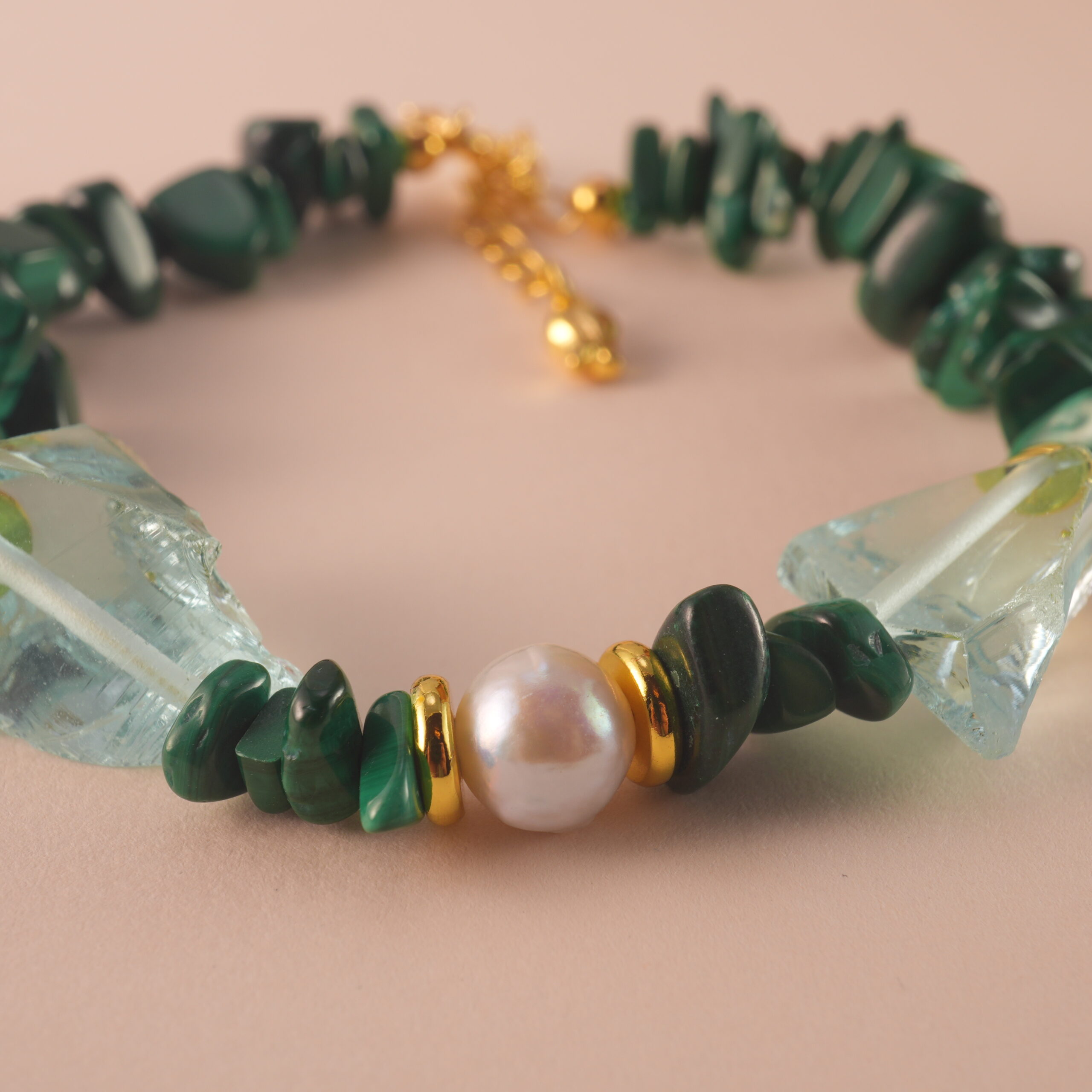 - Includes malachite, aquamarine, and natural freshwater pearls