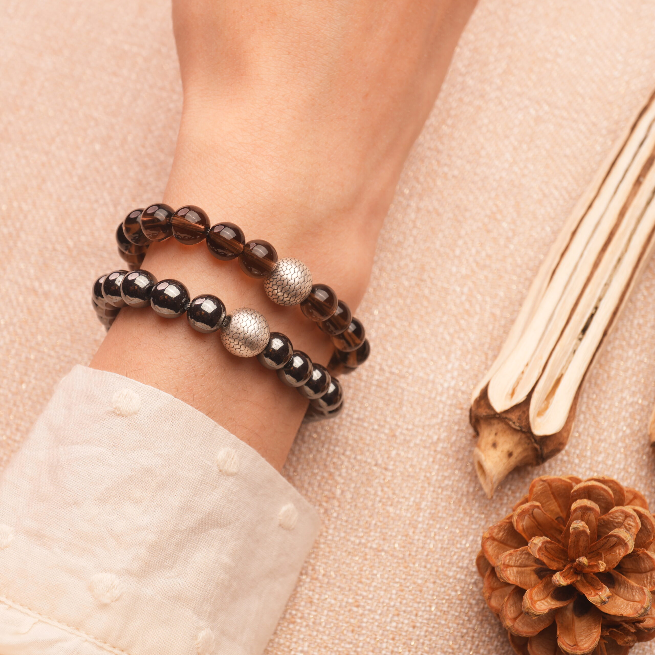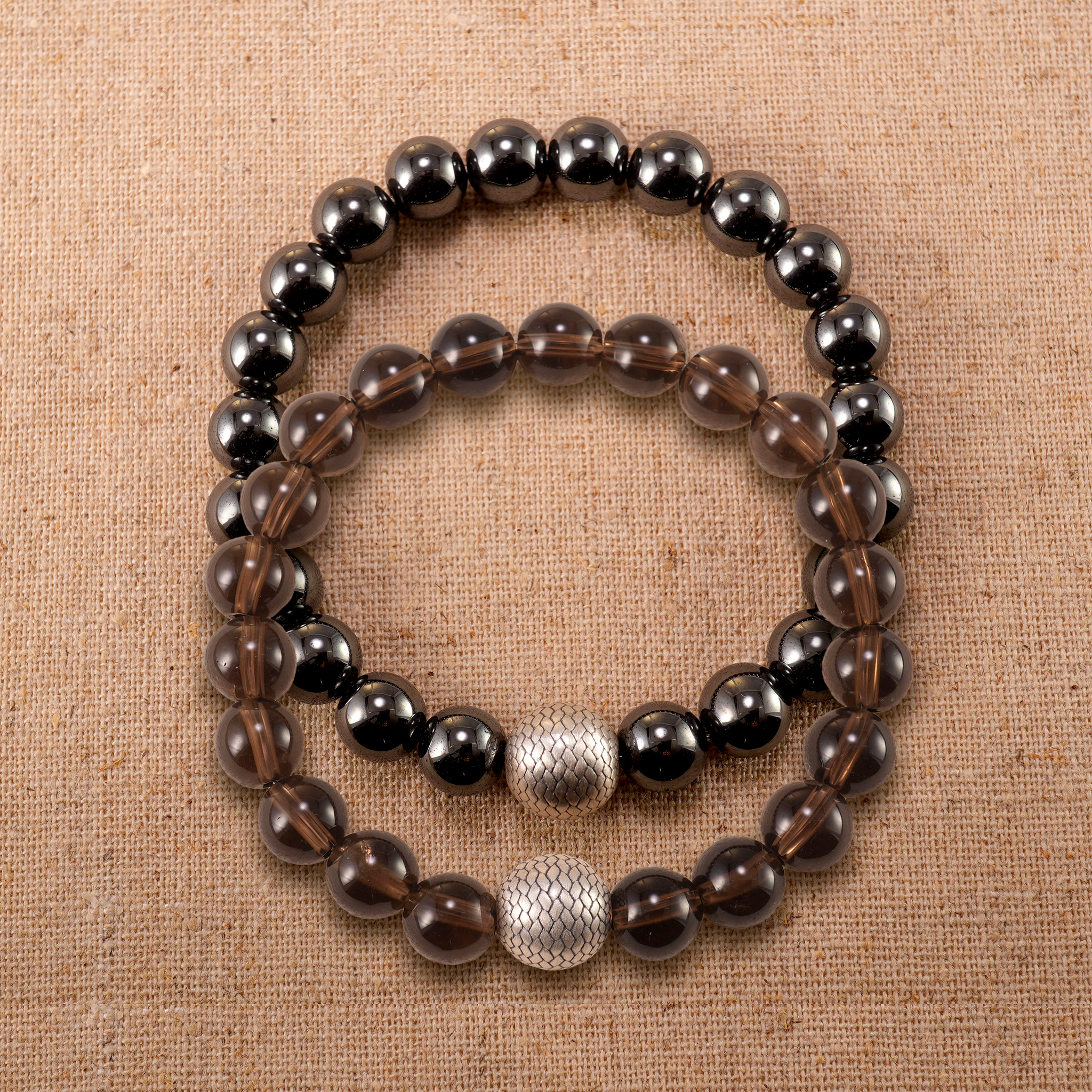 - Elegant bracelet stack featuring hematite and smoky quartz
