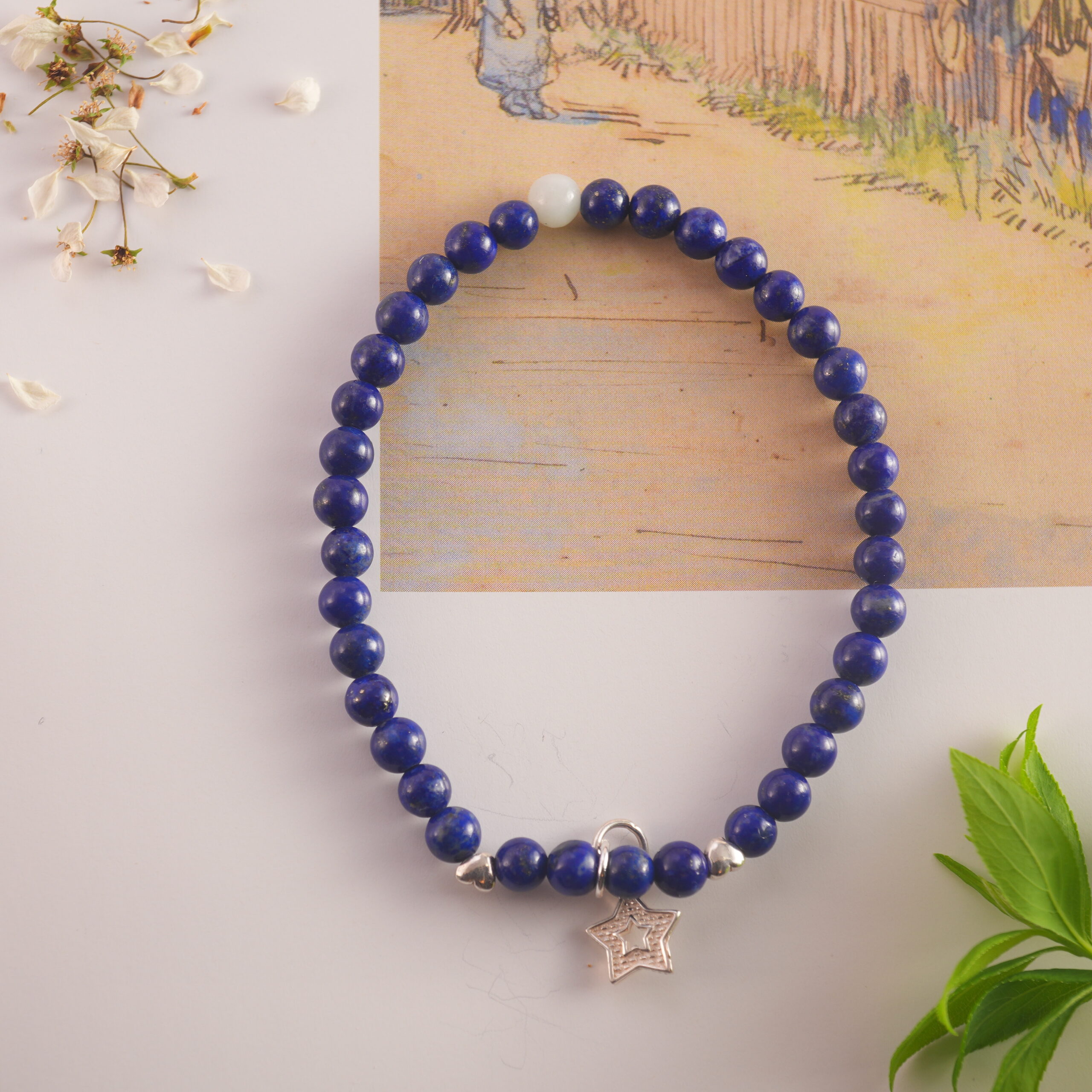 This handcrafted bracelet features genuine lapis lazuli and white chalcedony beads, paired with a delicate star charm and a sleek S925 sterling silver clasp. Designed to inspire creativity and emotional clarity, it’s the perfect accessory for those seeking balance, beauty, and meaning in their jewelry.