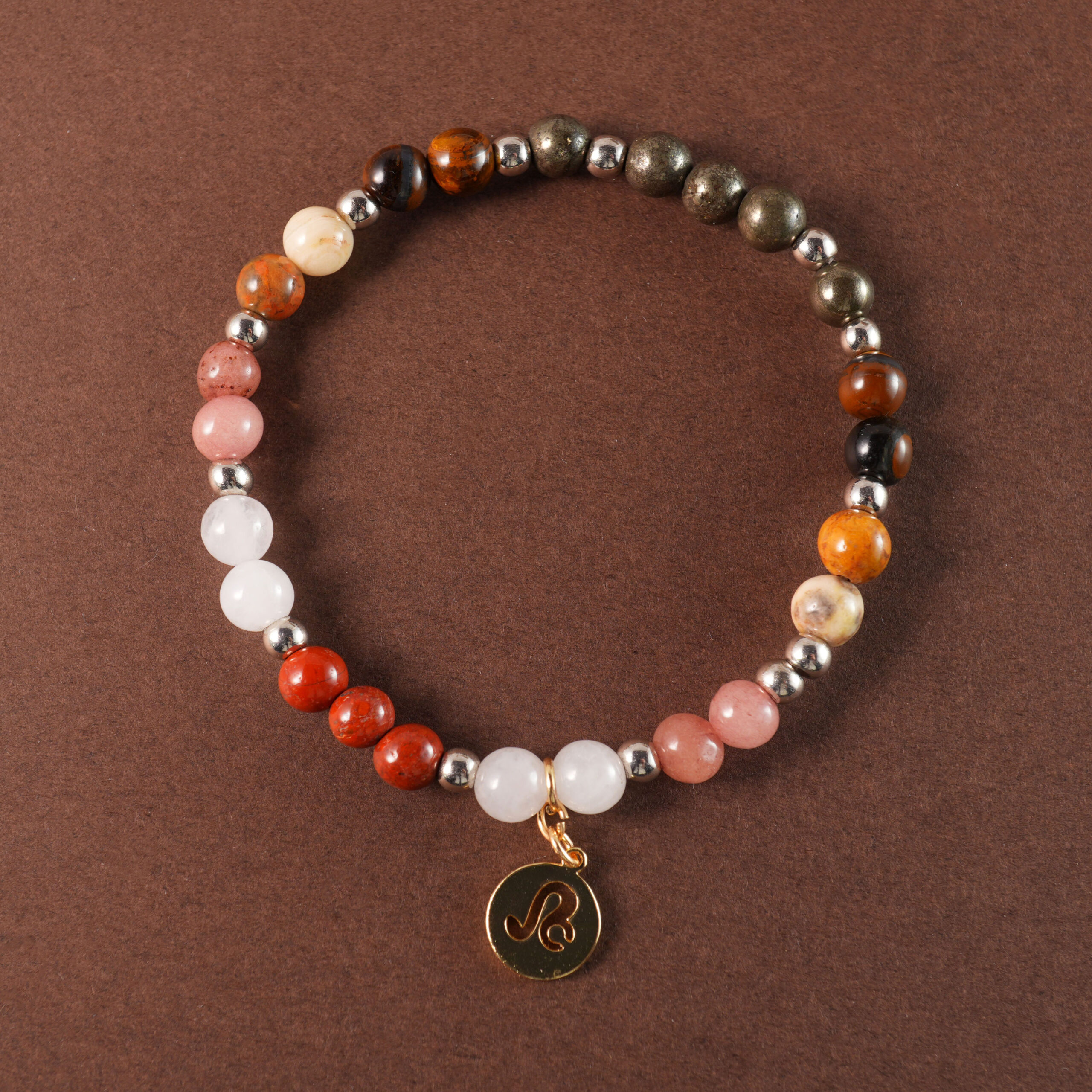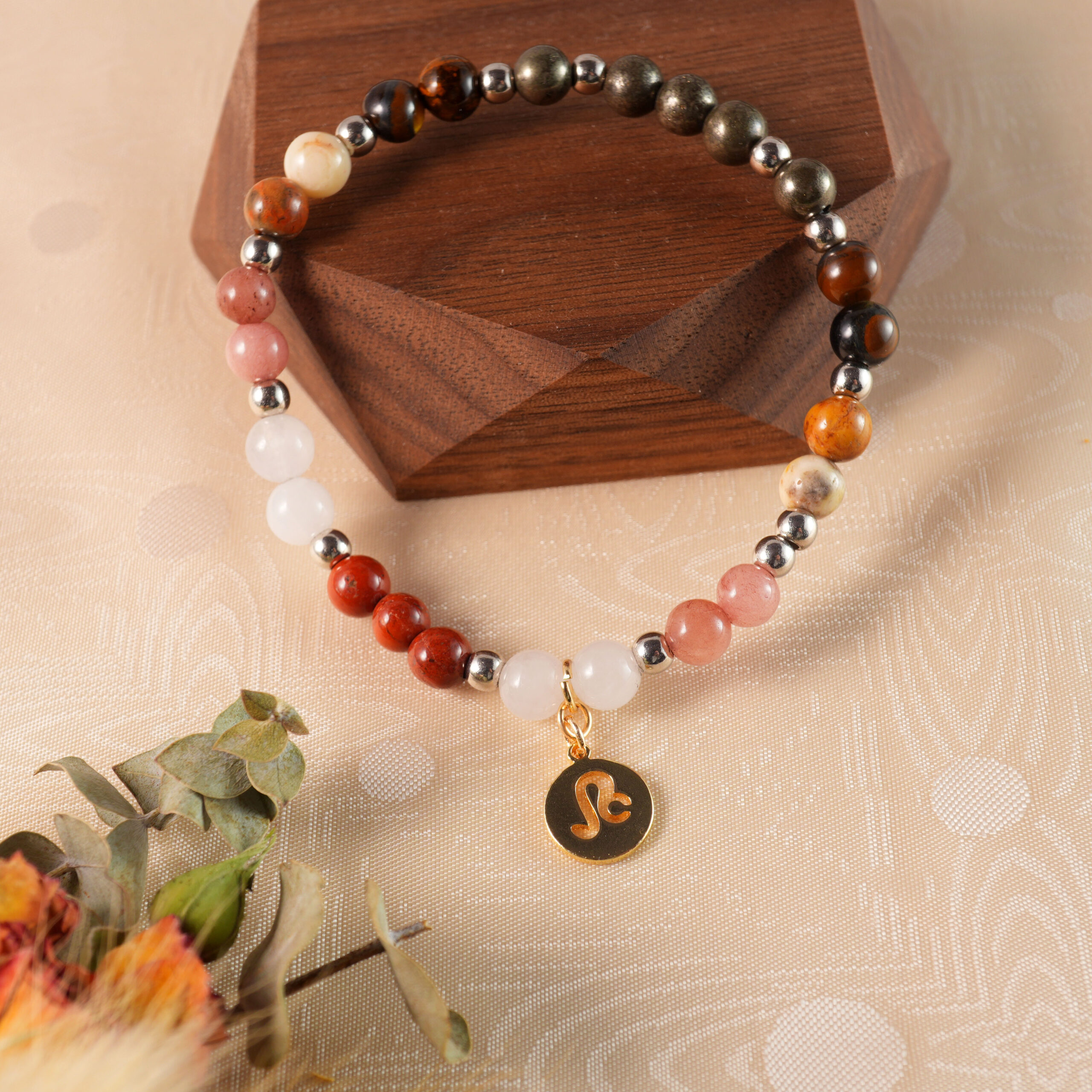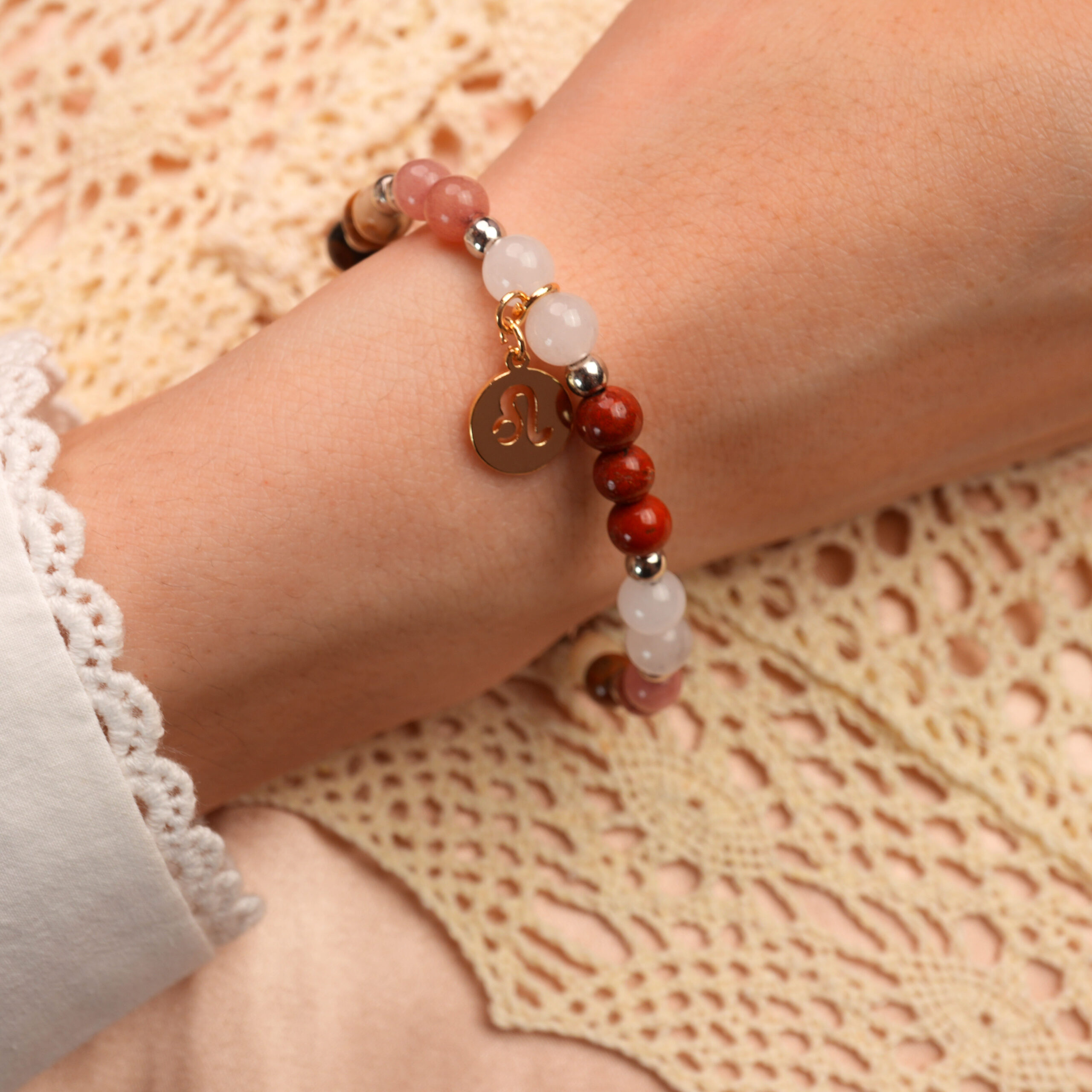 Leo jewelry bracelet featuring genuine red jasper, crazy lace agate, strawberry quartz, and tiger eye beads. Adjustable design supports strength, creativity, and emotional clarity.