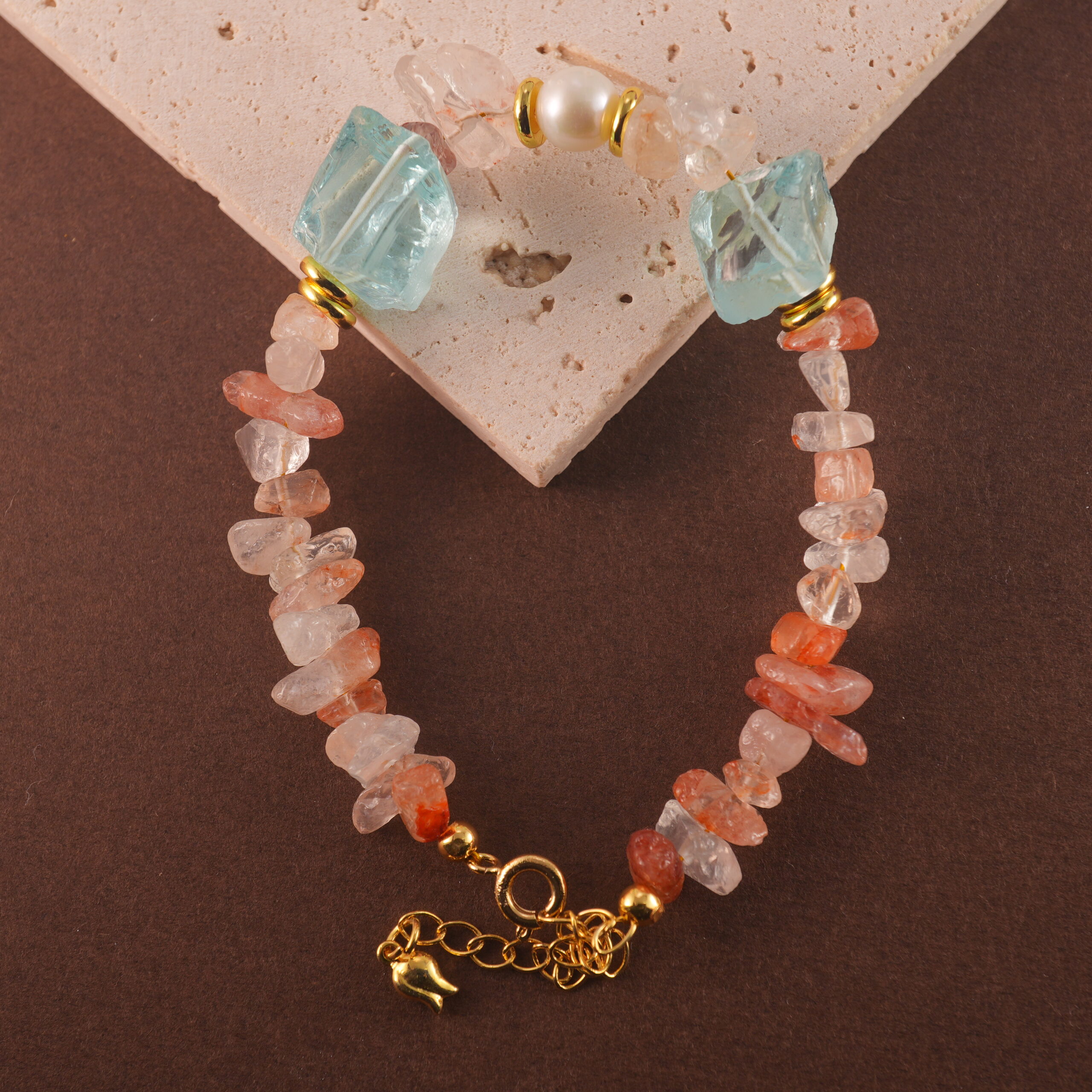 A radiant Leo bracelet with fire quartz, aquamarine, and freshwater pearls—handmade to ignite confidence, warmth, and heart-centered expression.