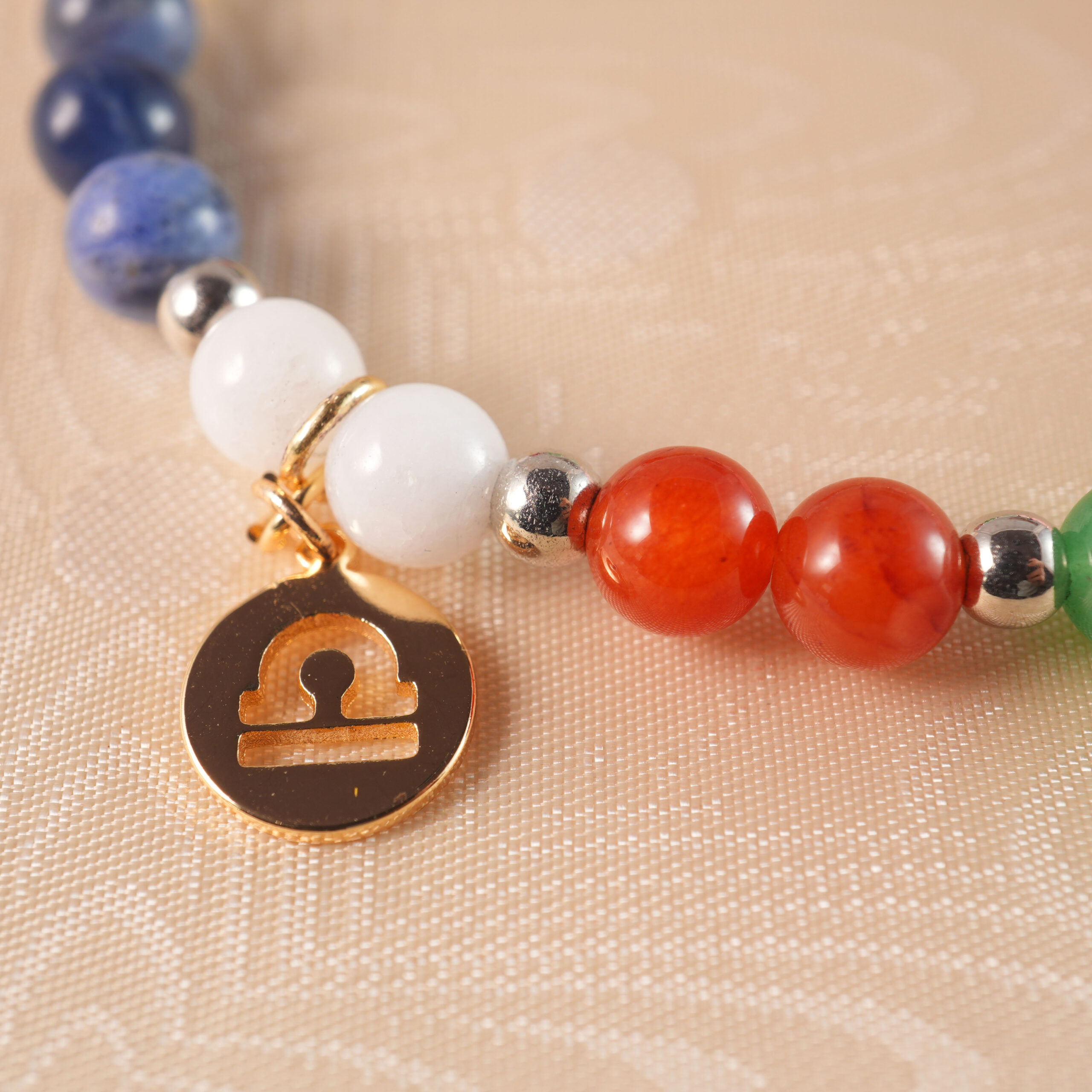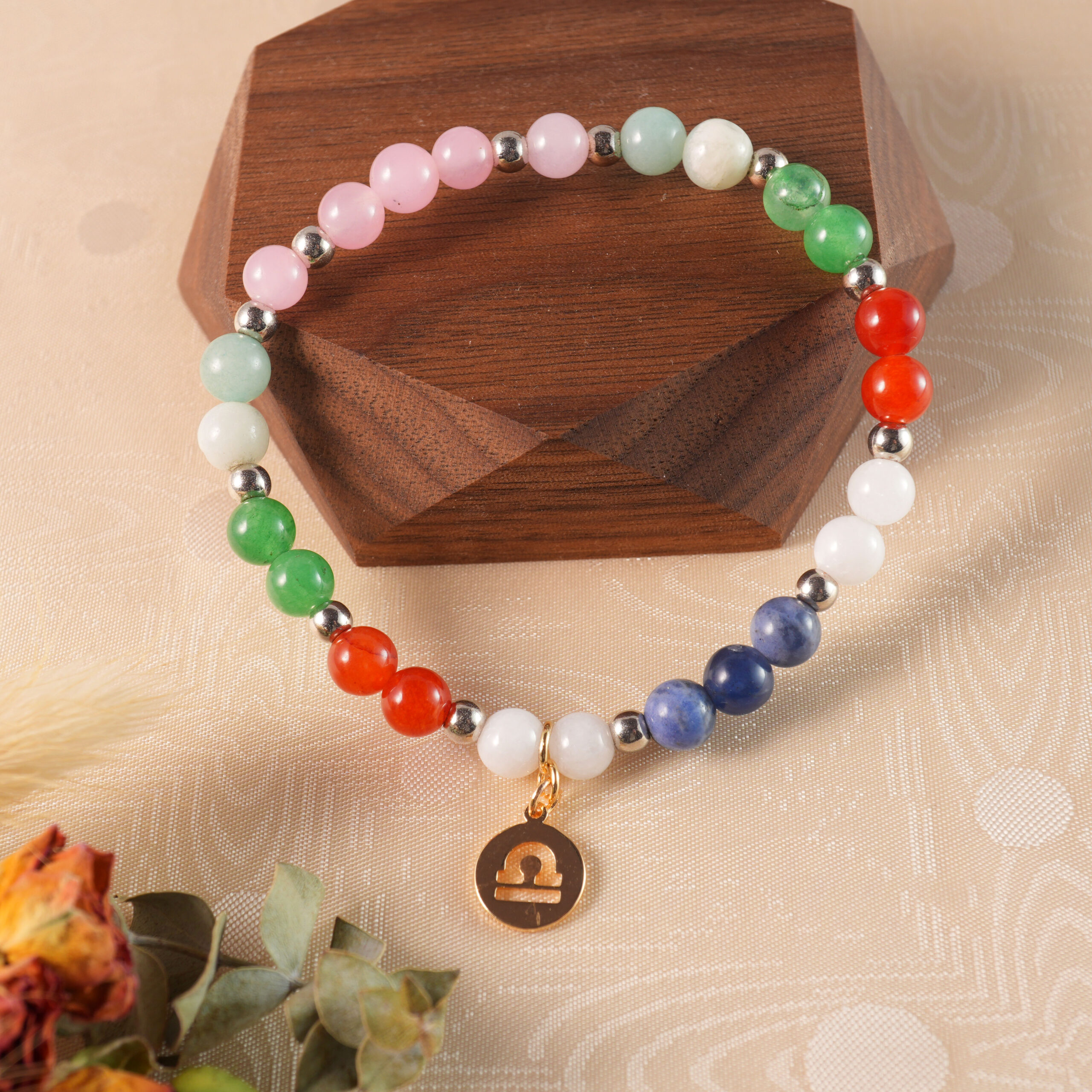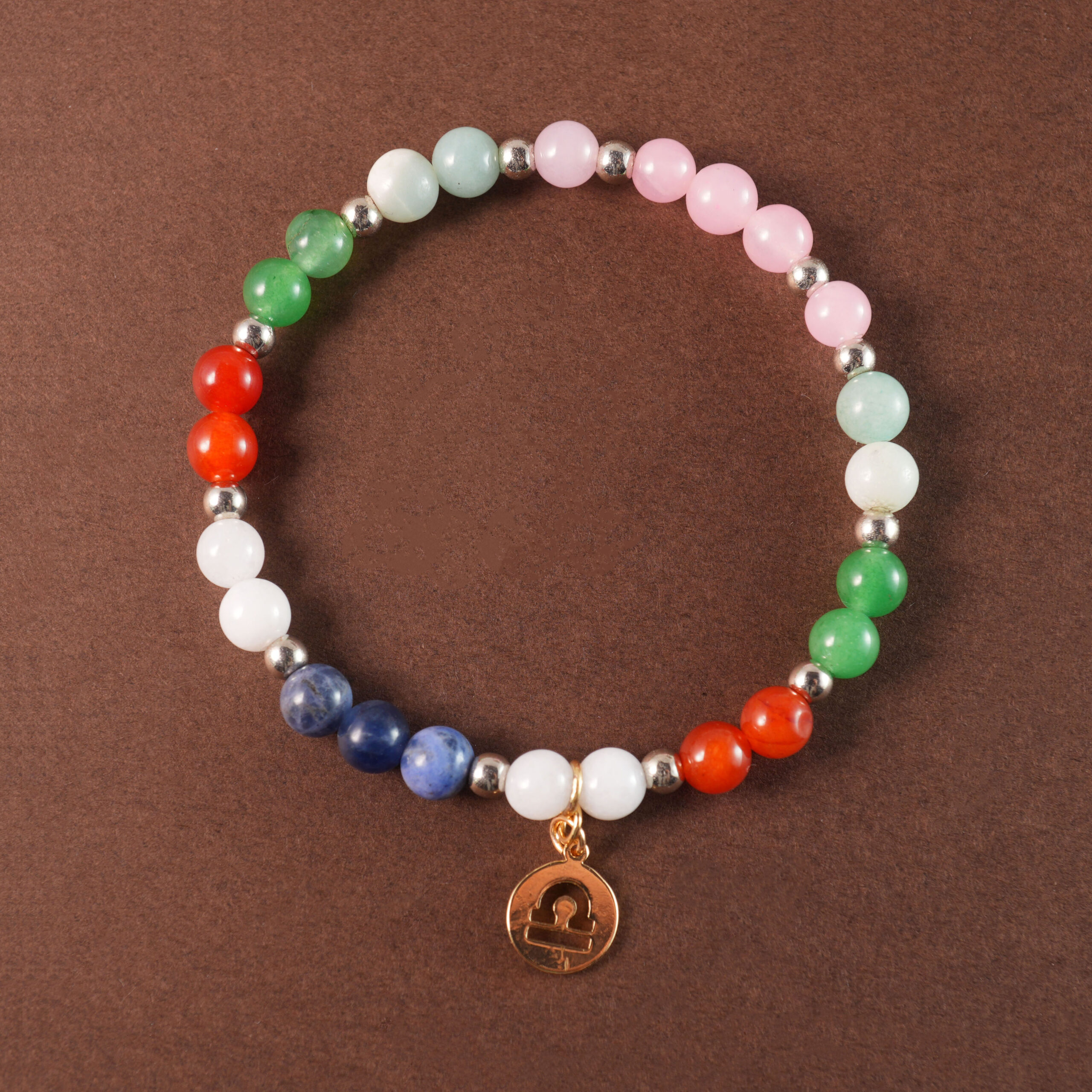 Libra jewelry bracelet featuring rose quartz, amazonite, green aventurine, red jasper, and blue lace agate. Promotes love, clarity, and emotional harmony with an elegant, adjustable design.