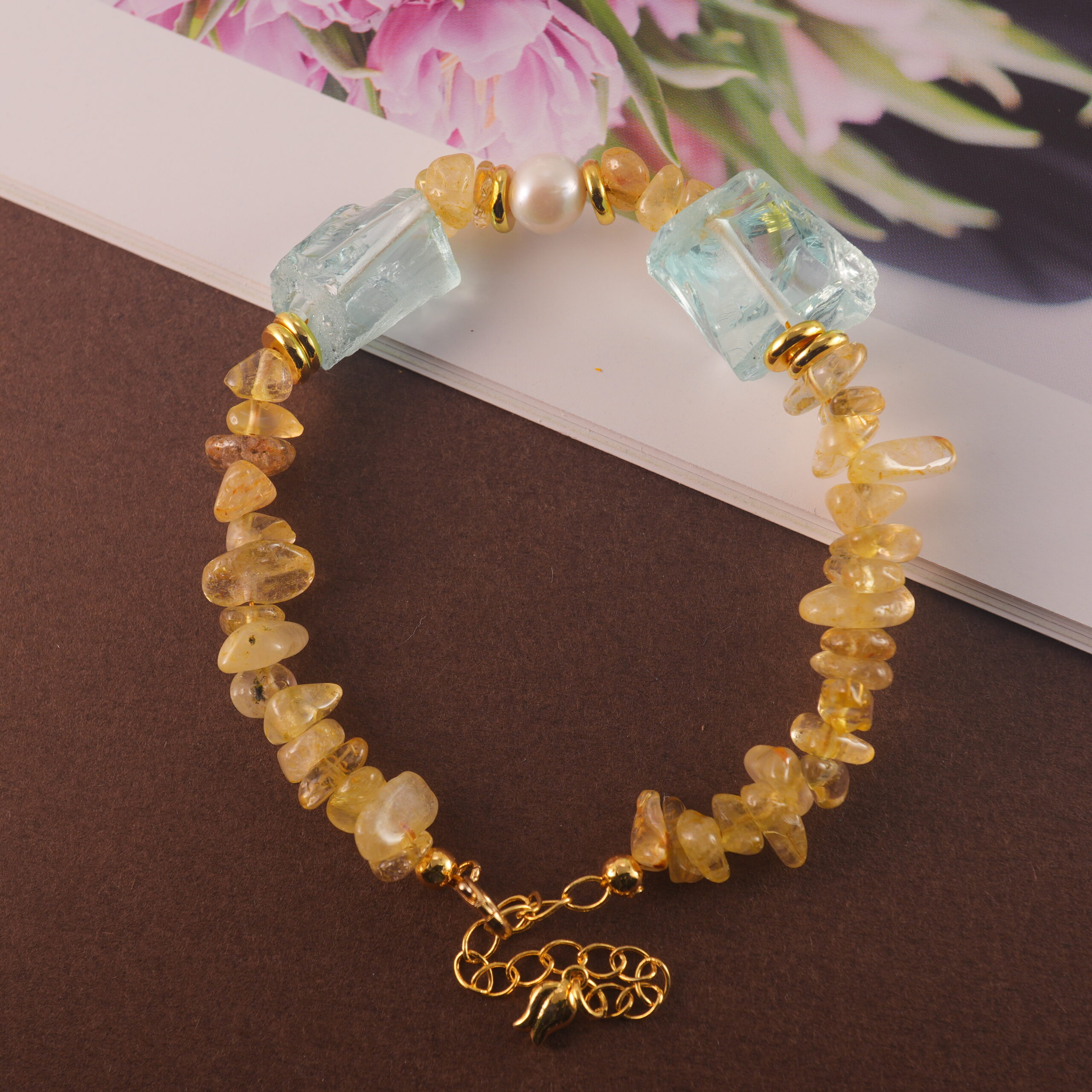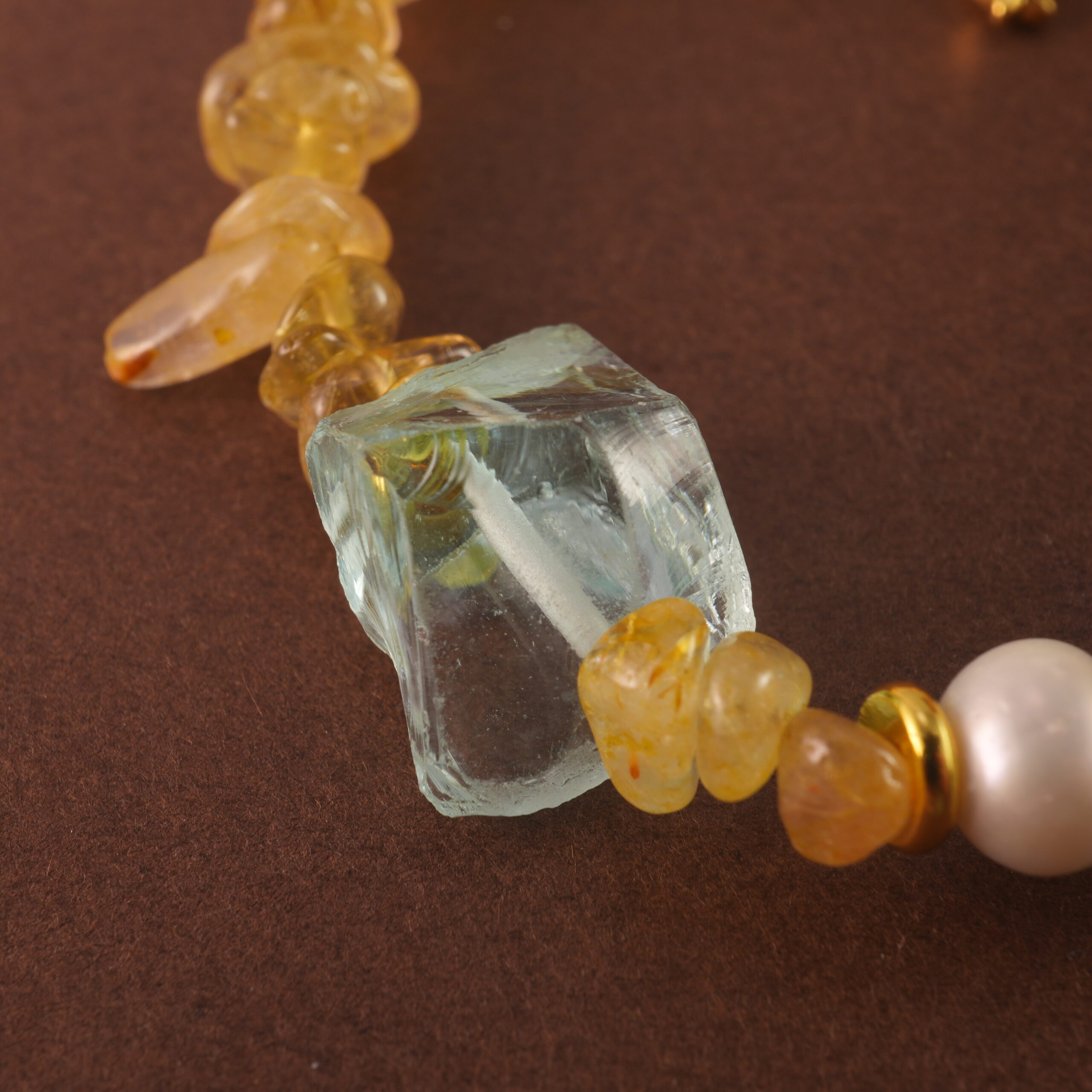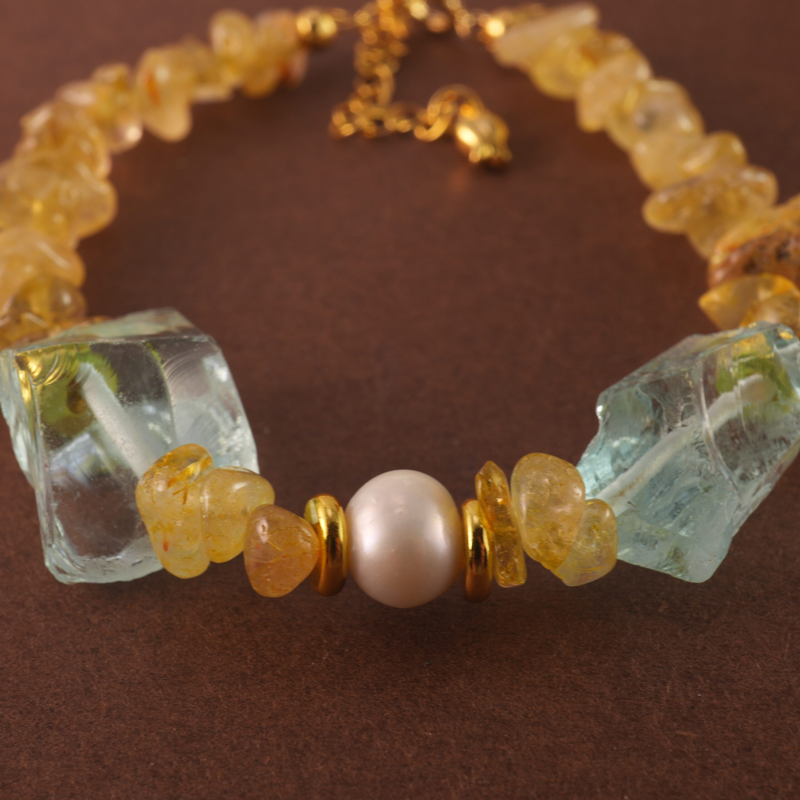 - Handcrafted with golden rutilated quartz, aquamarine, and freshwater pearls