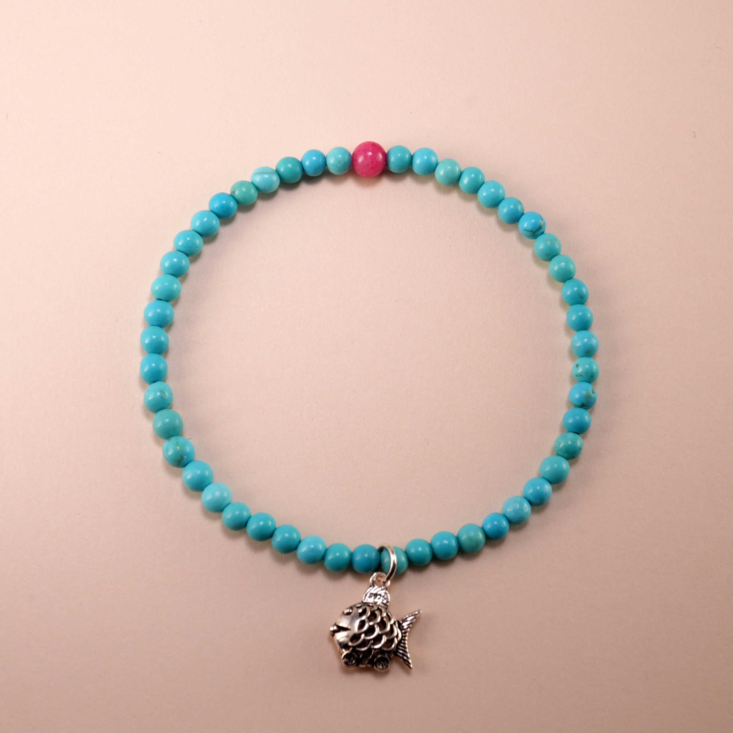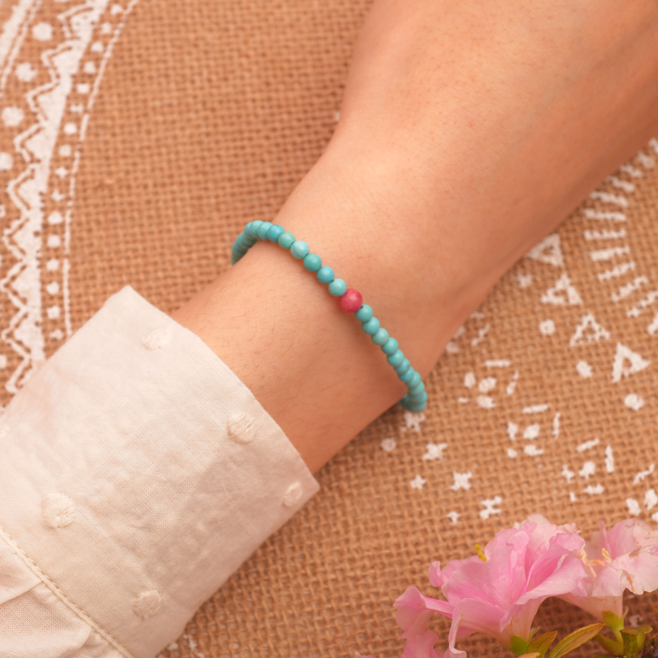 Made with 4mm turquoise and rhodochrosite beads, this bracelet combines the protective properties of turquoise with the heart-healing energy of rhodochrosite. Turquoise brings good luck and shields from negative energy, while rhodochrosite enhances emotional healing and encourages love. Together, they create a perfect balance of positivity and protection.