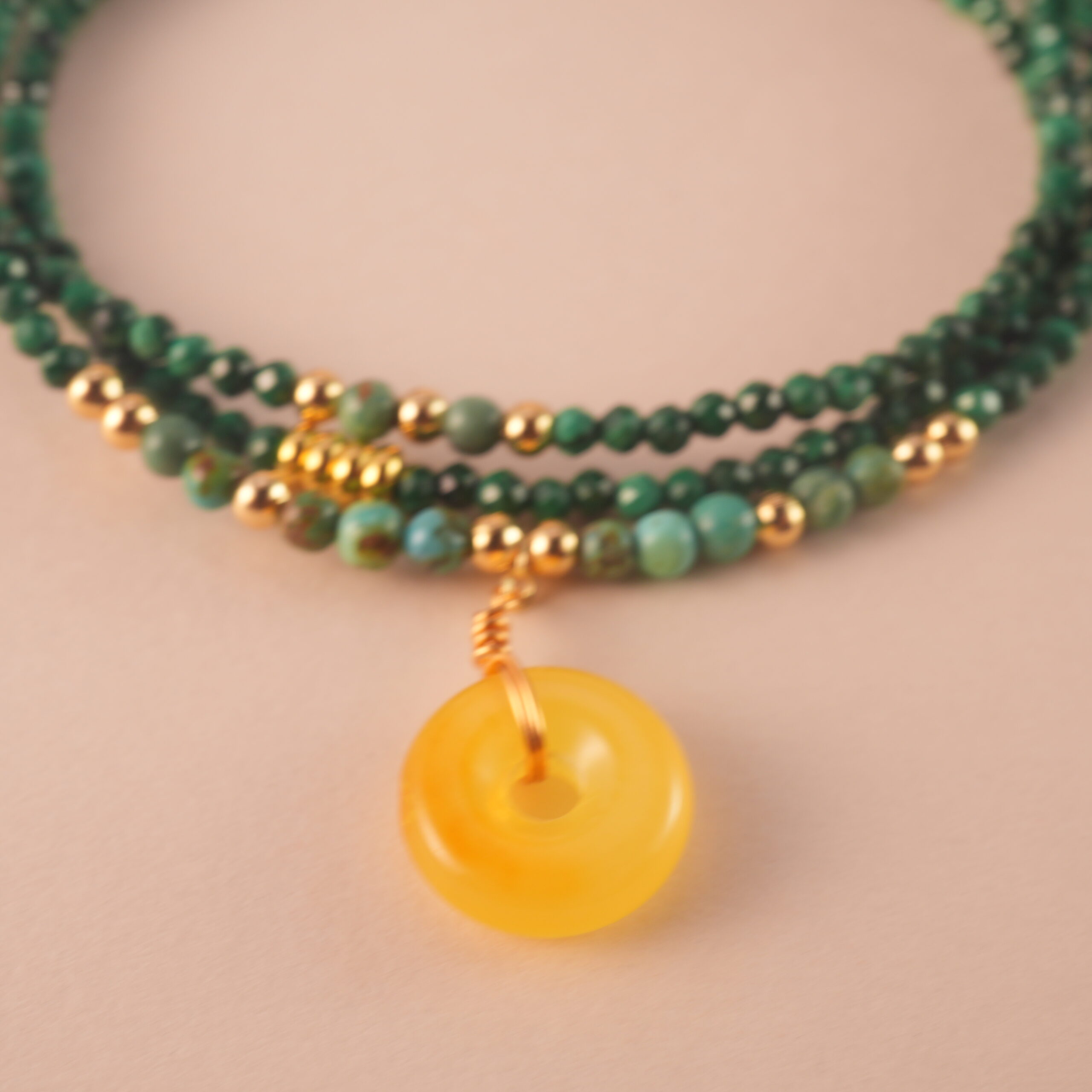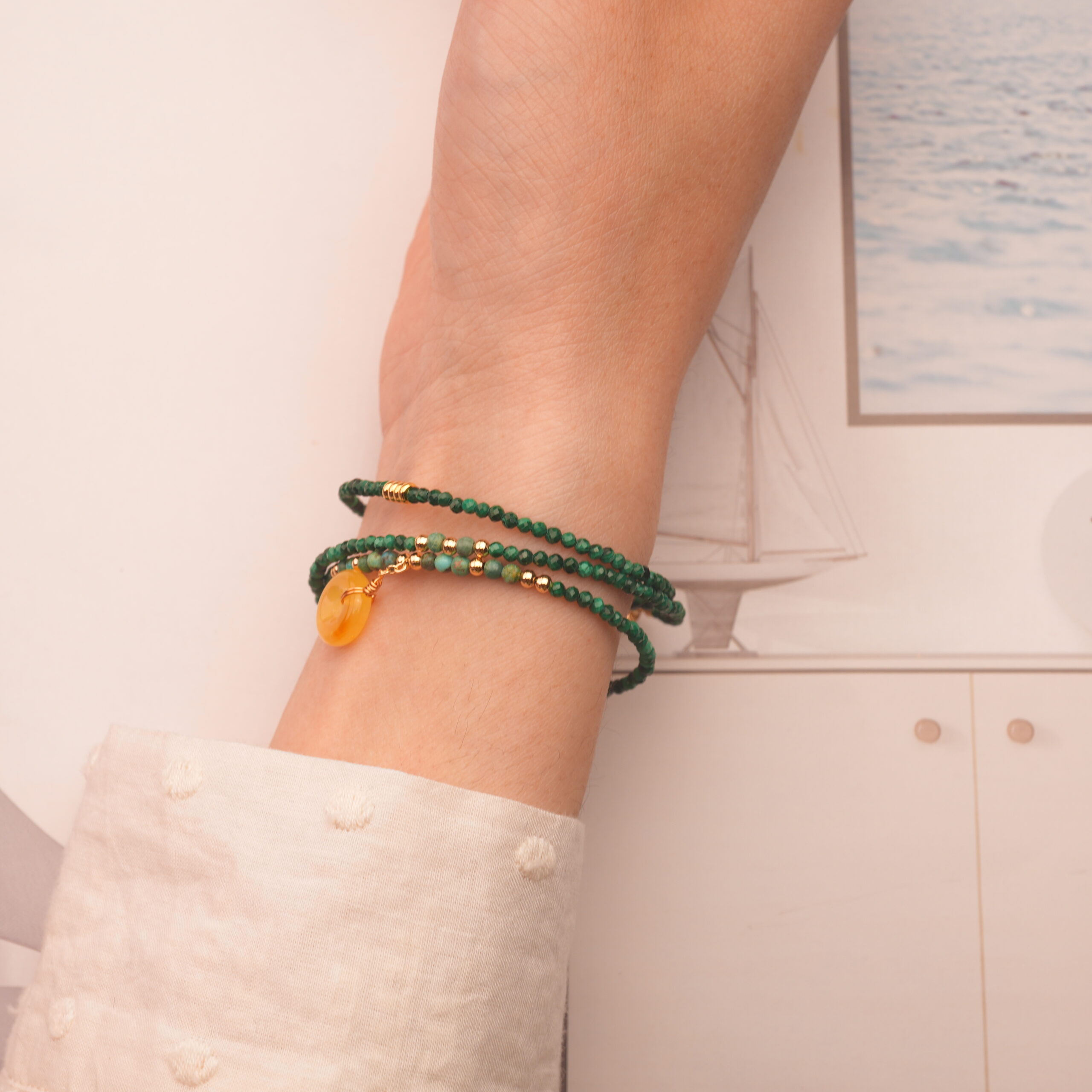 This malachite crystal wrap bracelet empowers transformation and inner strength. Its vibrant green beads wrap three times around the wrist or shine as a necklace—dainty, bold, and full of energy.
