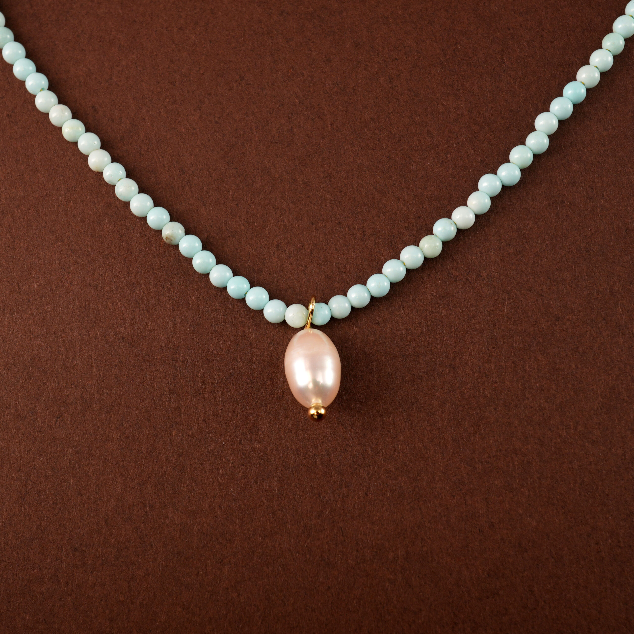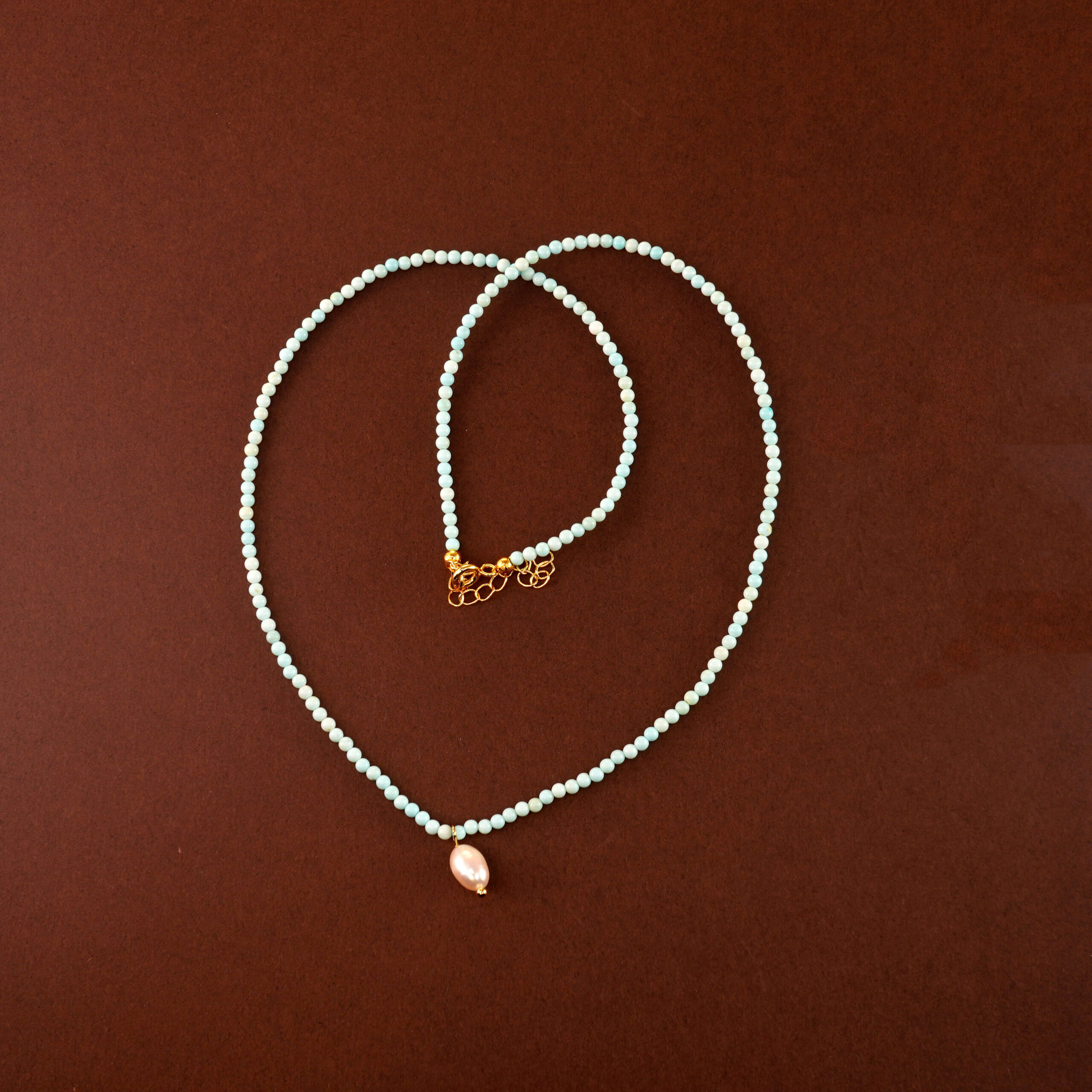 This minimalist necklace features soft mint green freshwater pearls hand-strung into a refreshing and elegant piece. Each subtly shimmering bead evokes the serenity of water, offering a gentle twist on the classic pearl necklace. Perfect for those who seek calming energy and effortless style.