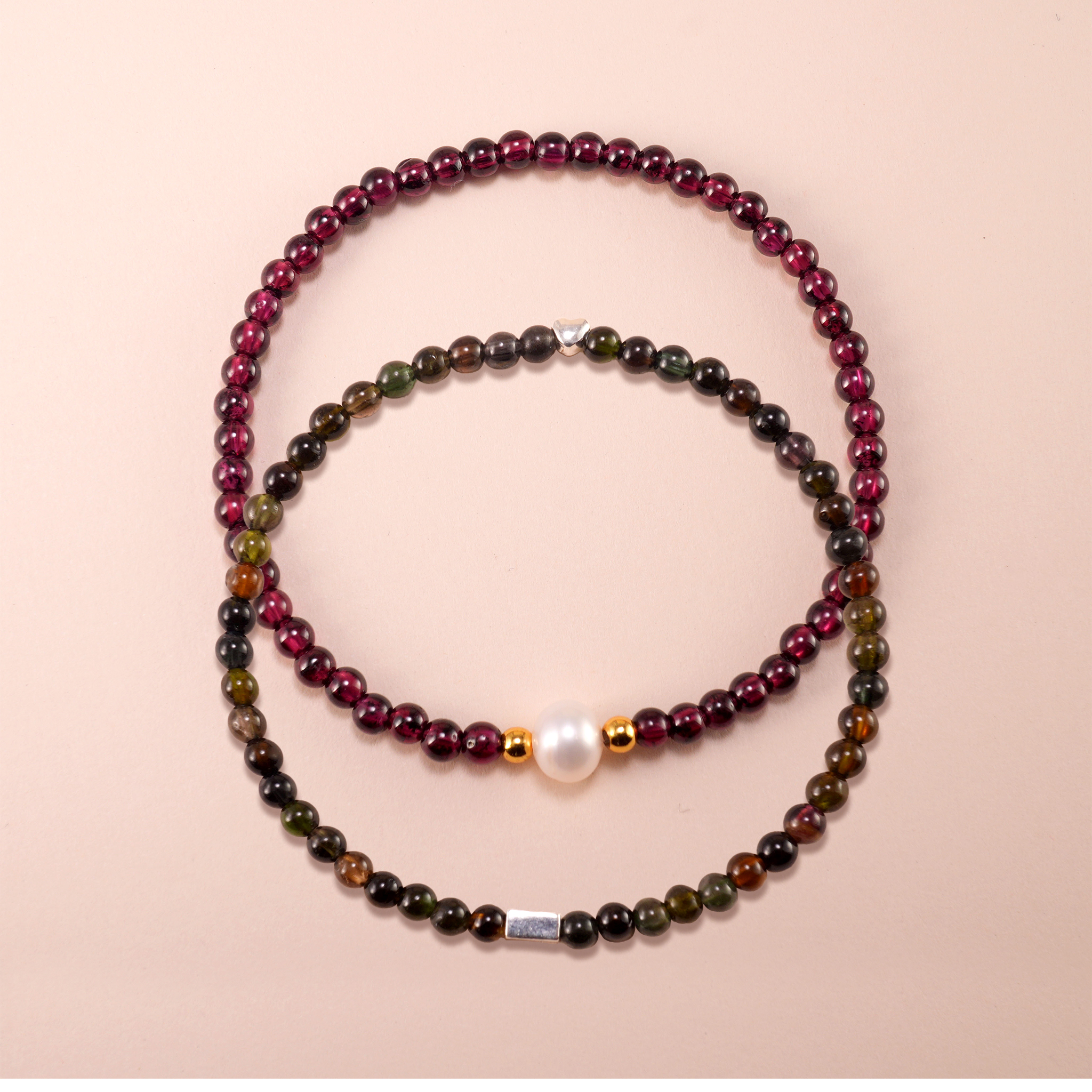 - Stacked bracelet set featuring garnet, freshwater pearl, and colorful tourmaline