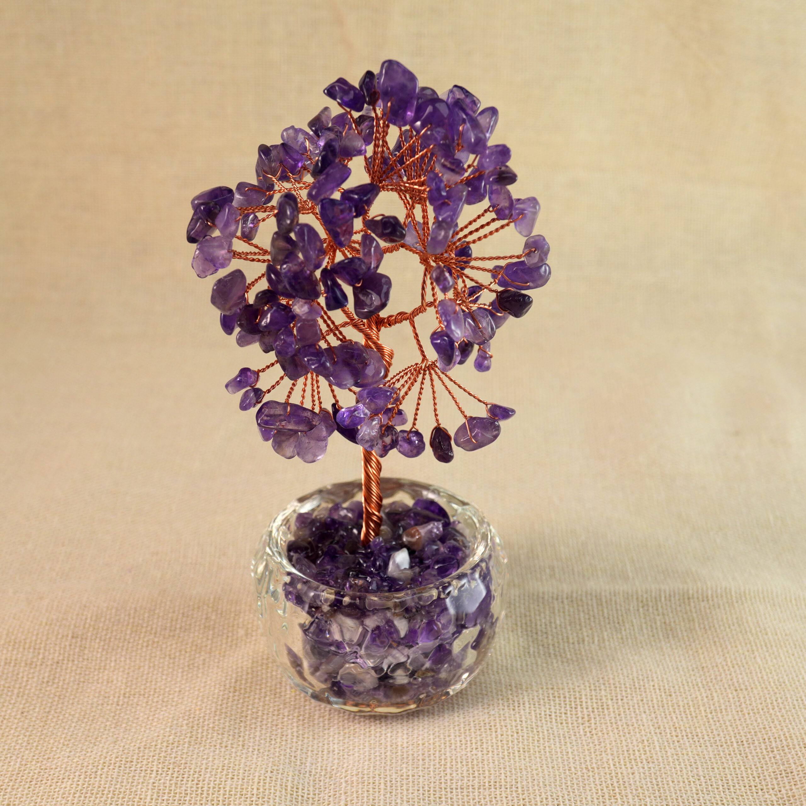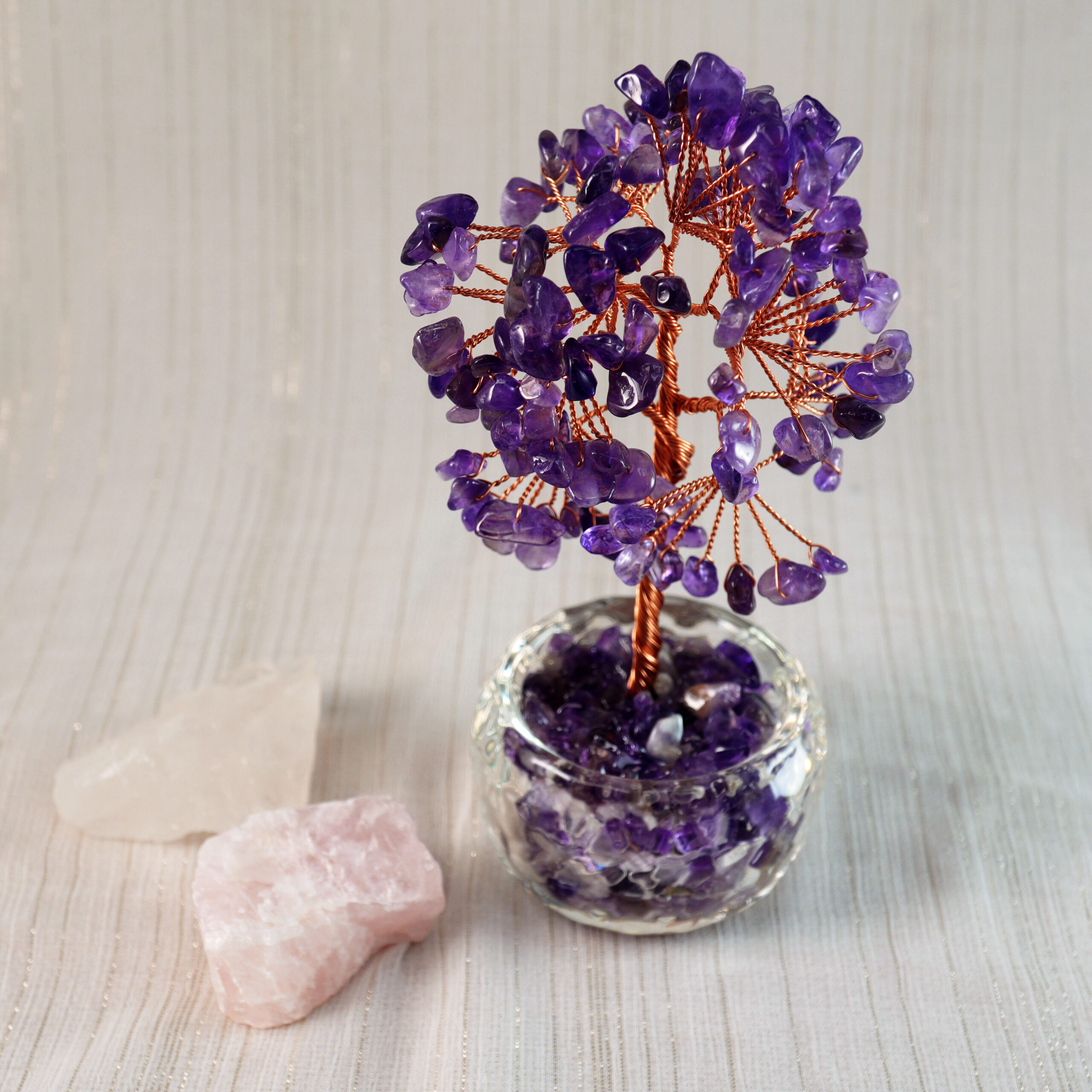 This natural amethyst money tree features polished amethyst crystals shaped like delicate leaves, arranged to resemble a minimalist money tree. Its soothing purple hues and clean design bring a calming, inspiring presence to any space, combining elegance with spiritual purpose.