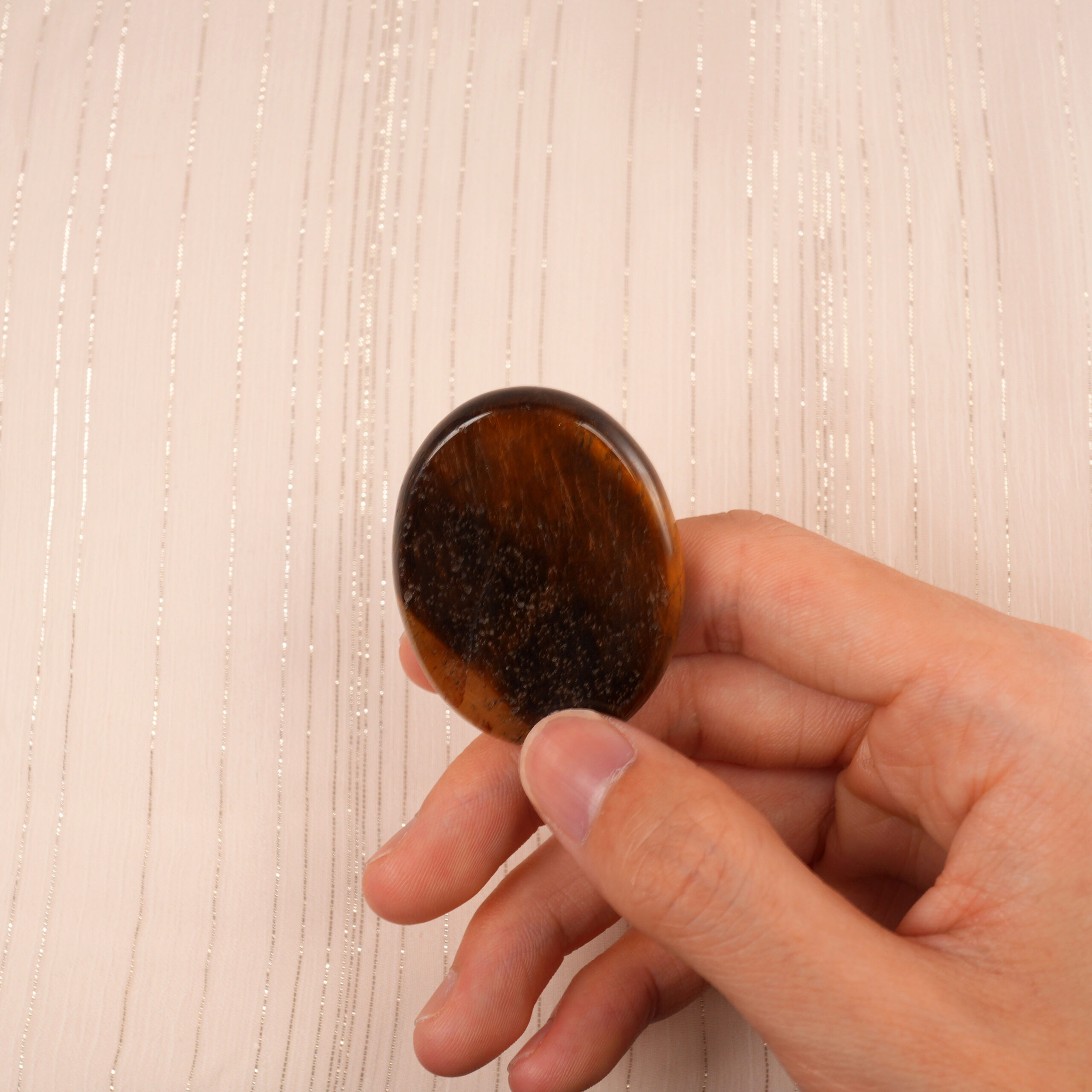 Polished from natural tiger eye, this touchstone carries grounding and confidence-boosting energy. Its shimmering golden-brown bands reflect inner strength and emotional resilience. Smooth and compact, it’s ideal for stress relief, meditation, or quiet reflection.