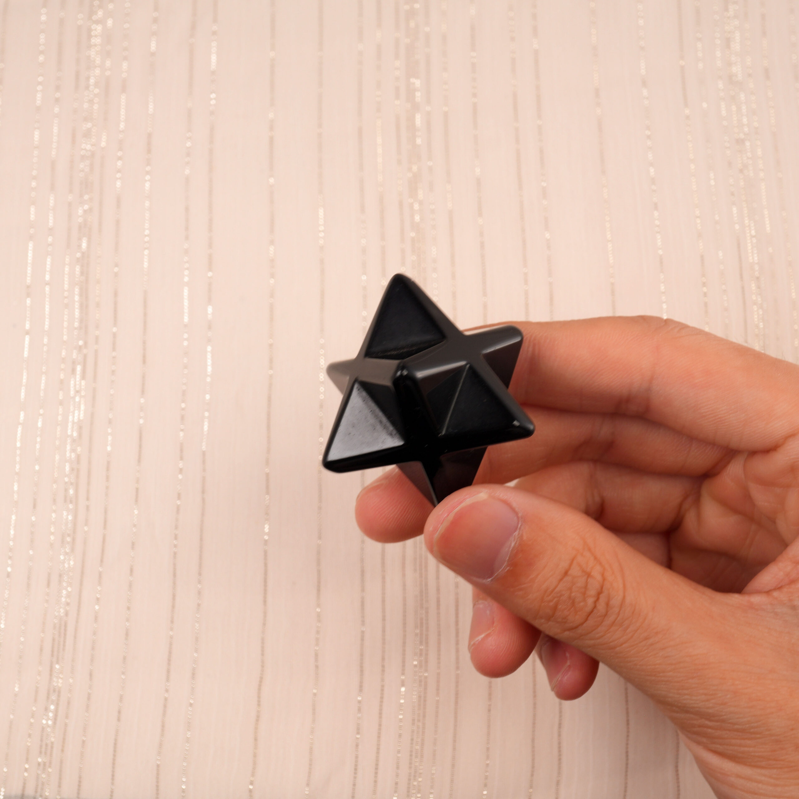 A carved black obsidian Merkaba crystal for powerful spiritual protection, grounding, and emotional clearing.