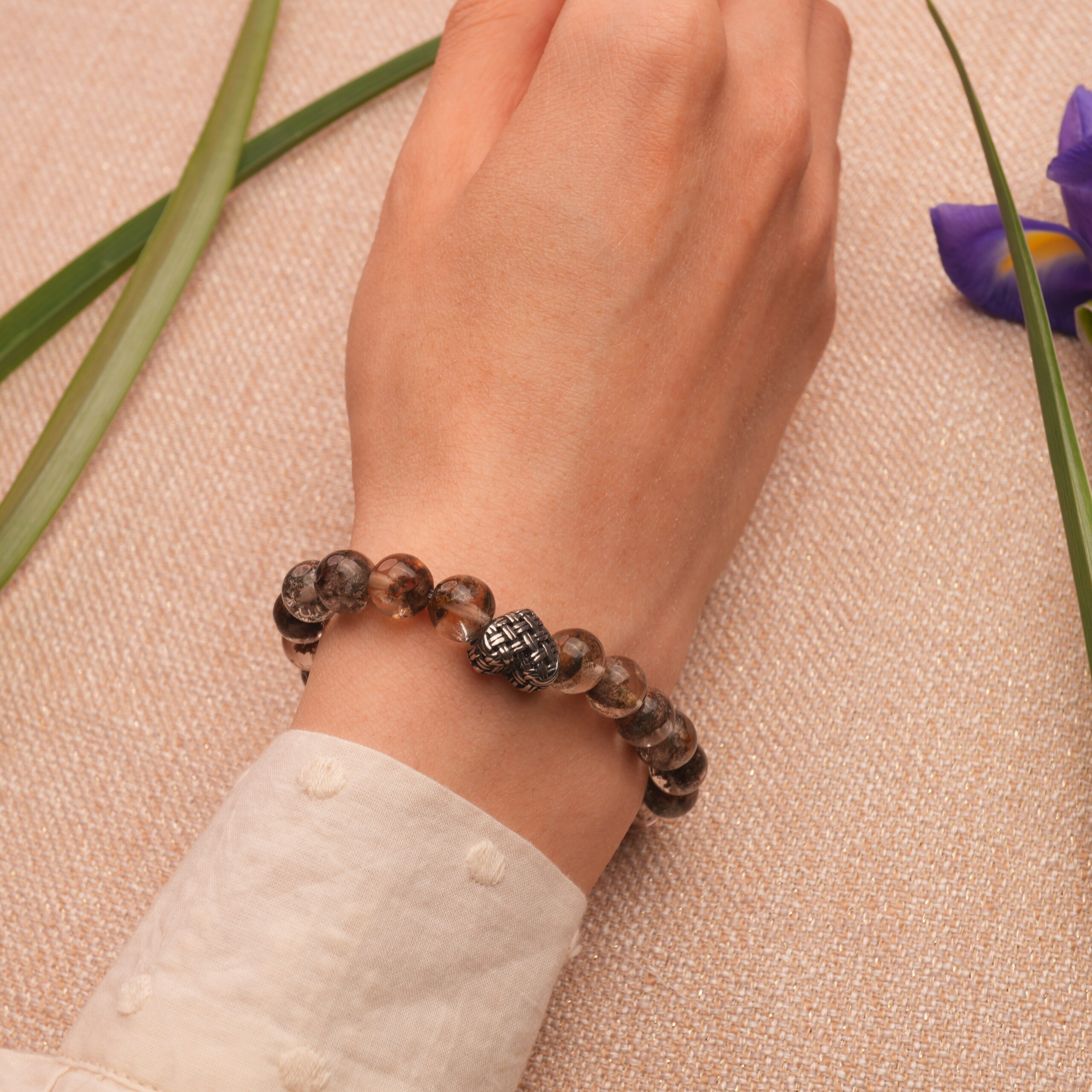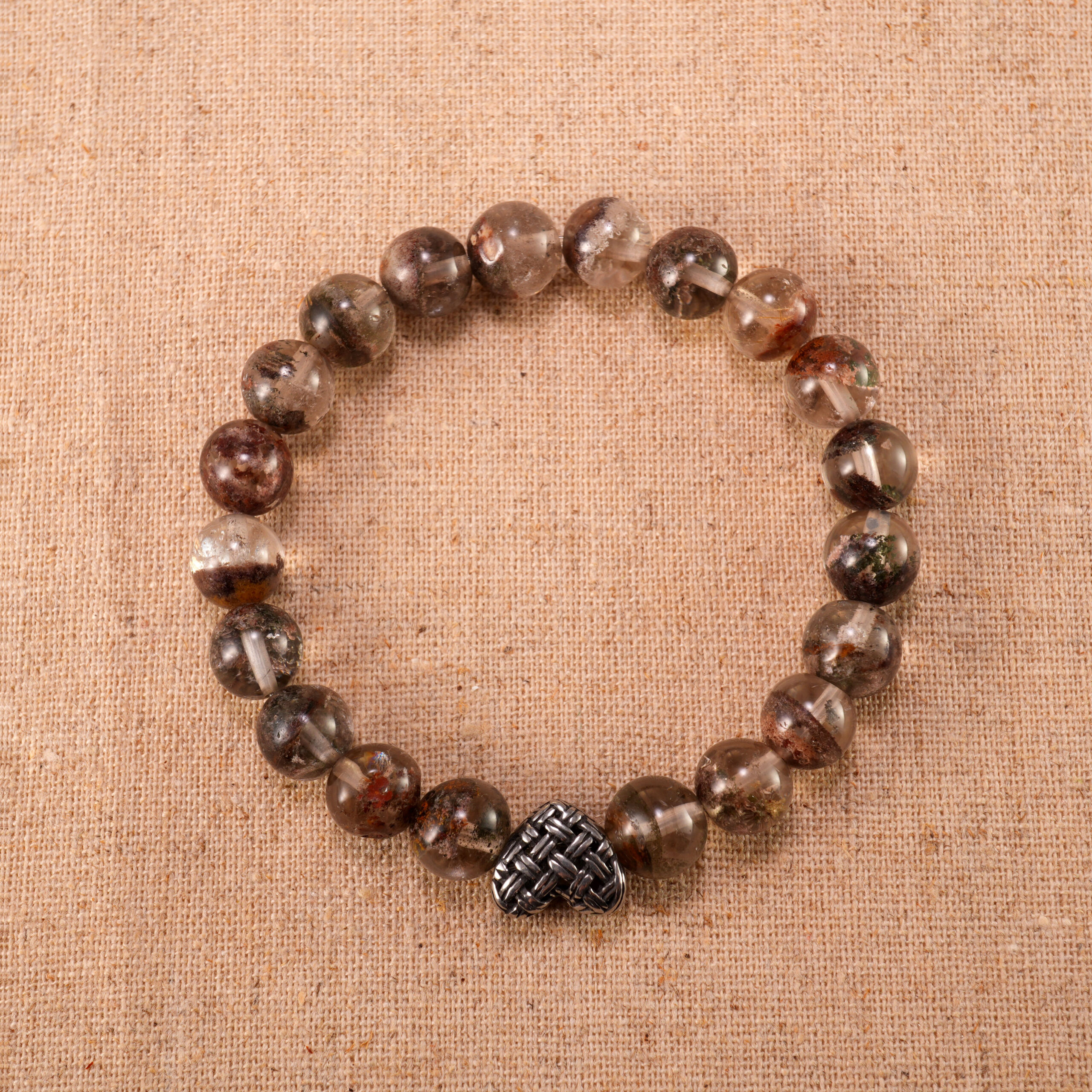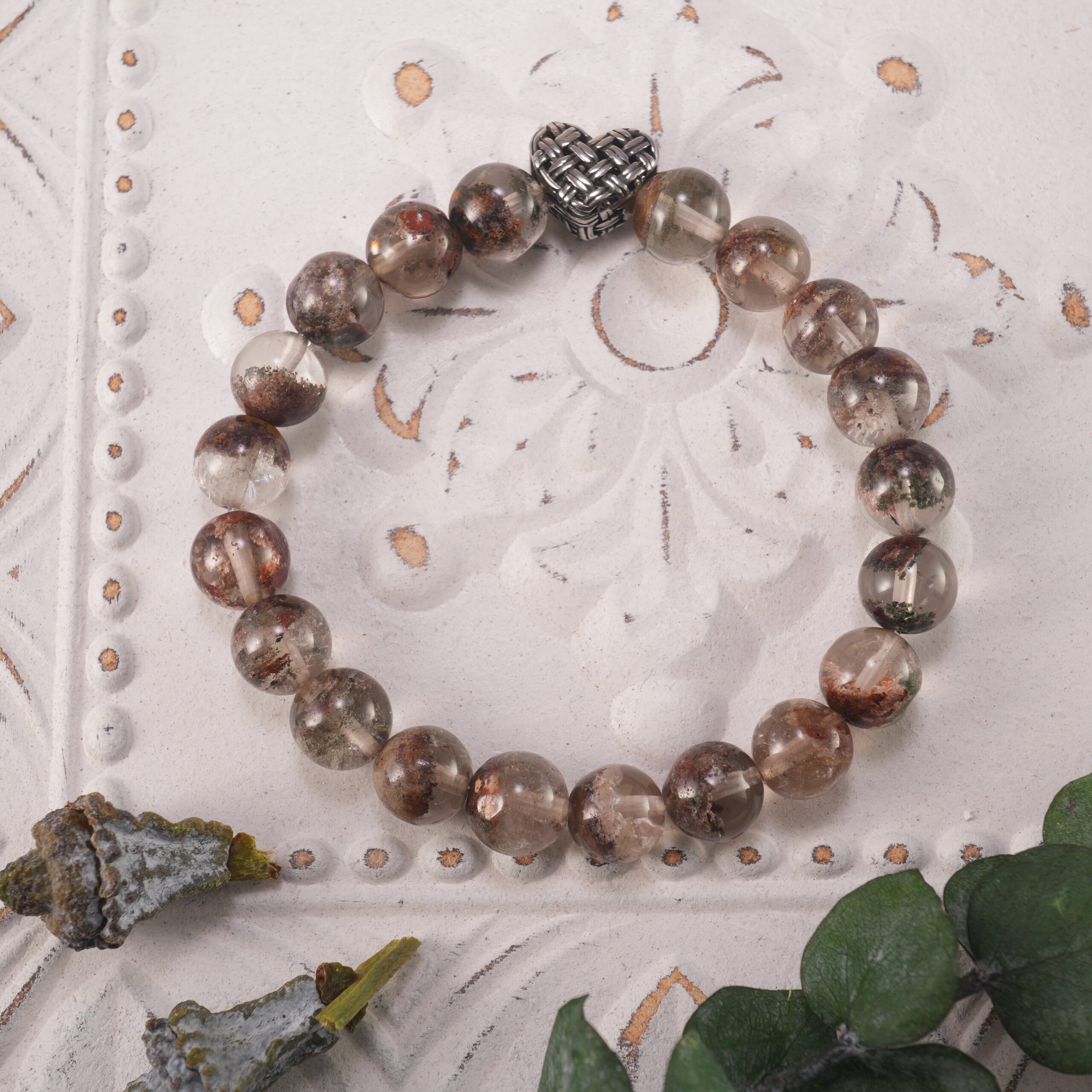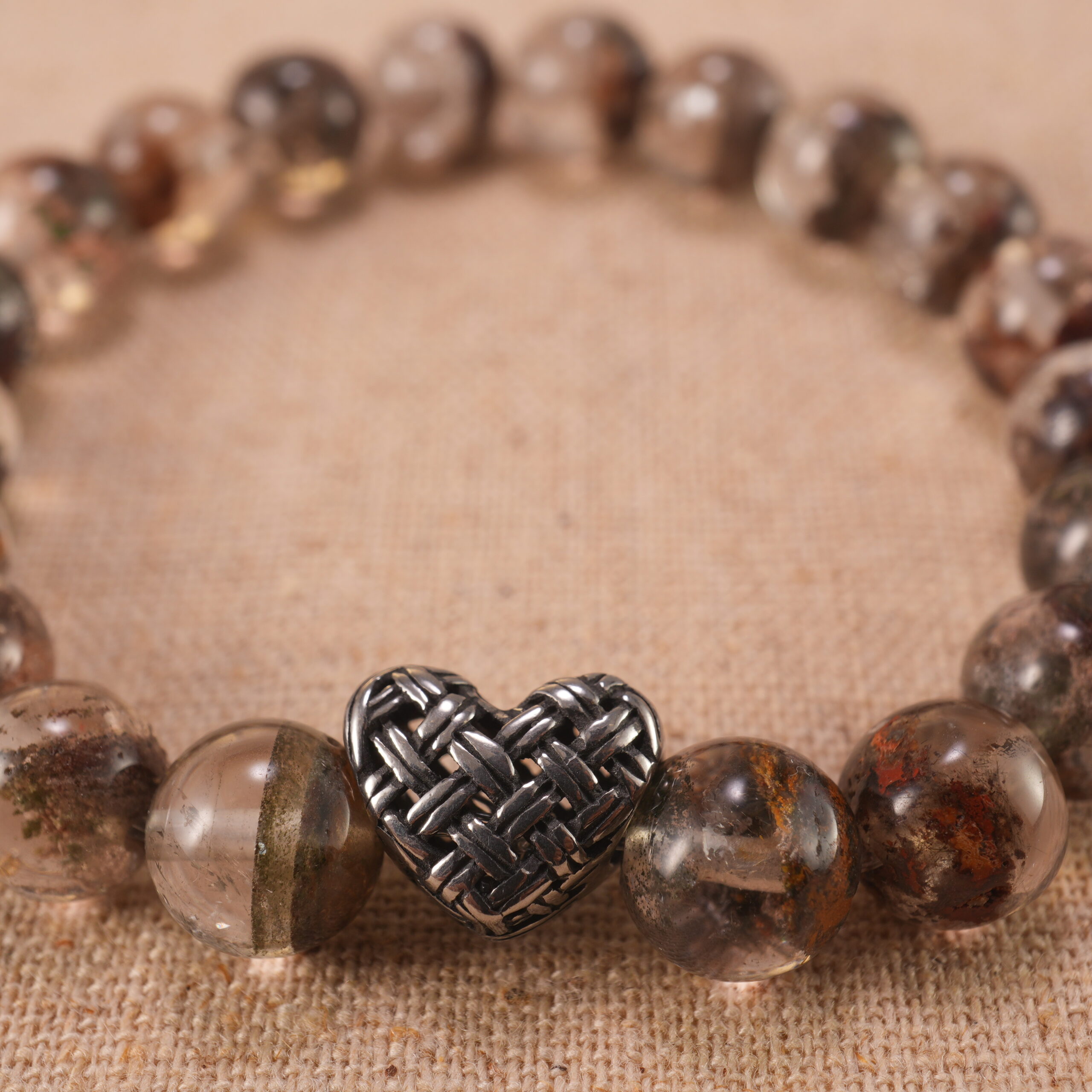 A handcrafted 8mm Phantom Quartz heart bracelet with S925 silver. Designed for emotional protection, clarity, and daily grounding. Elastic fit, available in S/M/L.