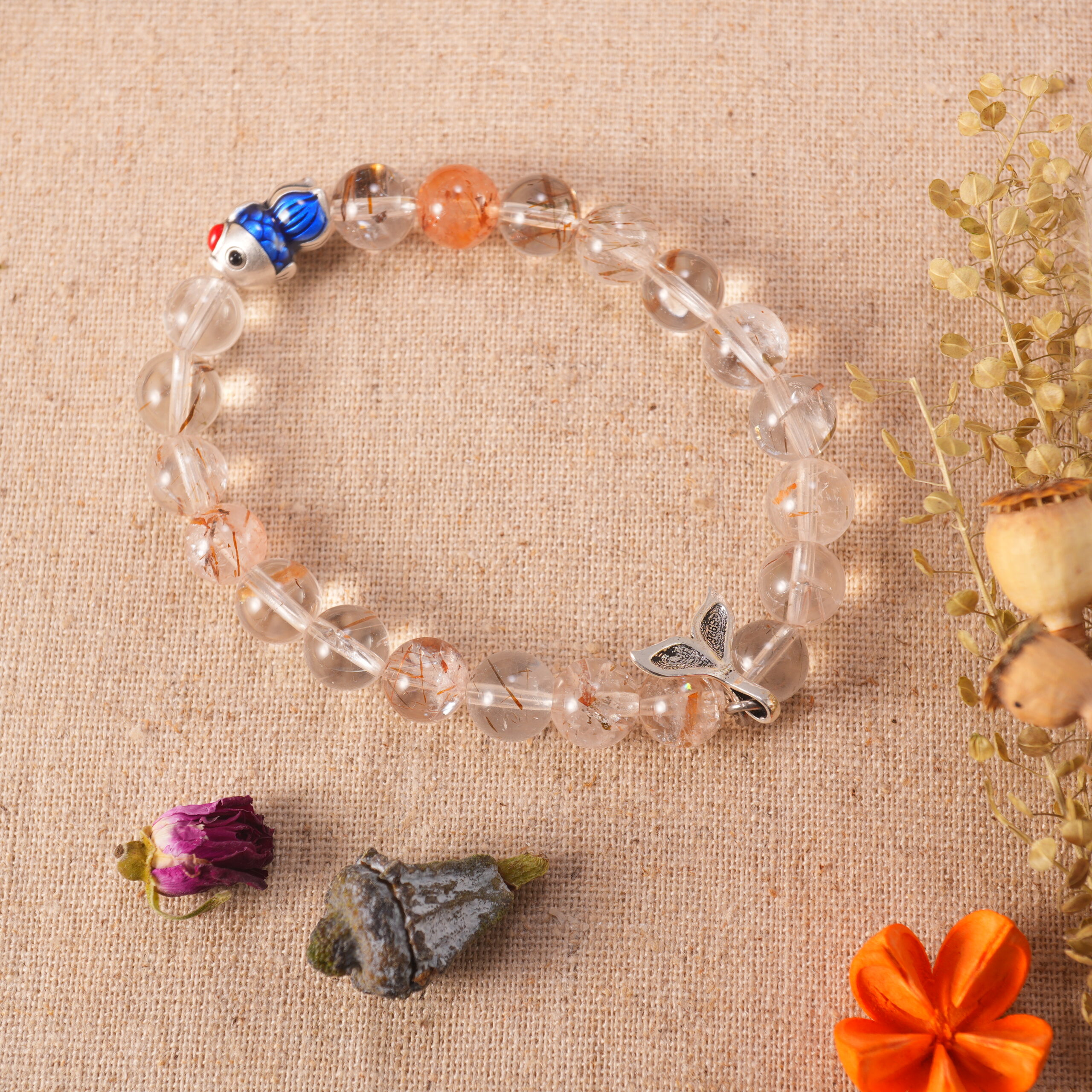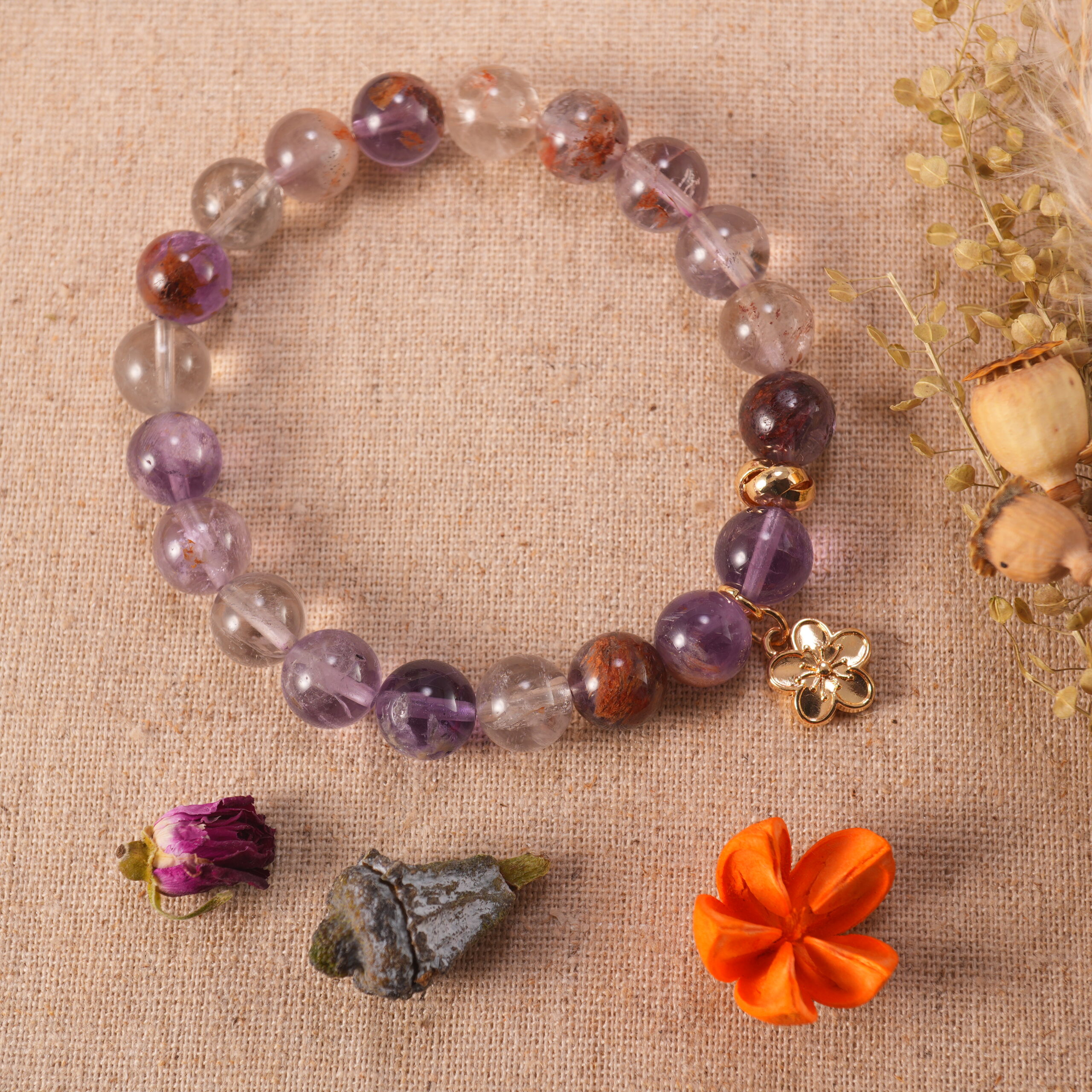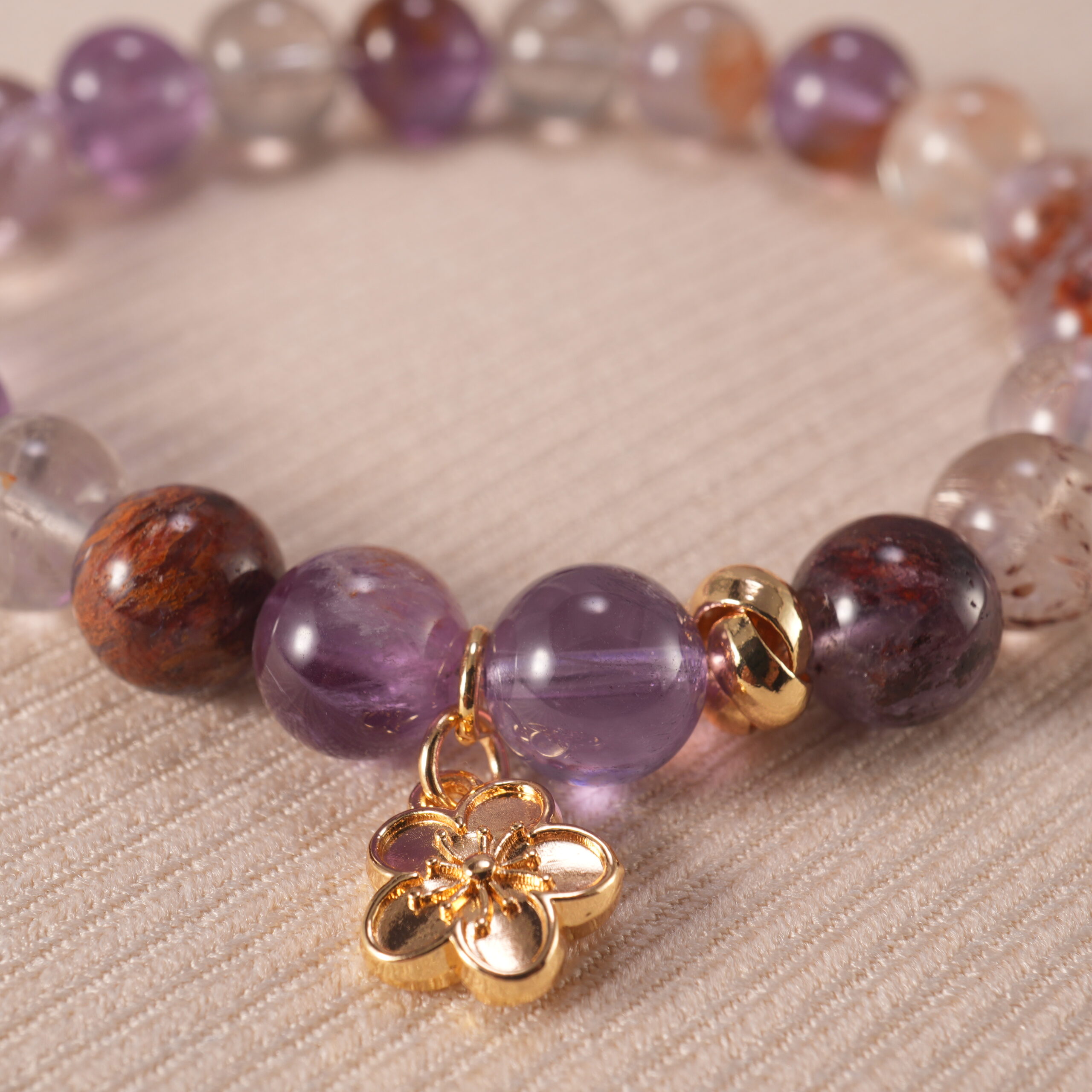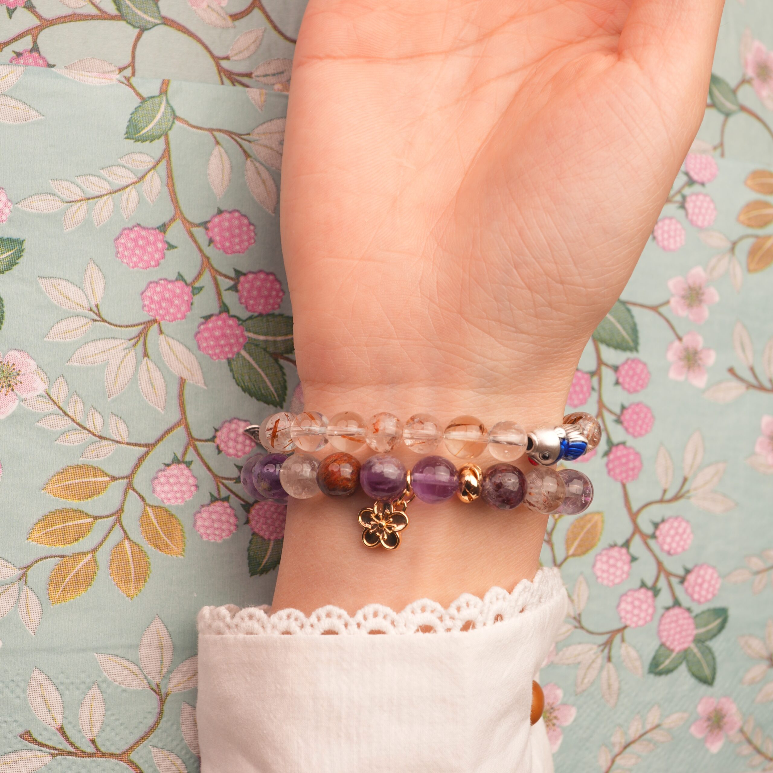 - Stacked bracelet set with rutilated quartz, purple phantom quartz, and a delicate flower charm