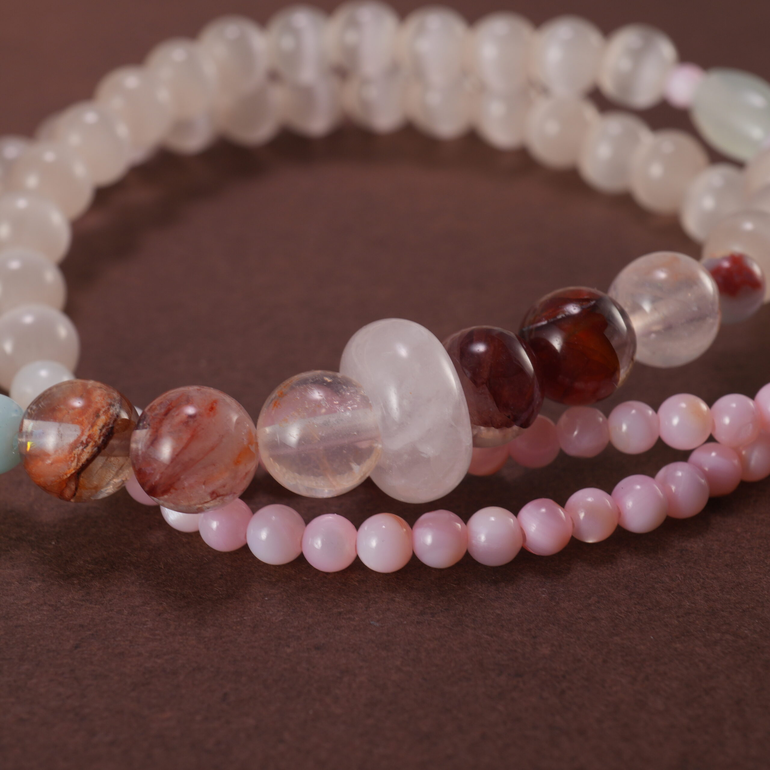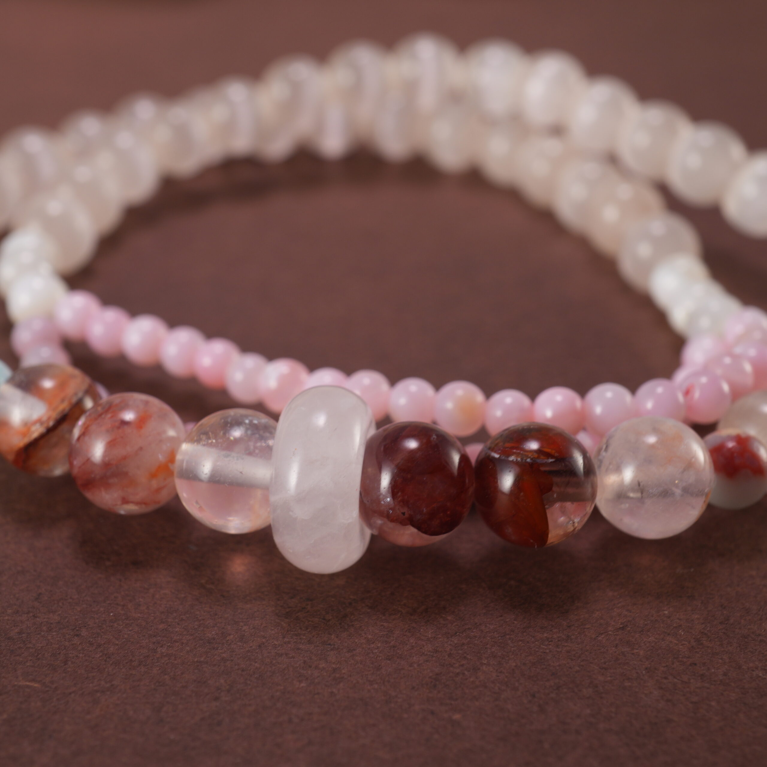 This double wrap bracelet blends the grounding power of red phantom quartz with the loving energy of rose quartz, offering deep heart healing, emotional clarity, and balanced energy flow.