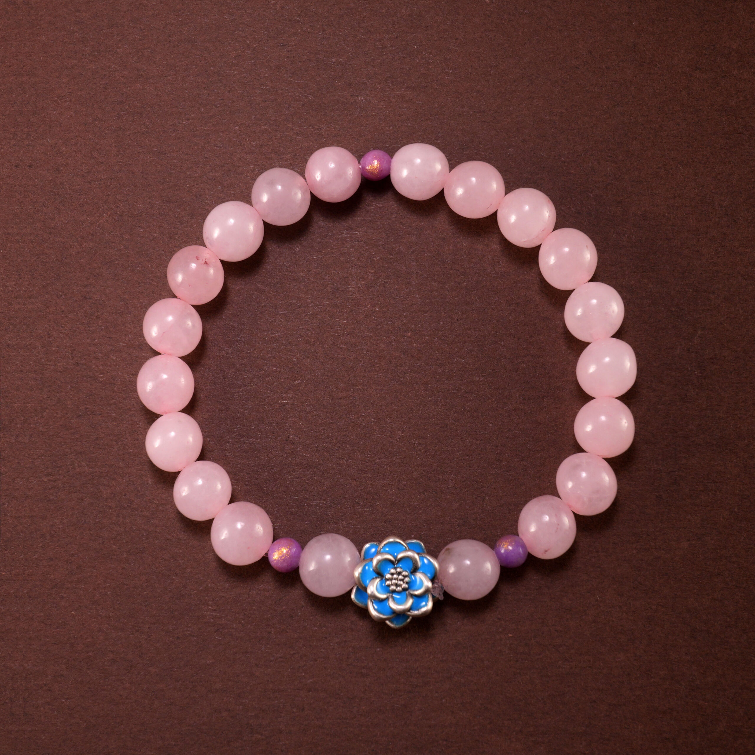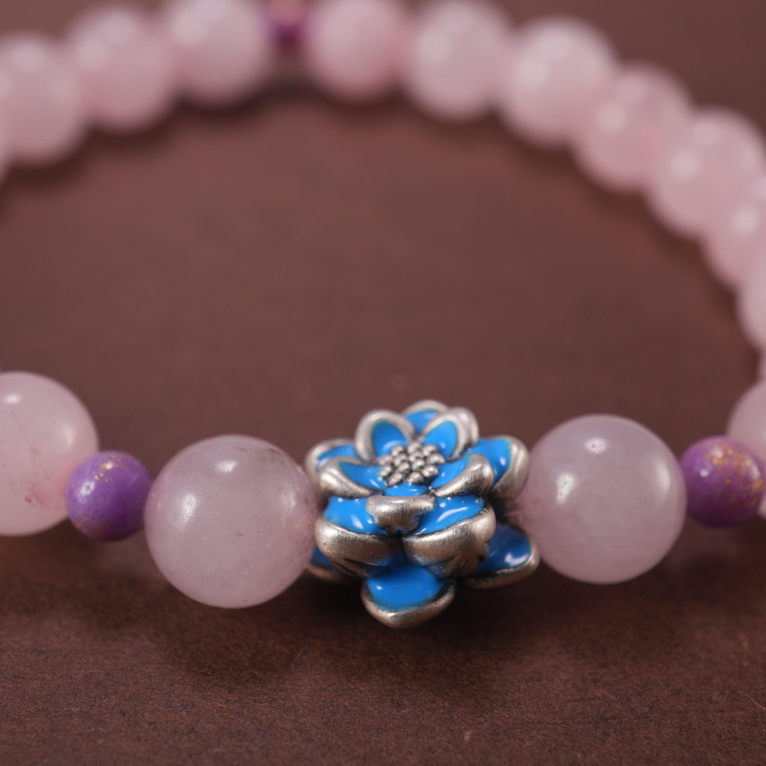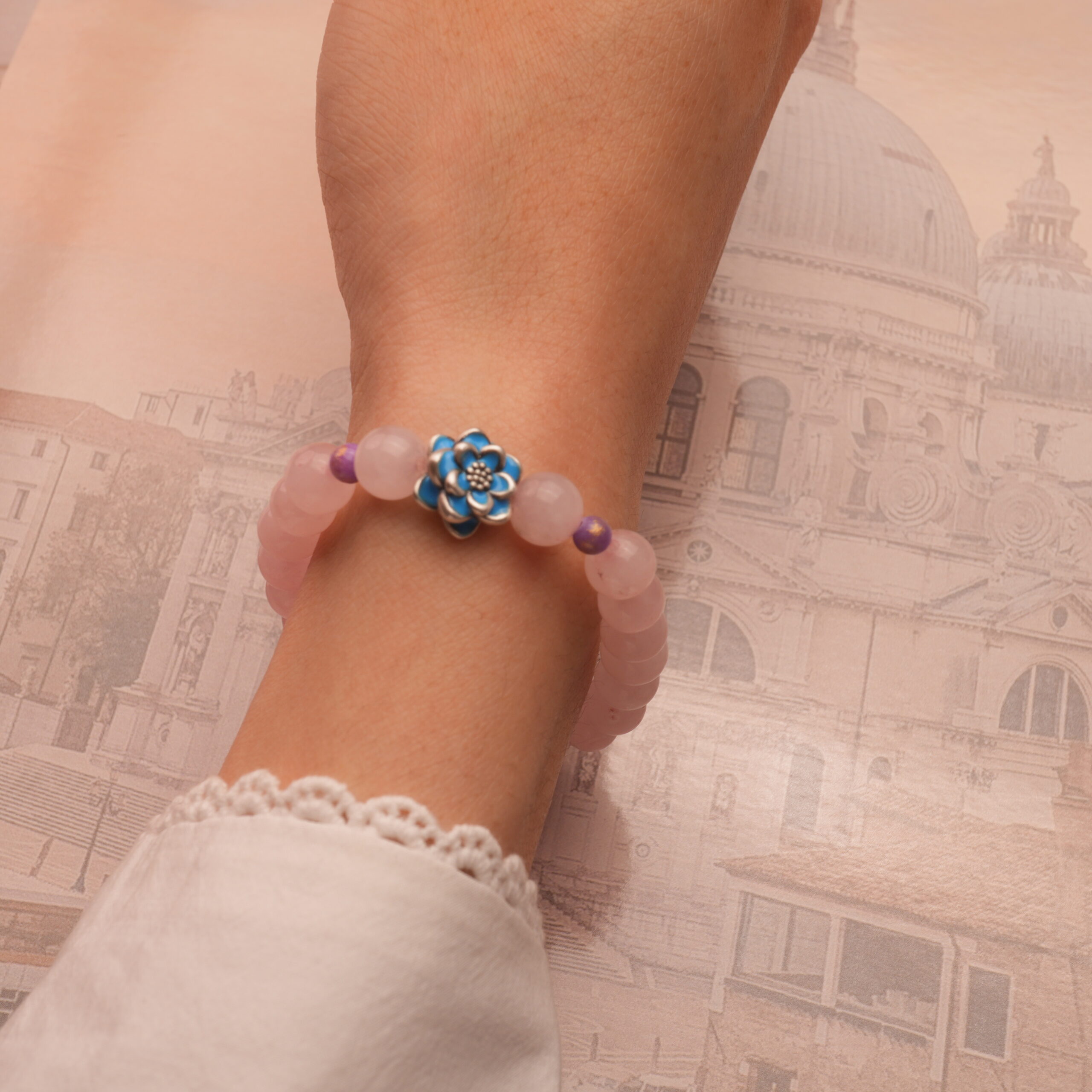 A soft and romantic bracelet made with rose quartz and purple chalcedony beads, adorned with a delicate flower charm. Promotes love, emotional clarity, and peaceful energy.