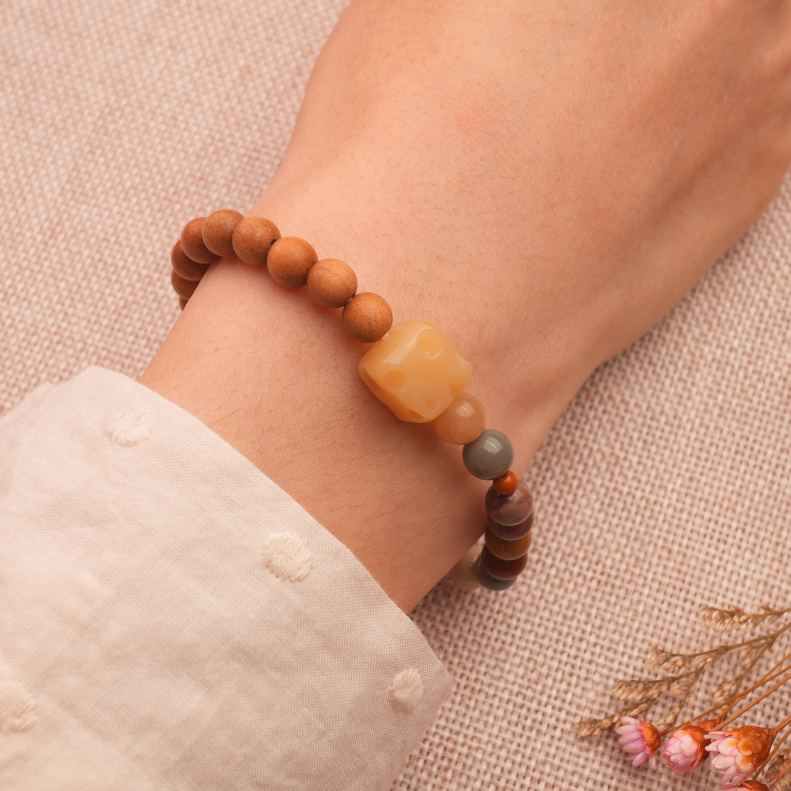 This handcrafted bracelet combines Alashan stone and sandalwood beads, designed to boost your energy and vitality. The earthy tones and natural materials create a simple, minimalist design that fits your everyday style while promoting balance and well-being.