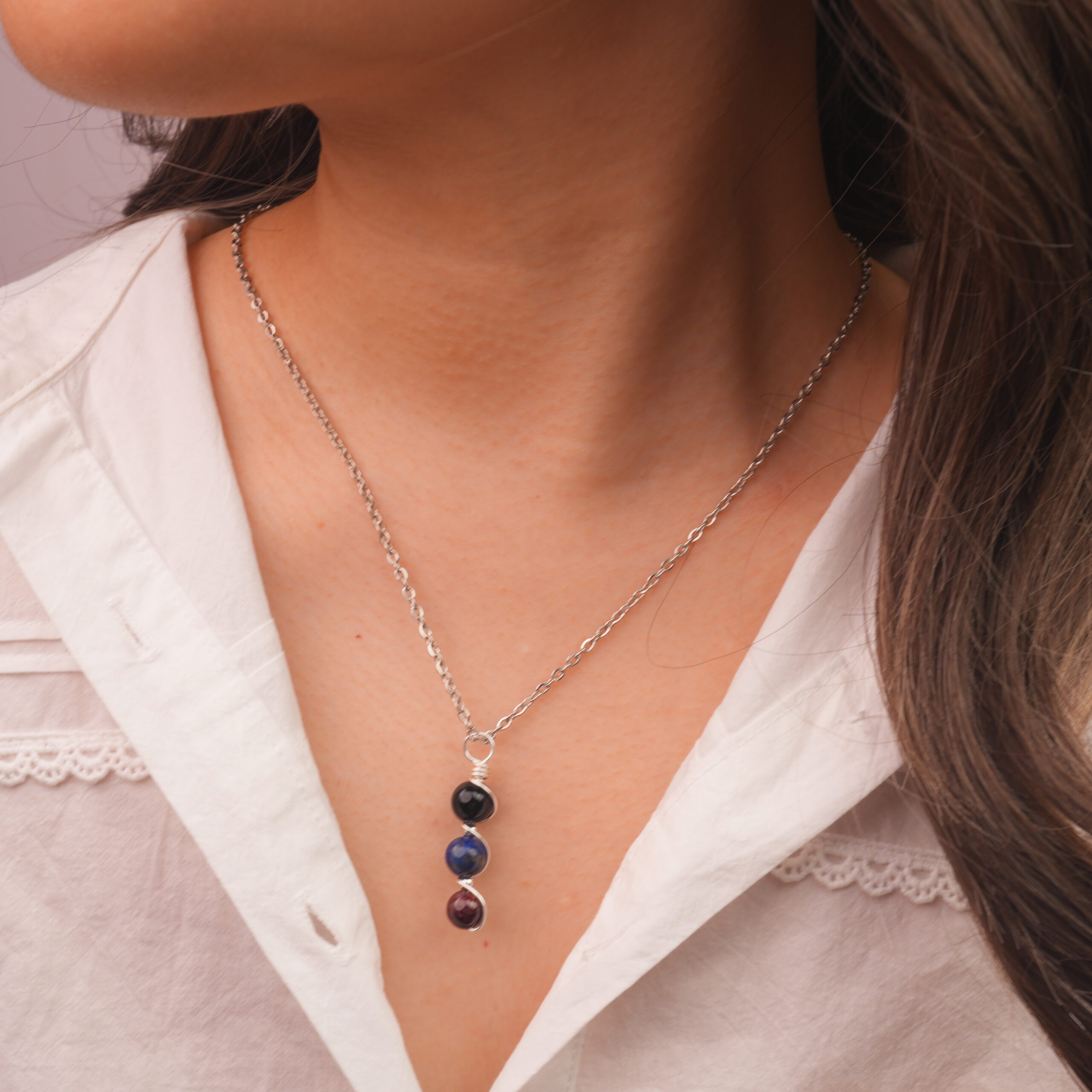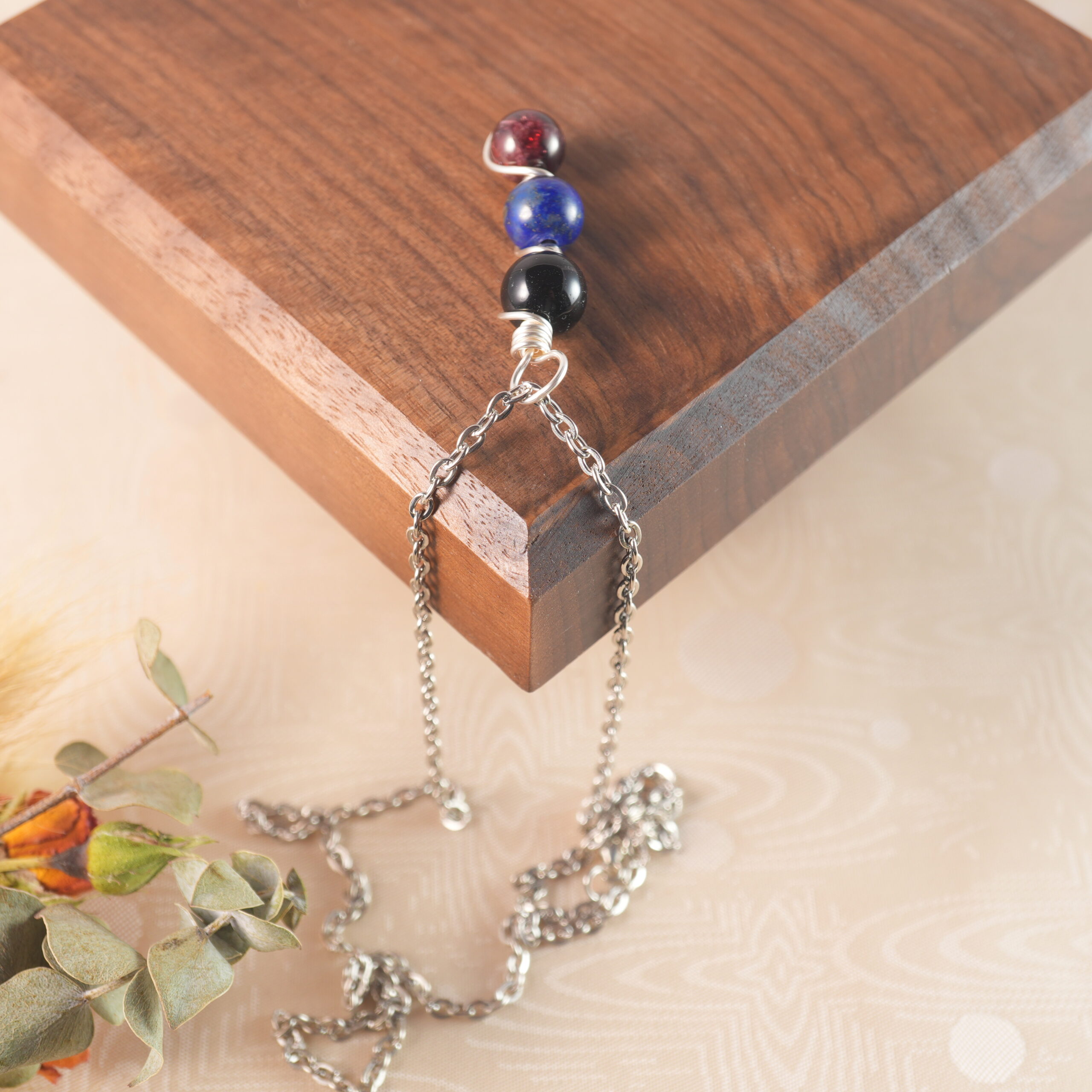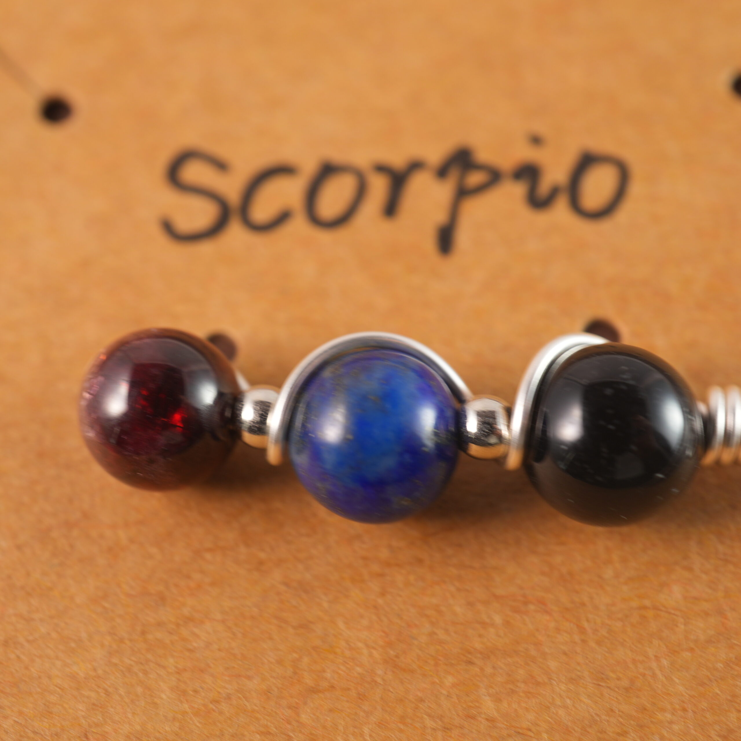 Scorpio Zodiac Necklace featuring Obsidian, Lapis Lazuli, and Garnet, blending protection, wisdom, passion, focus, and mystery. Crafted to support Scorpio’s intensity, intuition, and emotional depth. A powerful birthstone gift for transformation, strength, and inner truth.