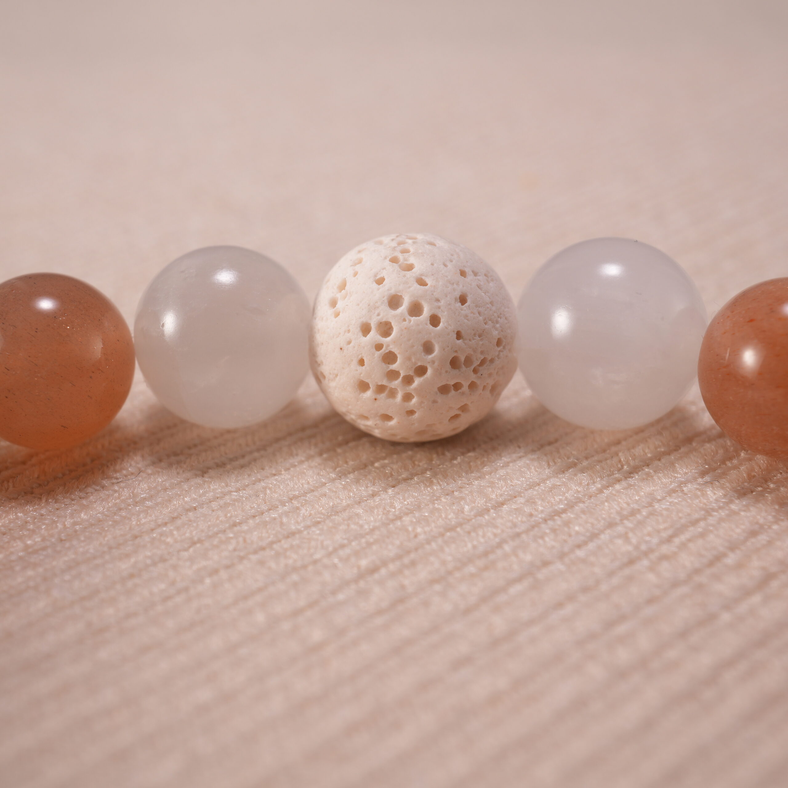 A calming crystal diffuser bracelet with peach moonstone, white chalcedony, and grounding lava stone—made to support restful sleep and emotional balance.