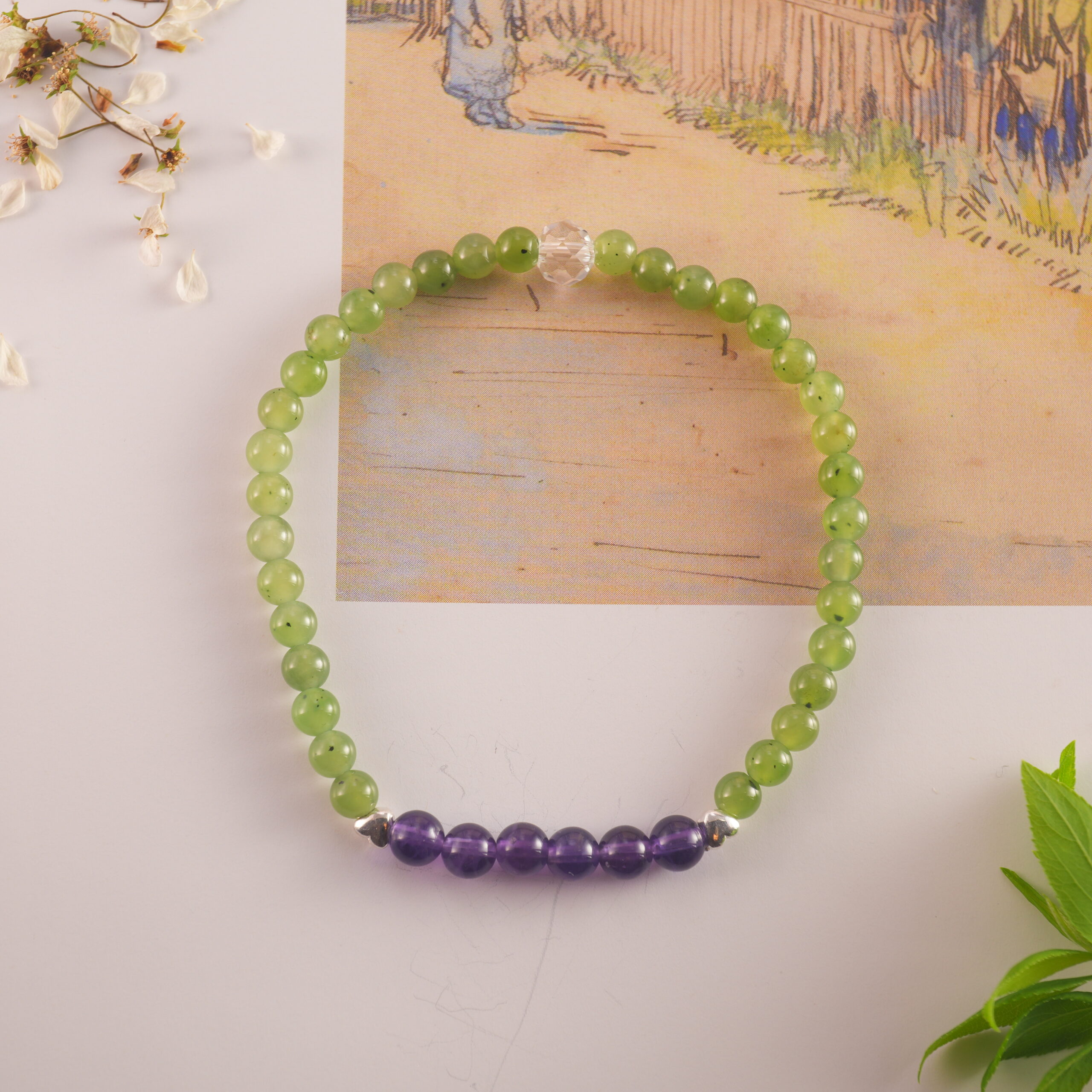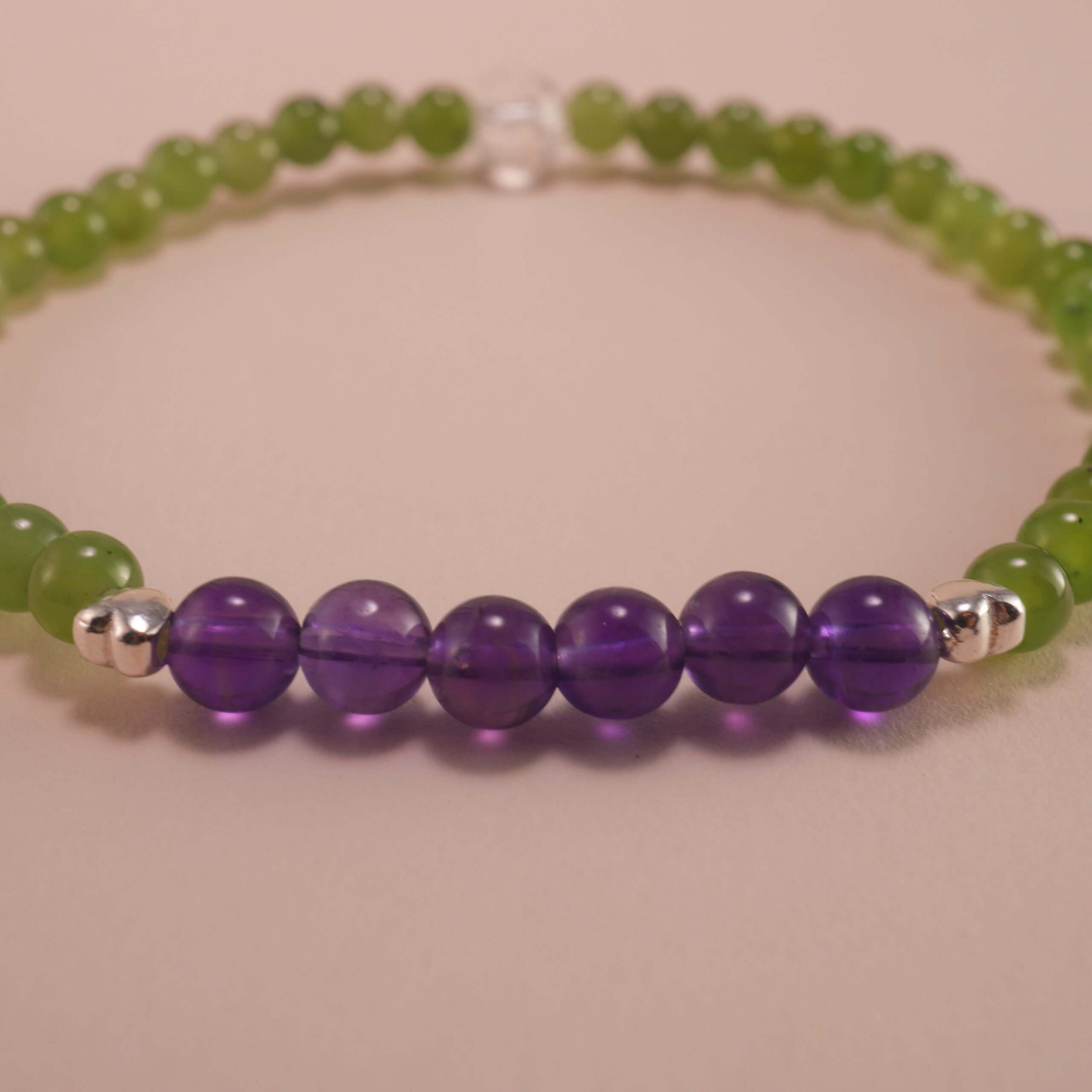 Green Chalcedony, Amethyst & Strawberry Quartz Stacked Bracelet Set