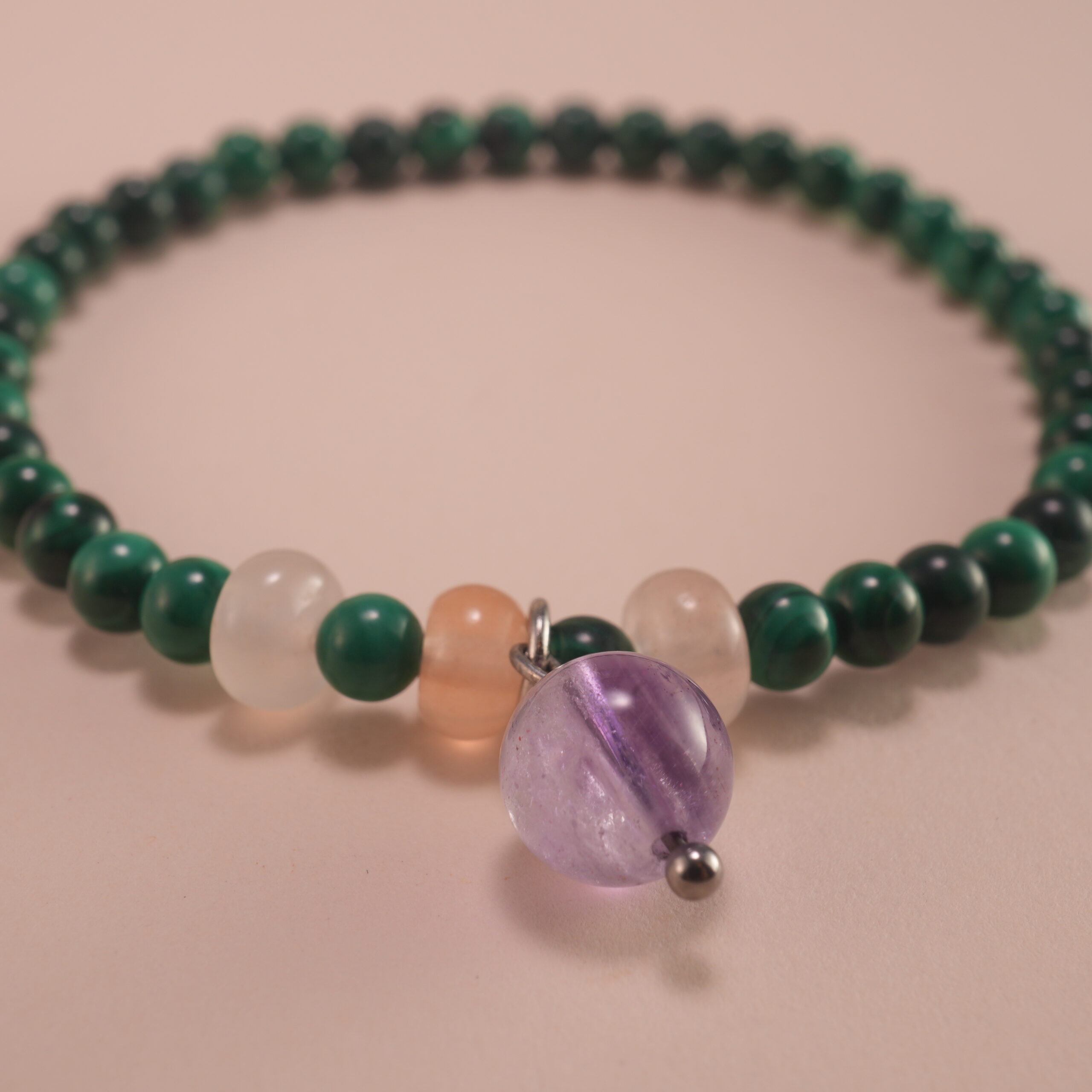 Flower Agate, Malachite & Amethyst Stacked Bracelets – for Sleep & Good Luck
