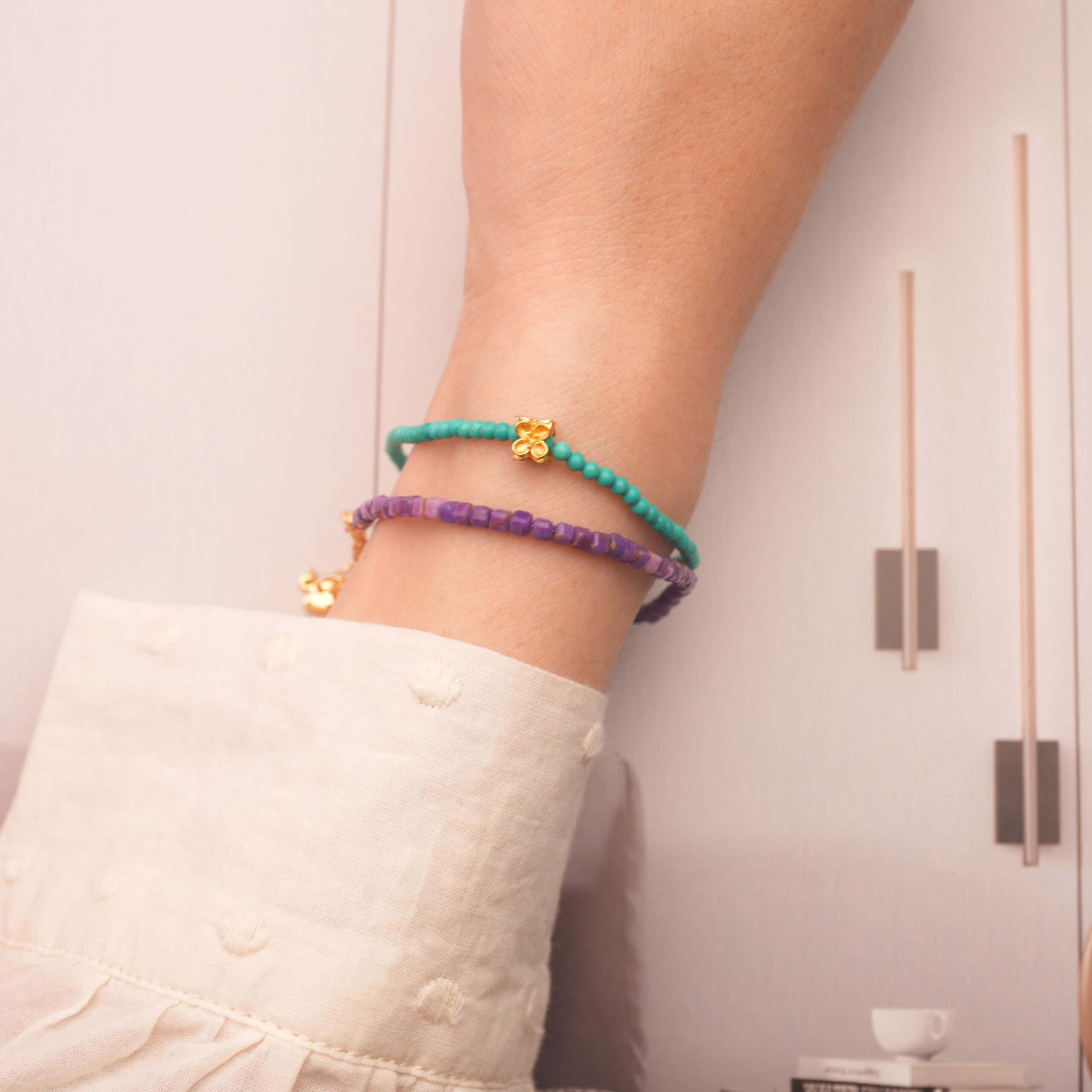 - Wear both bracelets stacked for a balanced look and synergistic energy